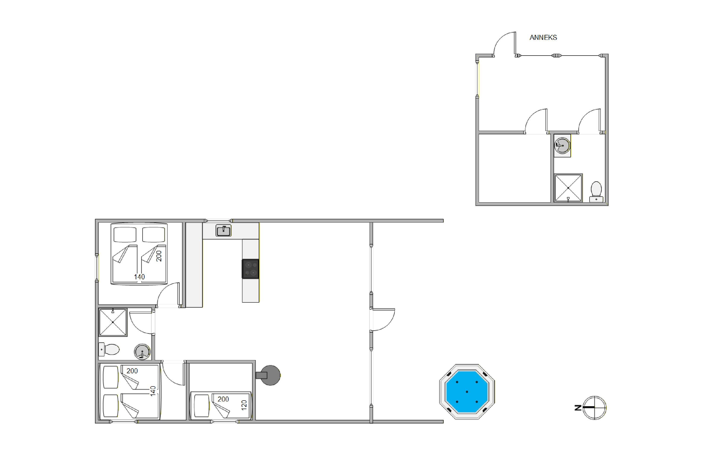 Når dagen går på hæld, venter 5 hyggelige sovepladser fordelt på 3 soverum med 2 dobbeltsenge (140x200) og 1 enkeltseng (120x200) – ideelt til både familie og venner, der ønsker komfort og en god nats søvn.