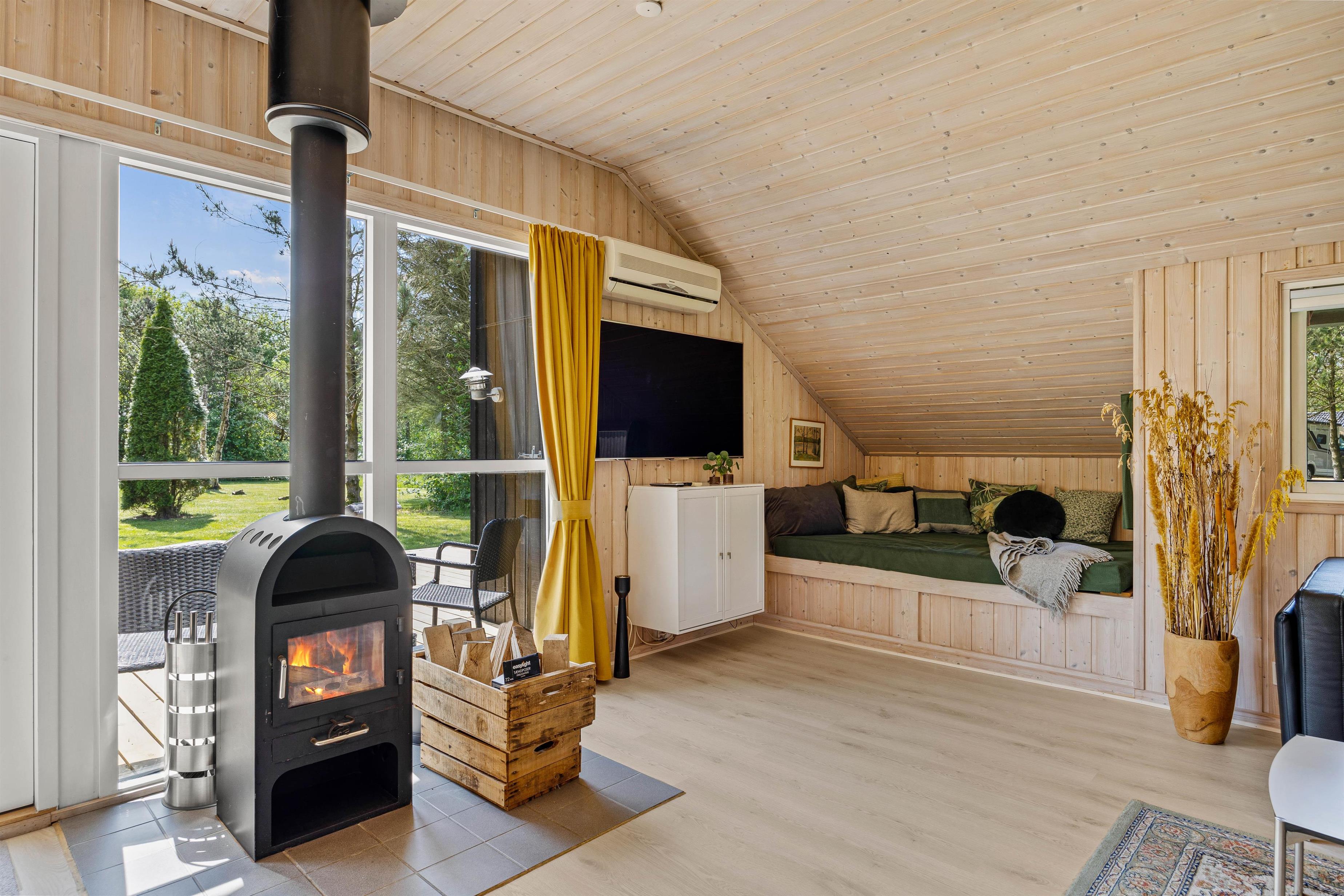 Både den energibesparende varmepumpe og brændeovnen sørger for hyggelige temperaturer. På køligere dage er brændeovnen bestemt favoritten, for hvad kan være mere hyggeligt end at sidde komfortabelt ved den knitrende ild med en kop friskbrygget kaffe eller te og begrave sig i en god bog? Endelig tid til at glemme omgivelserne og bare fordybe sig. Især det hyggelige hjørne i stuen inviterer dig til at tage en lille lur.