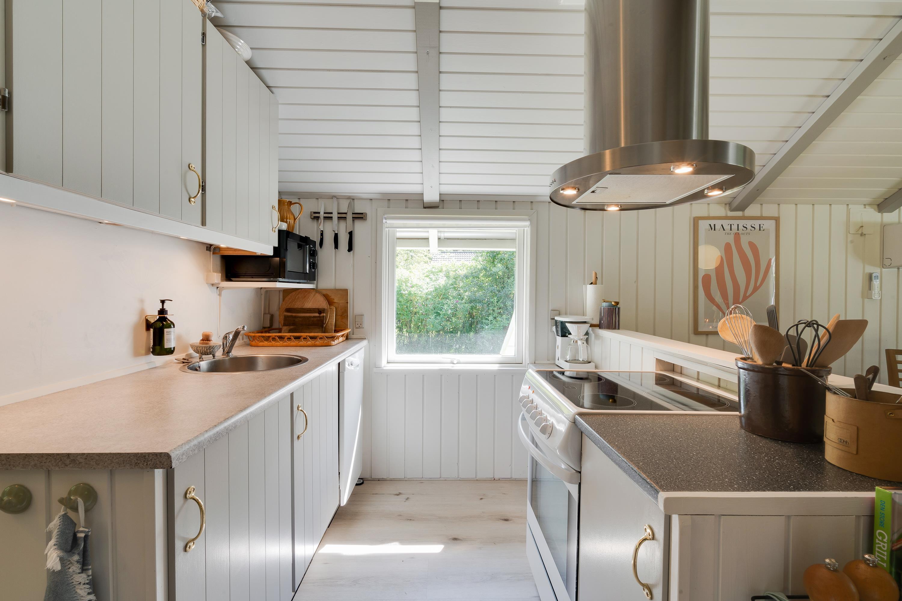 Sommerhuset tilbyder flere sovepladser, fordelt på 2 soveværelser og 1 hyggelig alkove i stuen. Det lille, men funktionelle badeværelse er udstyret med vaskemaskine, hvilket gør det praktisk til længere ophold.