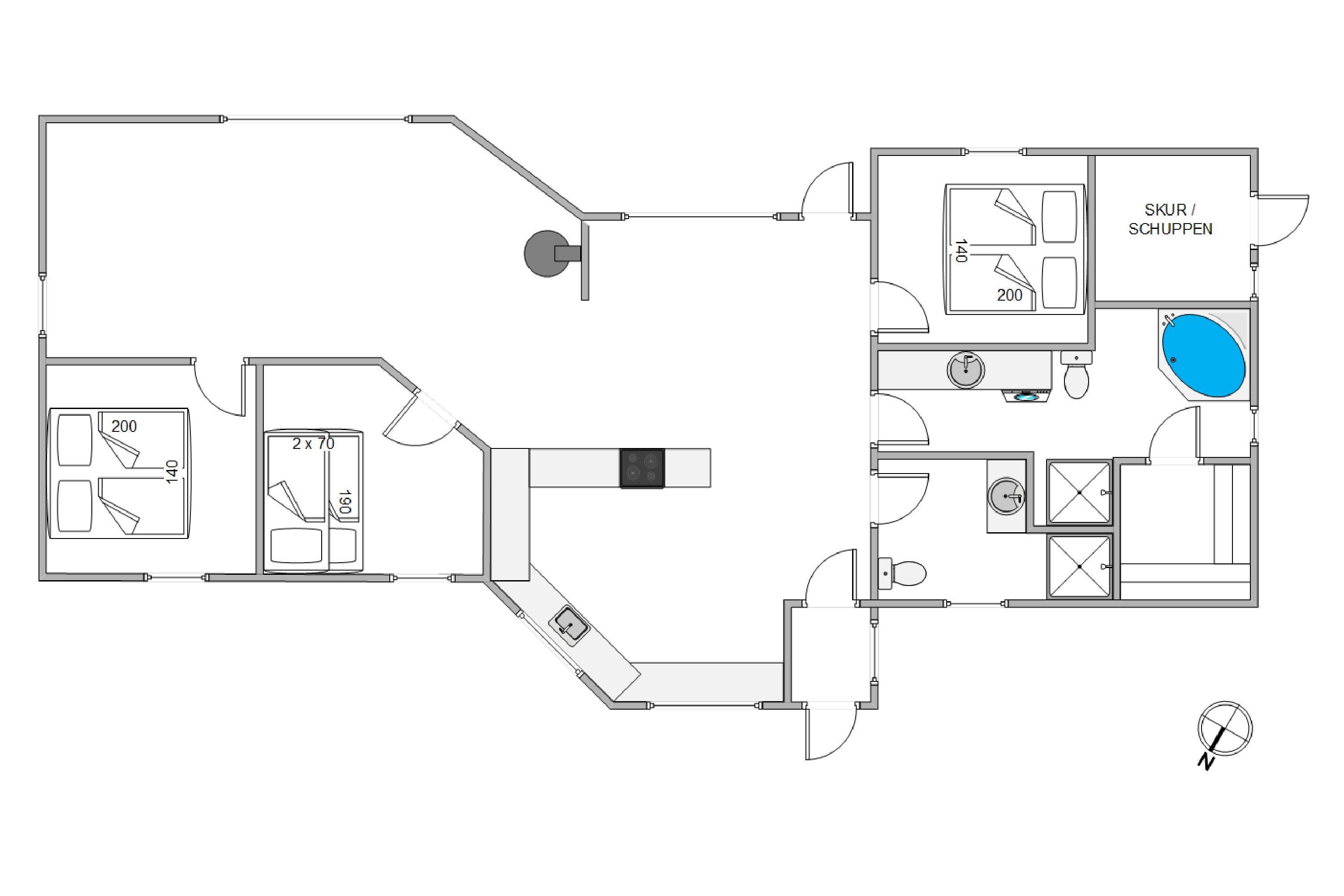 Sommerhuset er stort nok til at rumme op til 6 personer og 2 hunde, hvilket gør det ideelt til en familie eller grupper af venner. 2 af de 3 soveværelser er udstyret med dobbeltsenge, hvilket sikrer en god nattesøvn hver nat. Det sidste soveværelse har en køjeseng, som de yngste feriegæster vil elske. De 2 badeværelser er yderst praktiske, især hvis I er 6 personer afsted. Den hyggelige brændeovn i stuen skaber en varm atmosfære, mens den energibesparende luft-til-luft varmepumpe, sikrer en behagelig temperatur og god luftcirkulation året rundt.