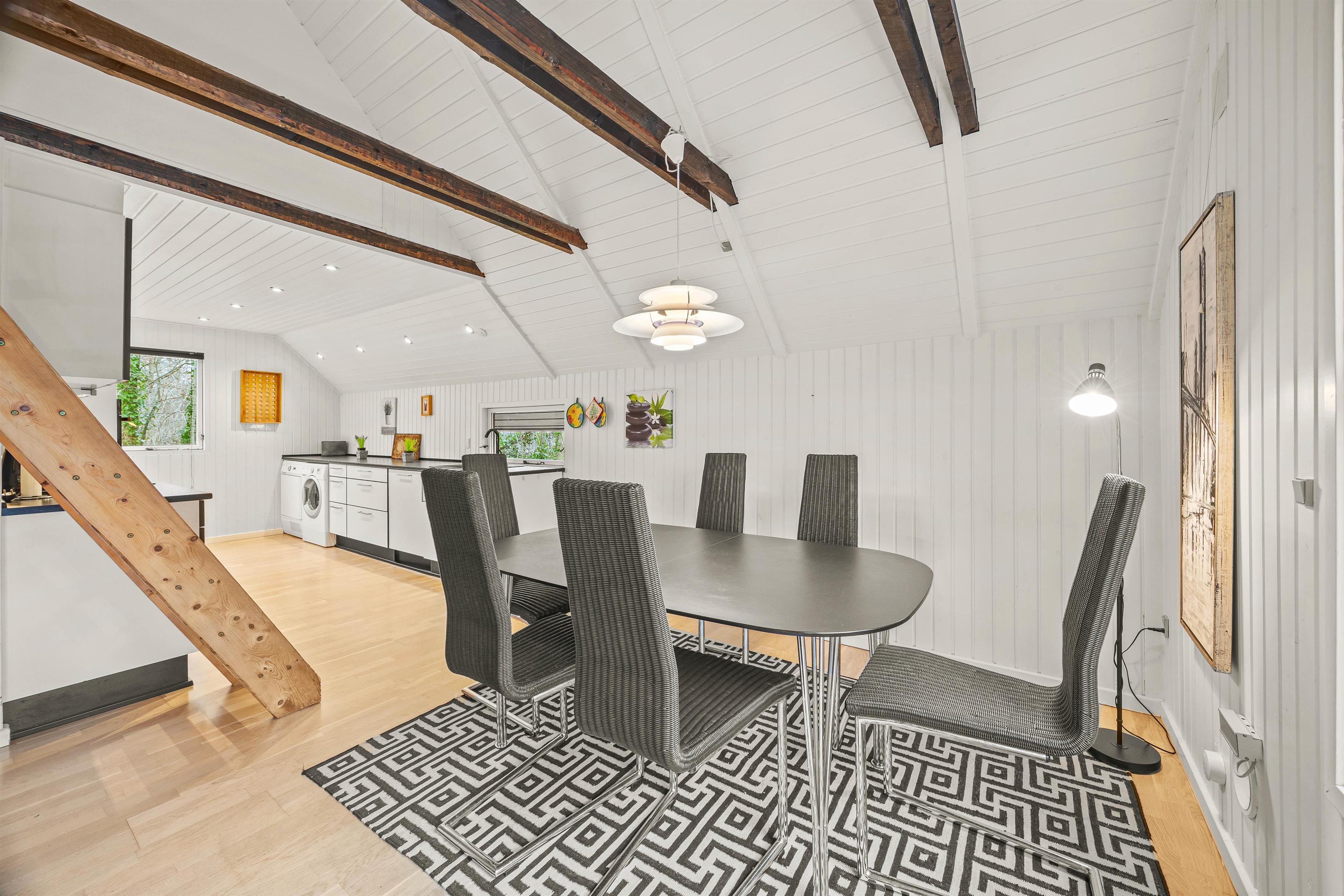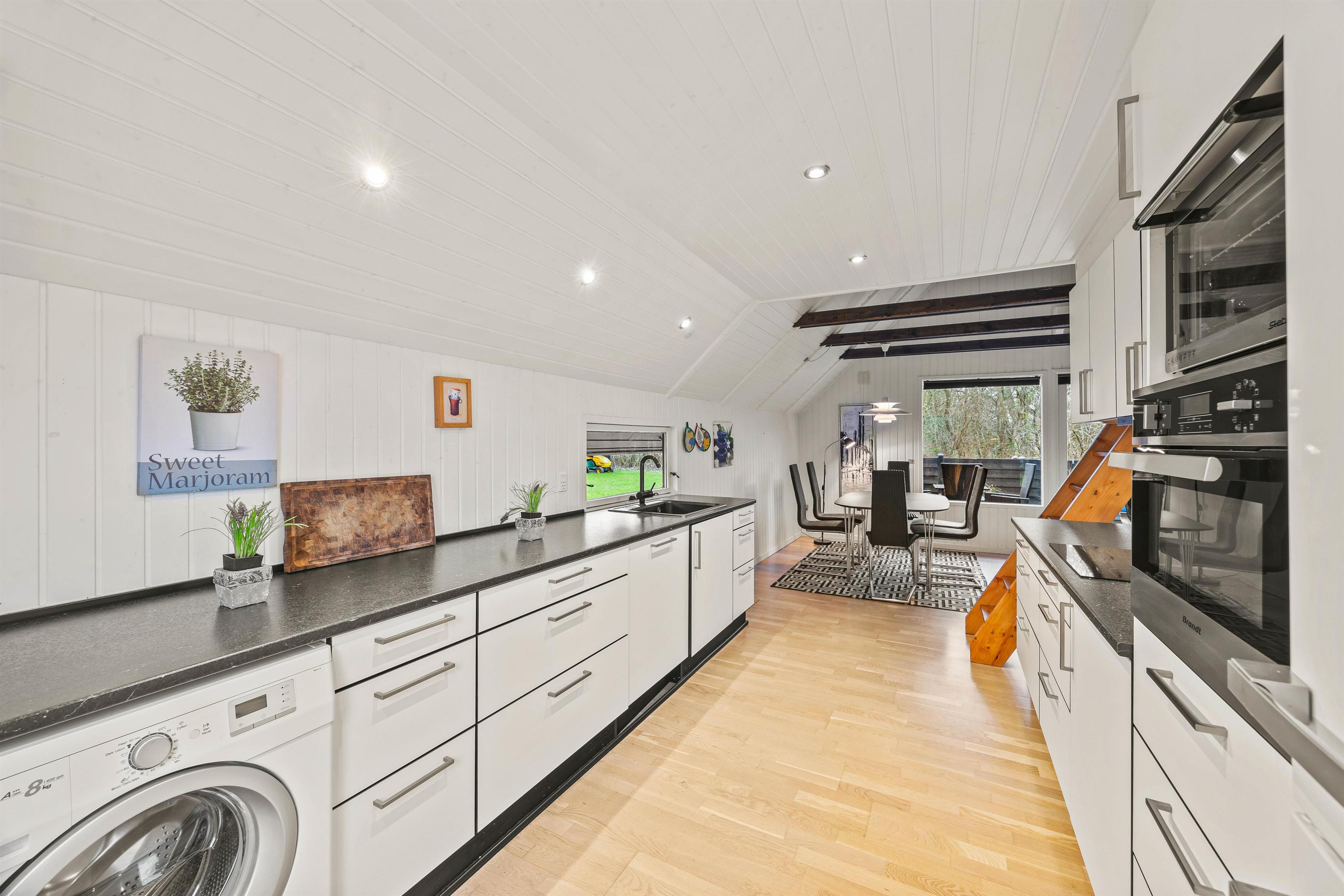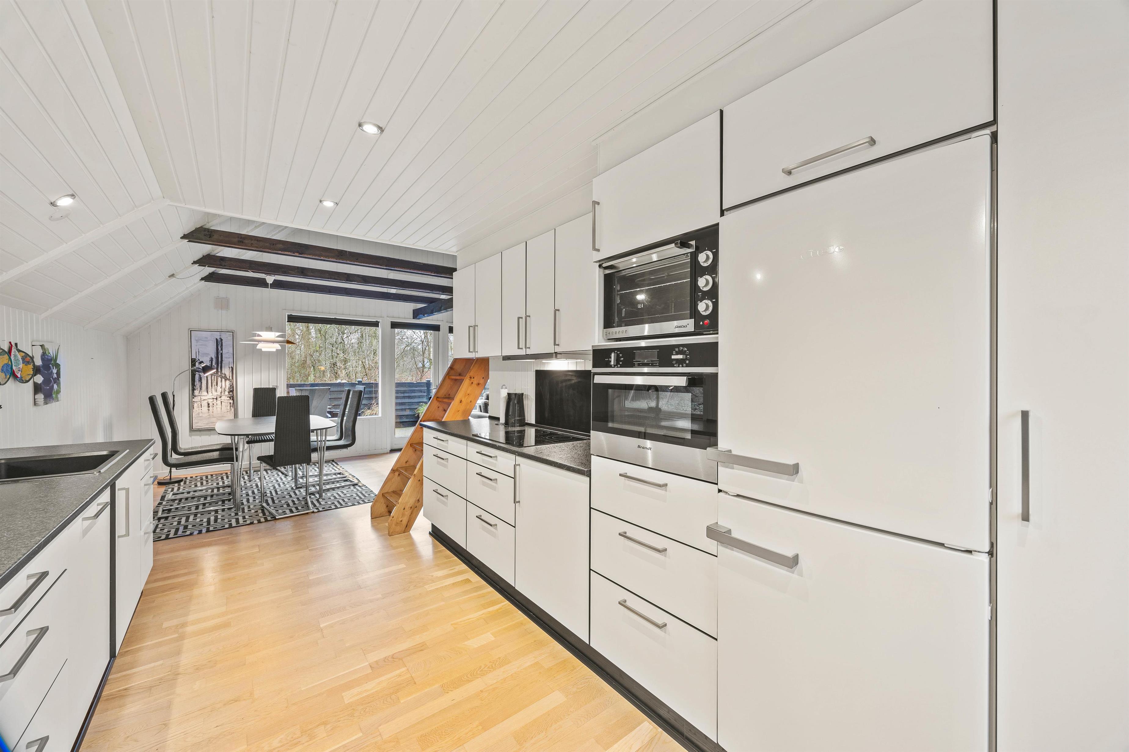 I feriehusets opholdsrum vil I føle jer tilpas. Her er der skabt ferierammer med et stort køkken, træværk og trælaminatgulv. Sofaen er stor nok til, at alle 4 kan finde en bekvem plads, og lokker til at dase i timevis foran brændeovnen eller med en god film.
