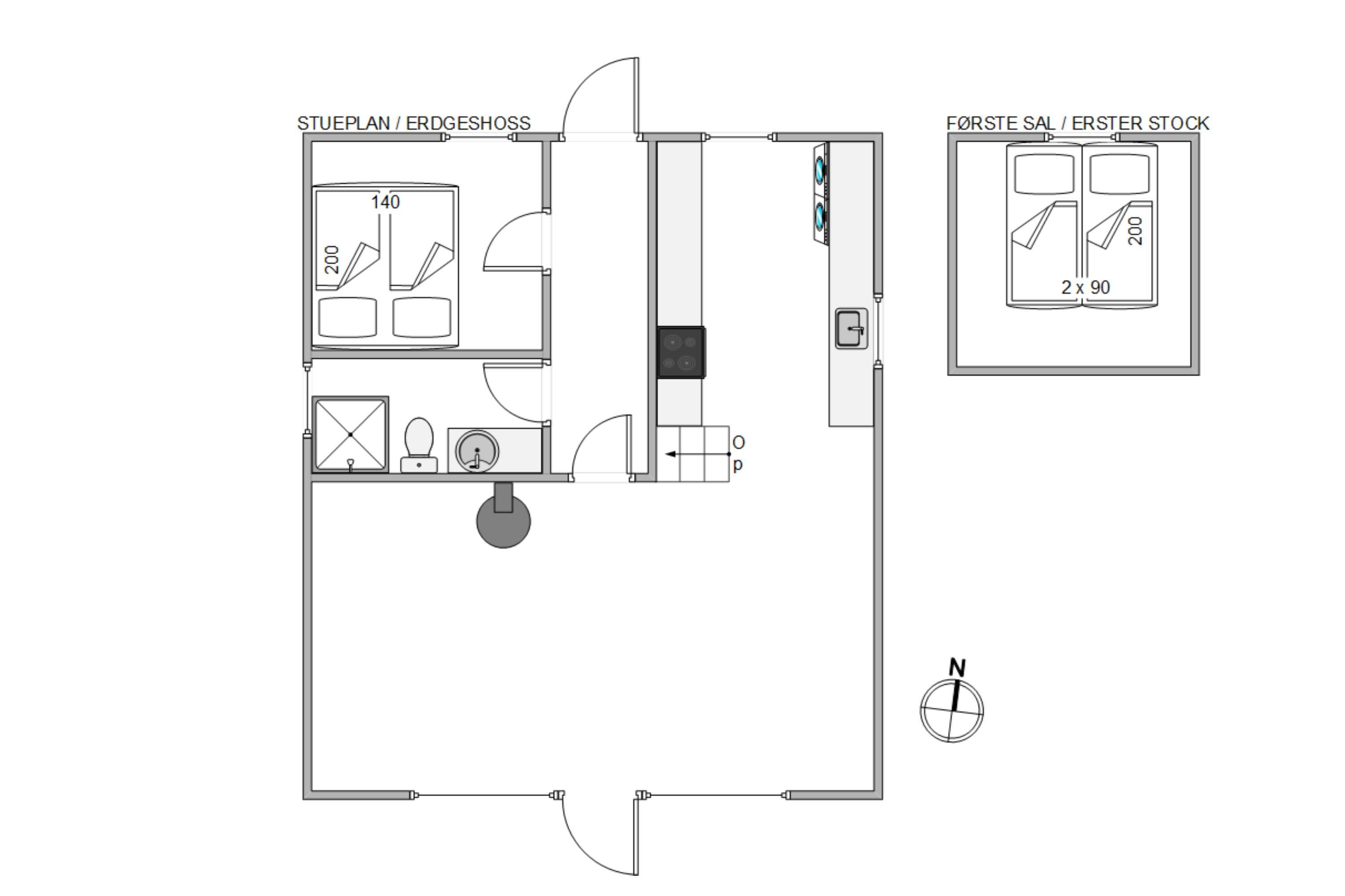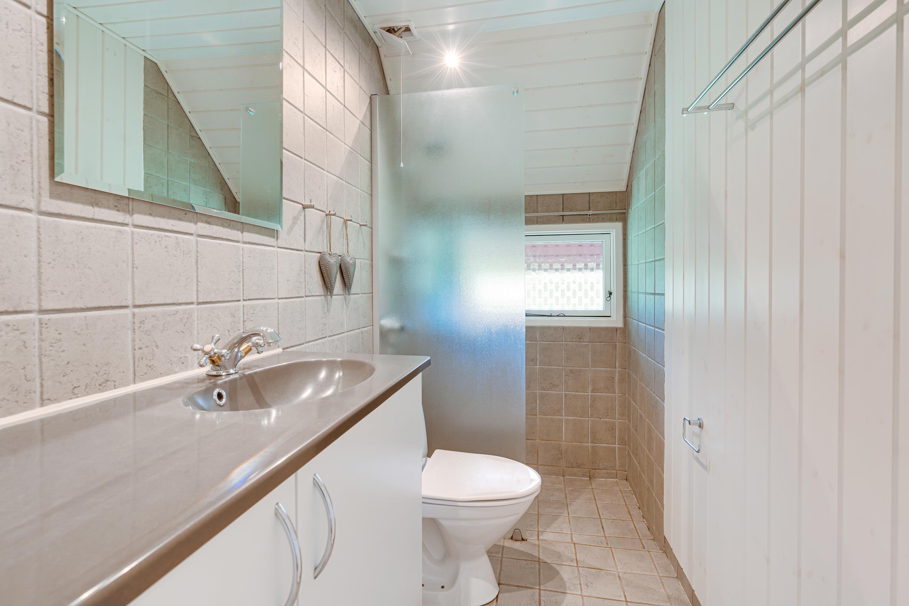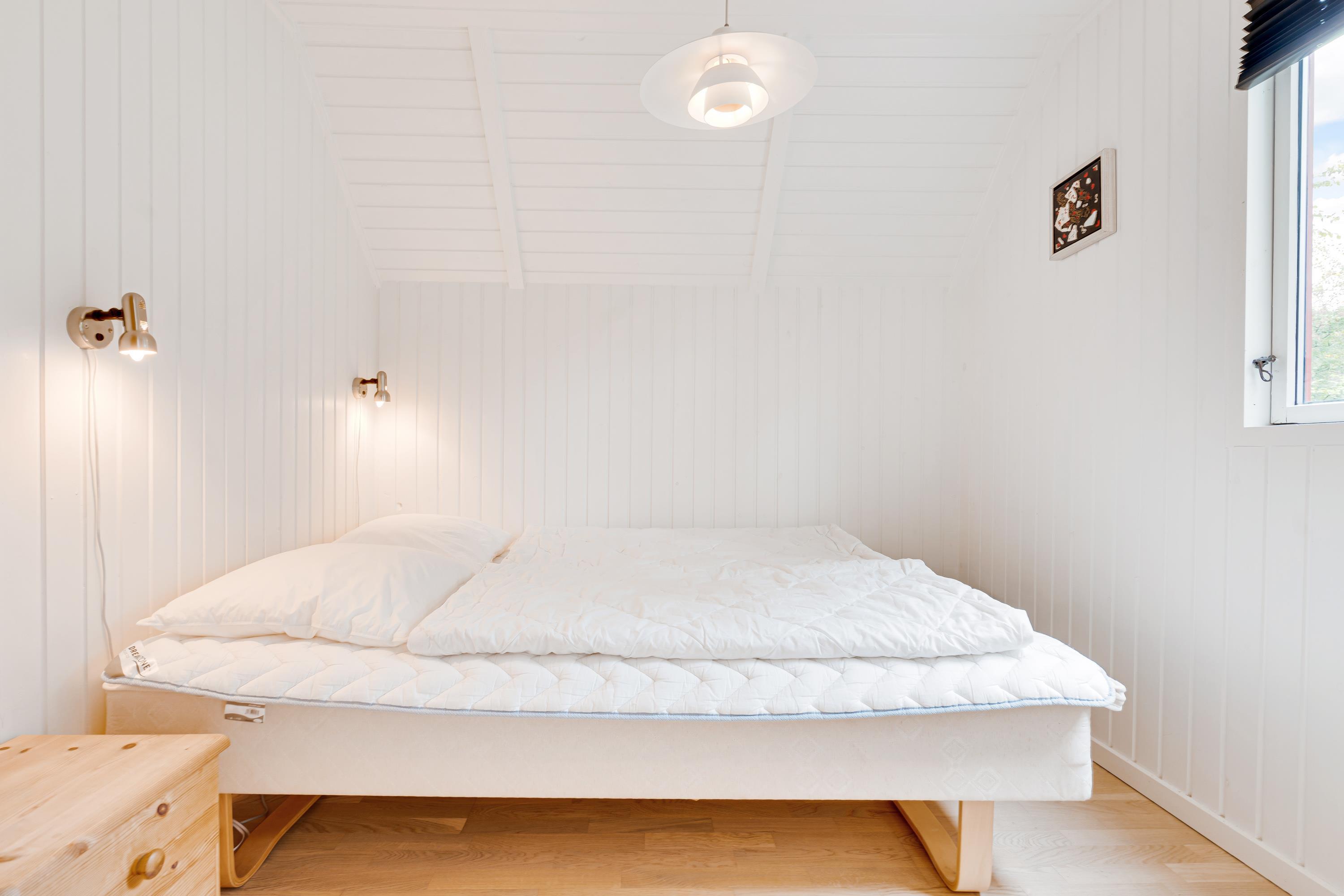 På første sal (stejl trappe) ligger det ene af sommerhusets 2 soveværelser med dobbeltsenge, imens du i stueetagen har det andet soveværelse, opholdsrummet og et badeværelse holdt i lyse farver med bruser og gulvvarme.