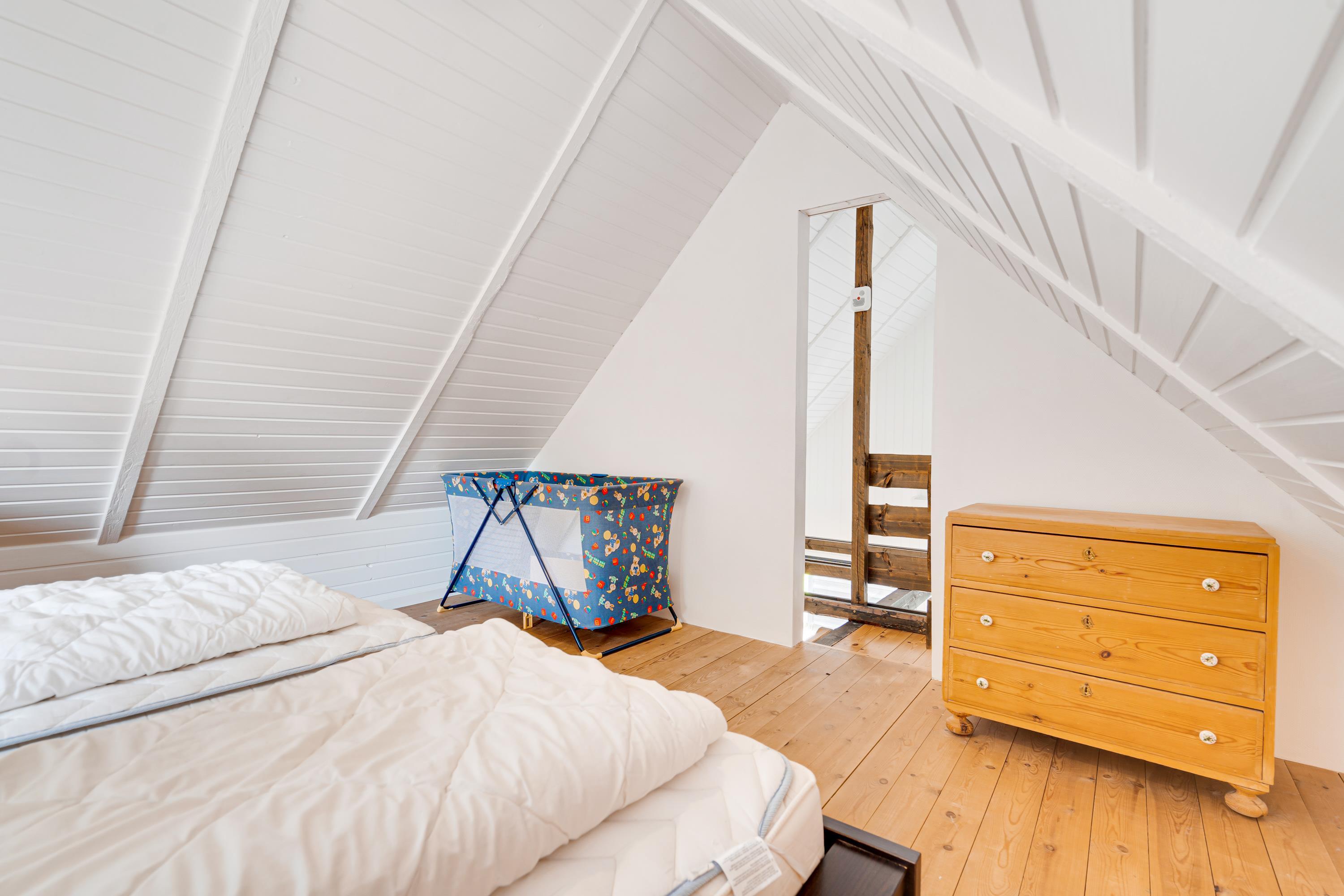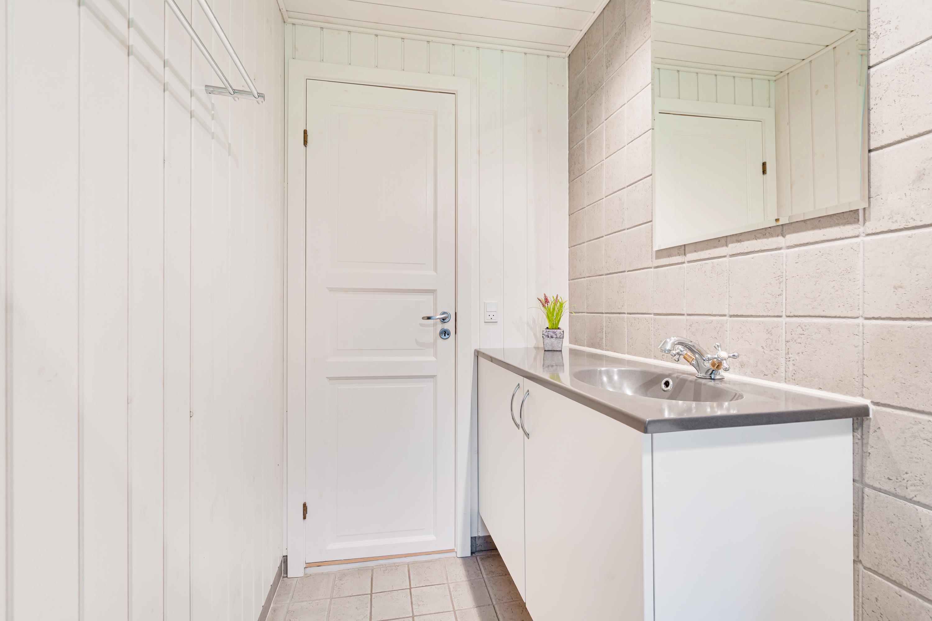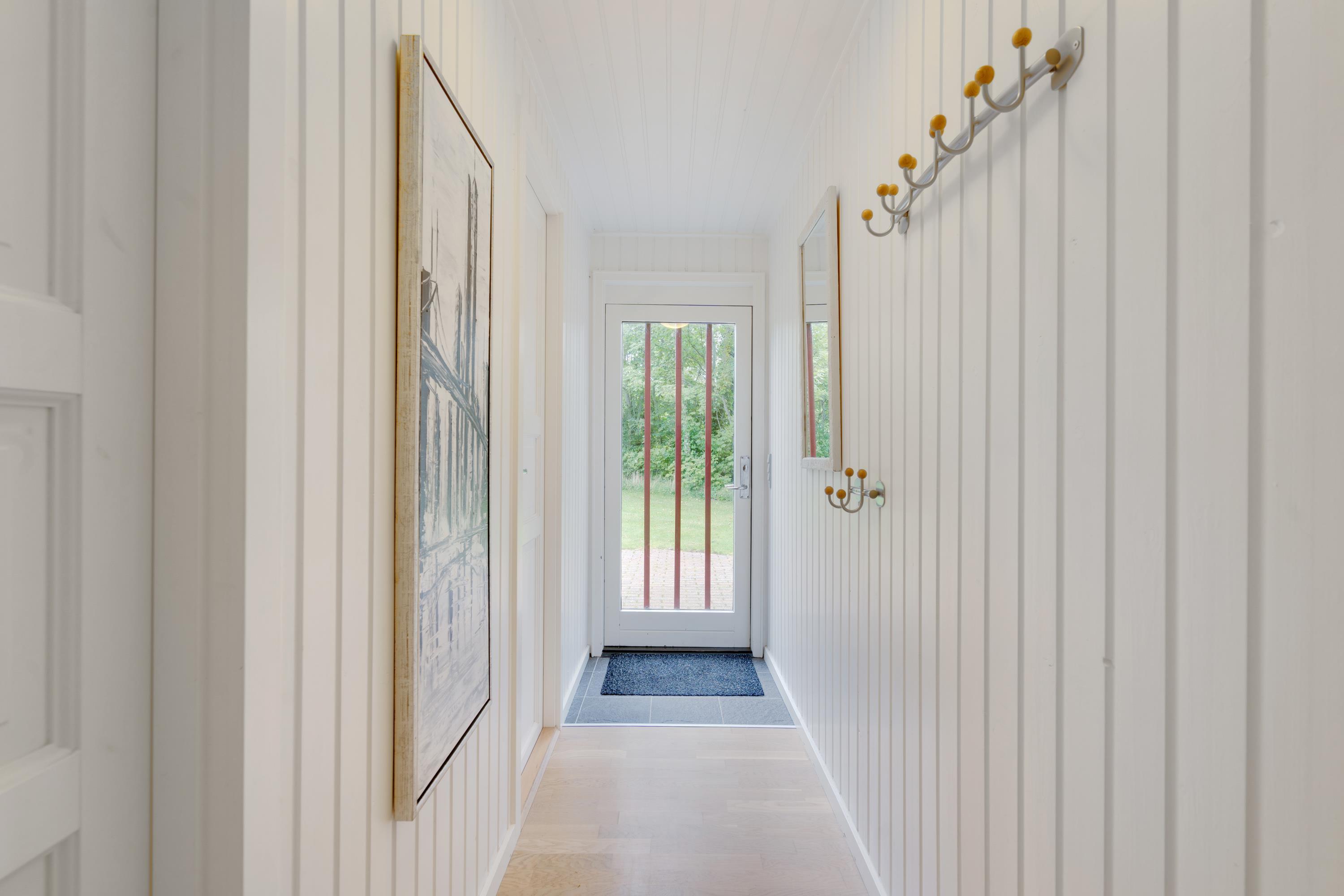 På første sal (stejl trappe) ligger det ene af sommerhusets 2 soveværelser med dobbeltsenge, imens du i stueetagen har det andet soveværelse, opholdsrummet og et badeværelse holdt i lyse farver med bruser og gulvvarme.