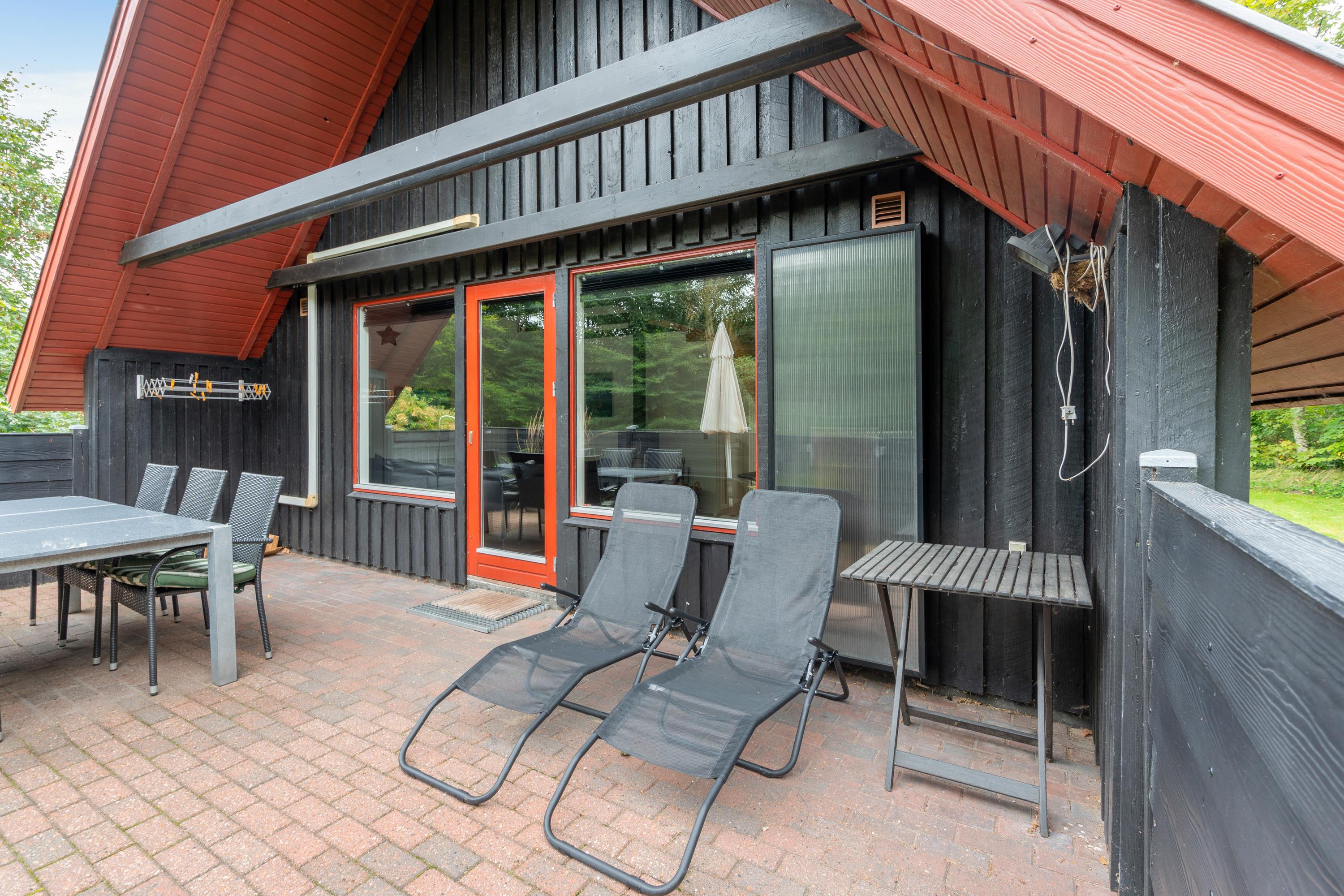 Udenfor overbeviser sommerhuset på Fyrrelunden 52, der ligger privat på en ugeneret grund. Gennem terrassedøren i stuen træder I ud på en sydvendt og delvist overdækket terrasse. Og skulle hunden smutte med ud, er det intet problem, for terrassen er også lukket. Så snart solens stråler får en smule magt om foråret, kan terrassen benyttes, da her er gode læforhold.