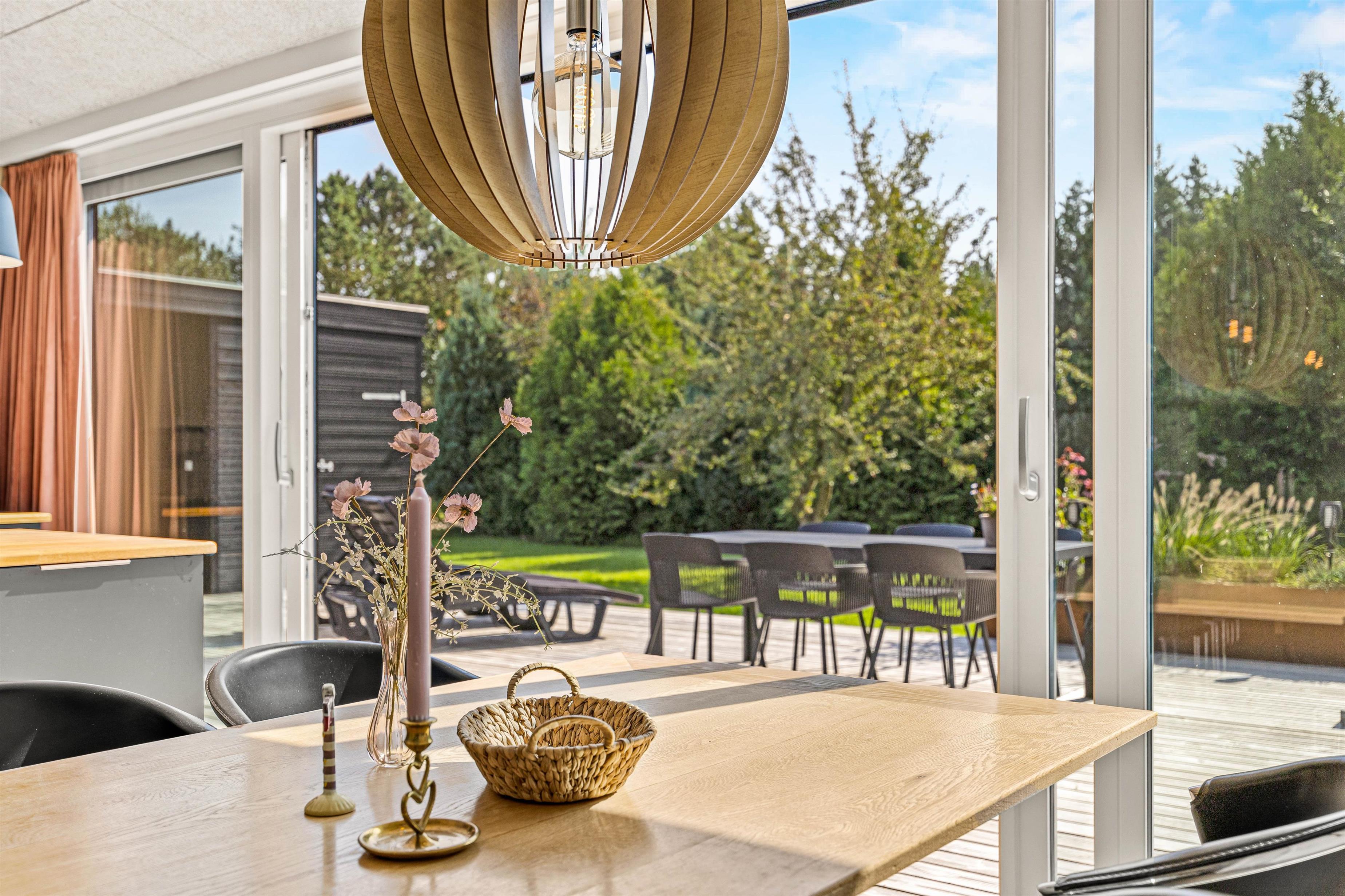 Fra sommerhuset kan I træde ud på den skønne terrasse, der er delvist overdækket, hvor I kan tilbringe feriens solrige og varme dage. Her står havemøbler og liggestole klar til jer, så I kan finde jer godt til rette på en god plads i solen. På terrassen har I desuden en udebruser, I kan skylle jer under.