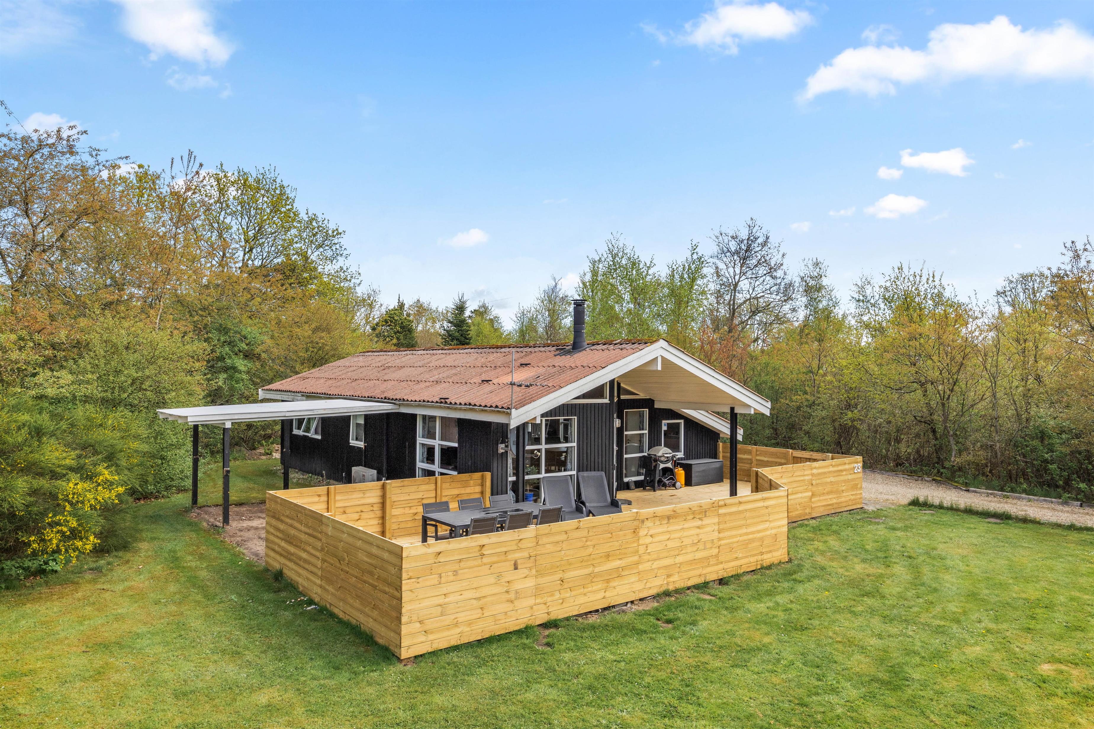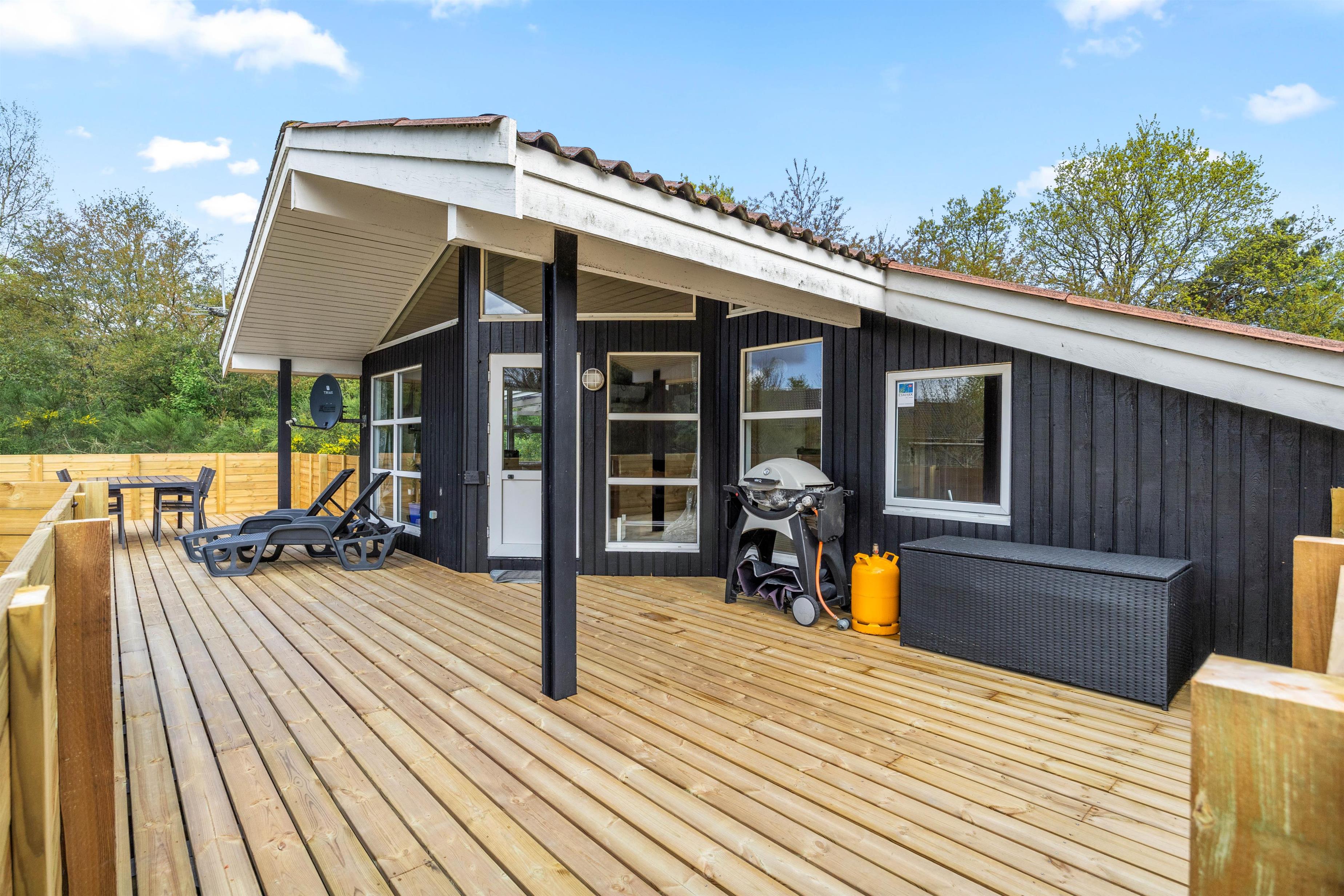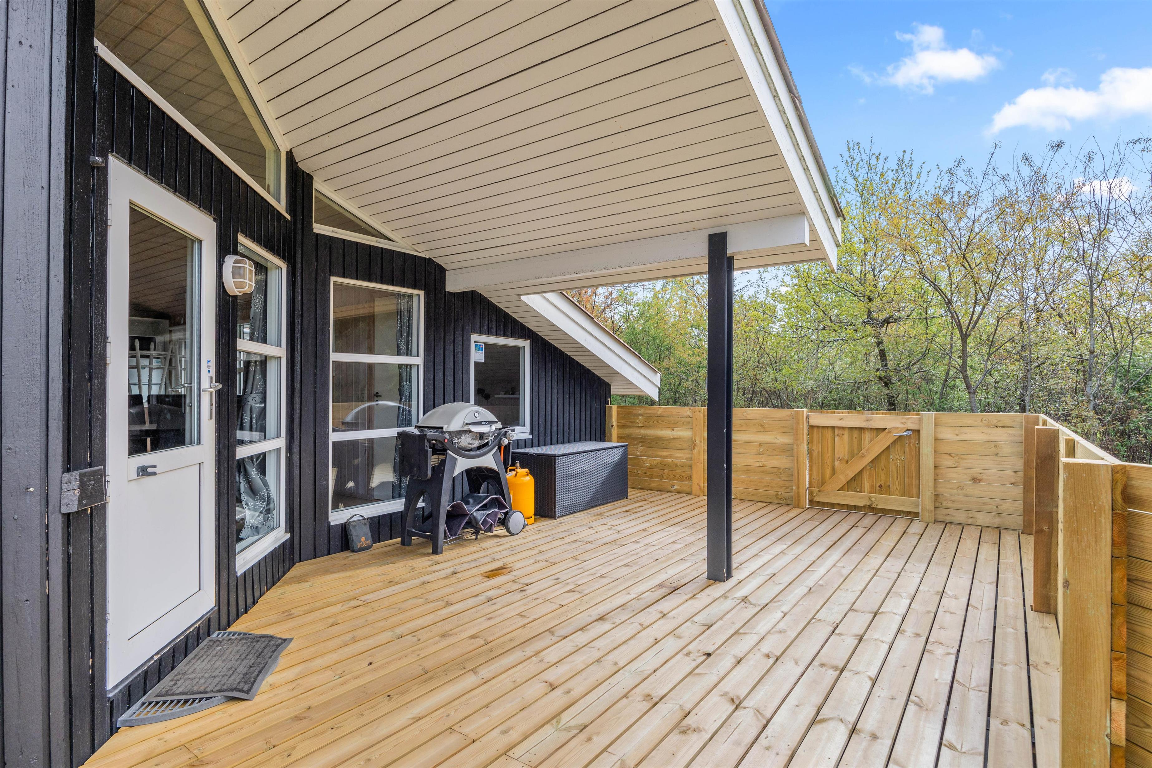Til sommerhuset er der en stor træterrasse, hvor I kan spise jeres mad under den overdækkede del af terrassen - selv når vejret er dårligt. Den anden del af terrassen er lukket af, så man kan opholde sig uforstyrret i haven og måske nyde solens varme stråler på sommerhusets liggestole. Her er der også en gasgrill, hvilket er et must på de lune sommeraftener.