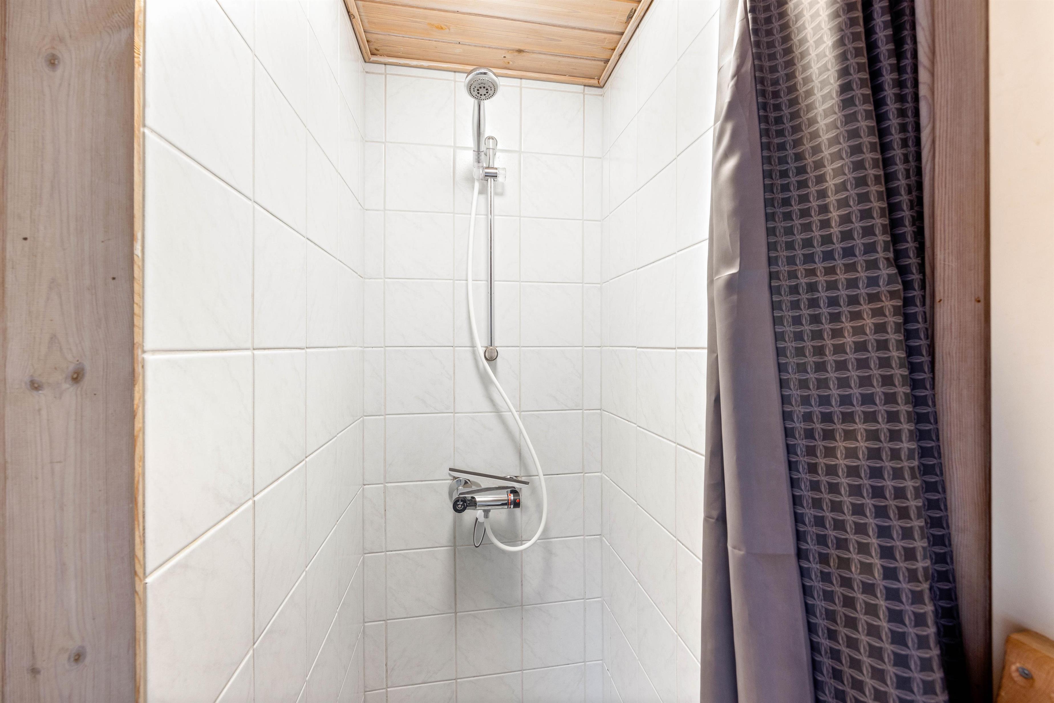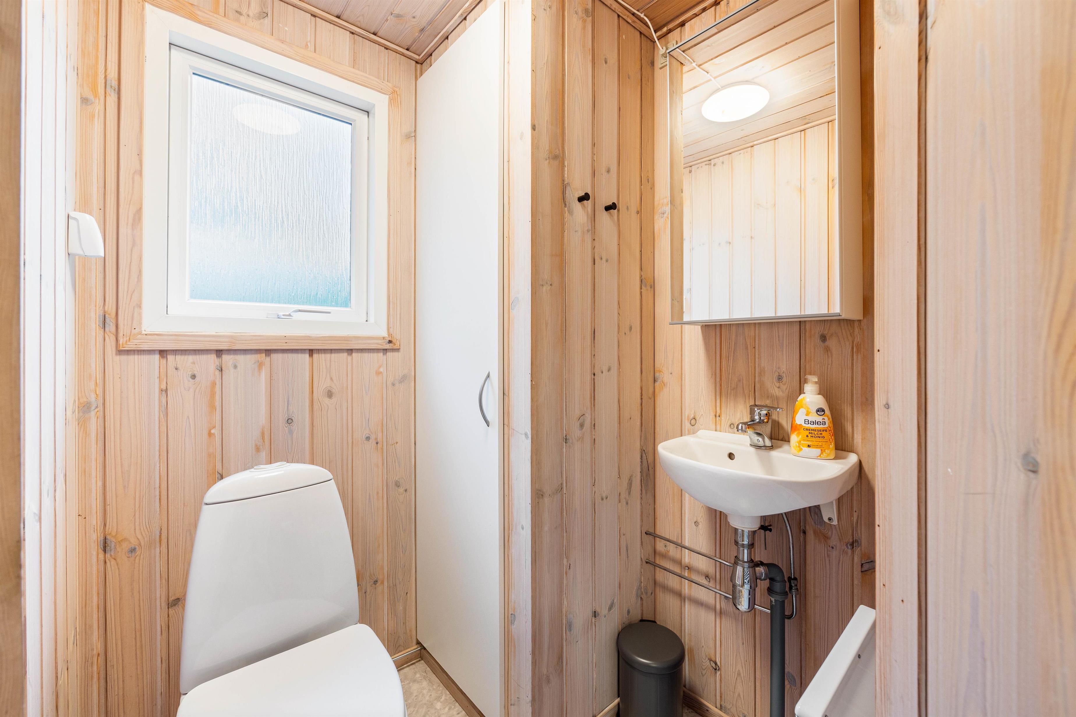 I har også et badeværelse, der er lyst og venligt med spabad, sauna, vaskemaskine og tørretumbler. Alt sammen for at I kan forkæle jeres kroppe med en følelse af velvære og samtidig gøre jeres feriedage nemmere med rent vasketøj. Sommerhuset rummer også et gæstetoilet, så der ikke bliver for lang kø til det store badeværelse.