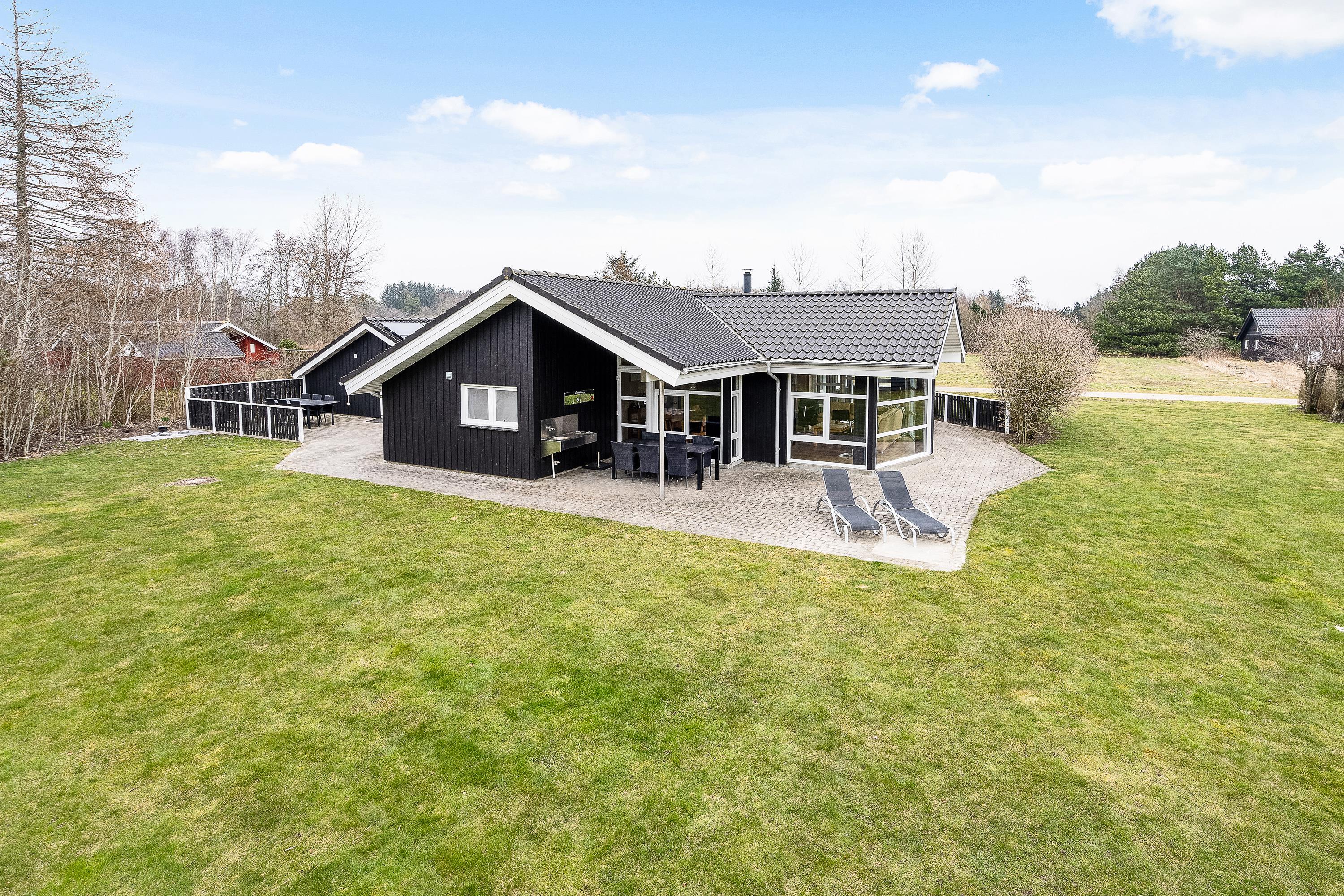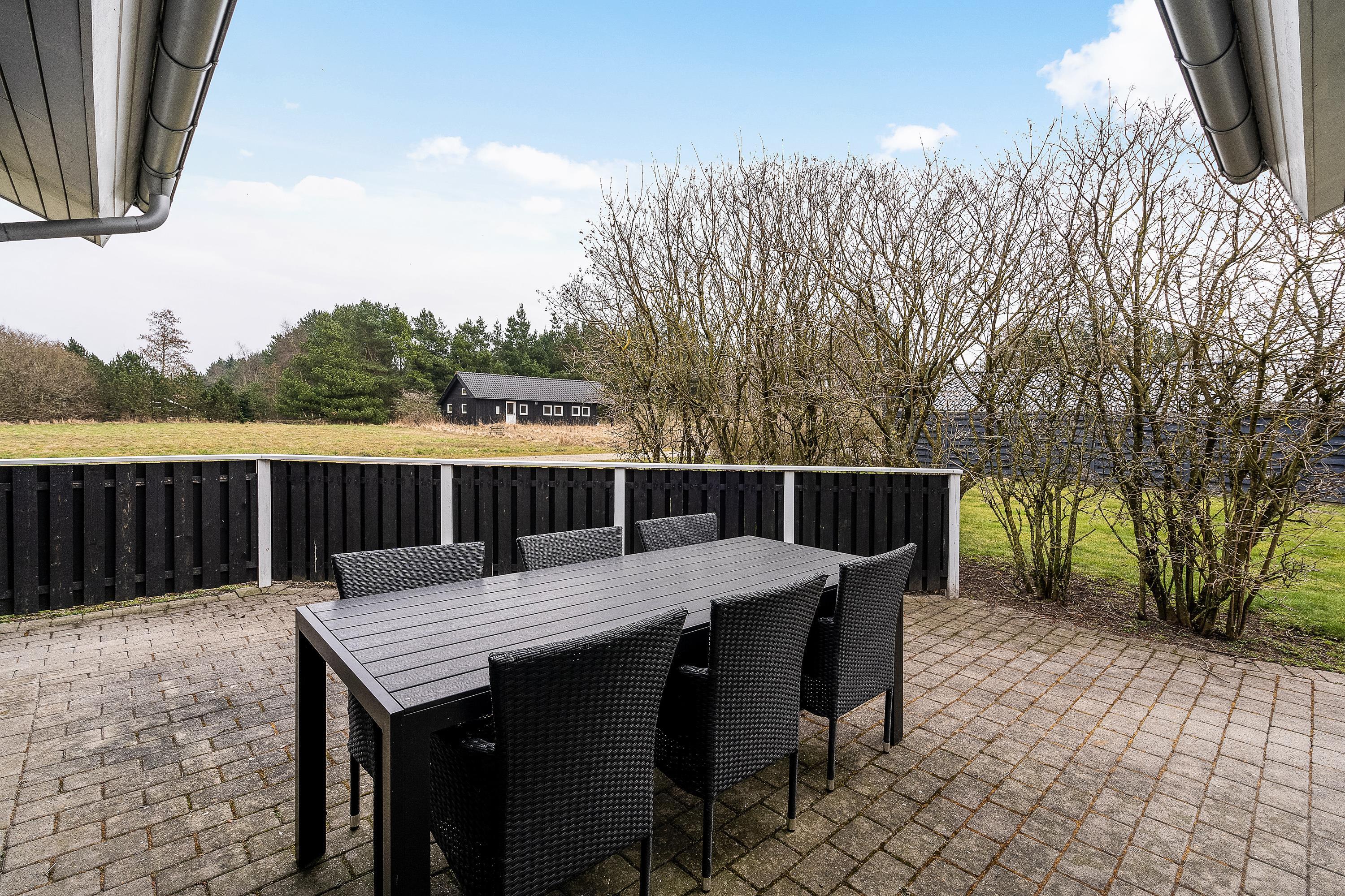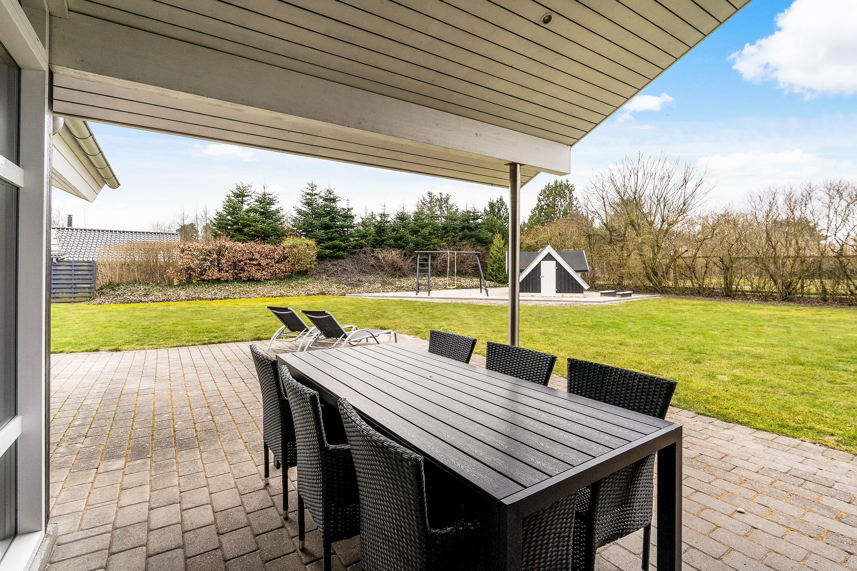 Fra stuen kan I træde ud på den store terrasse, som strækker sig hele vejen rundt om sommerhuset og tilbyder mange muligheder for at nyde det friske danske sommervejr. Fliserne rundt om huset gør det nemt at finde en solrig plet eller træde ind i skyggen for en behagelig pause.