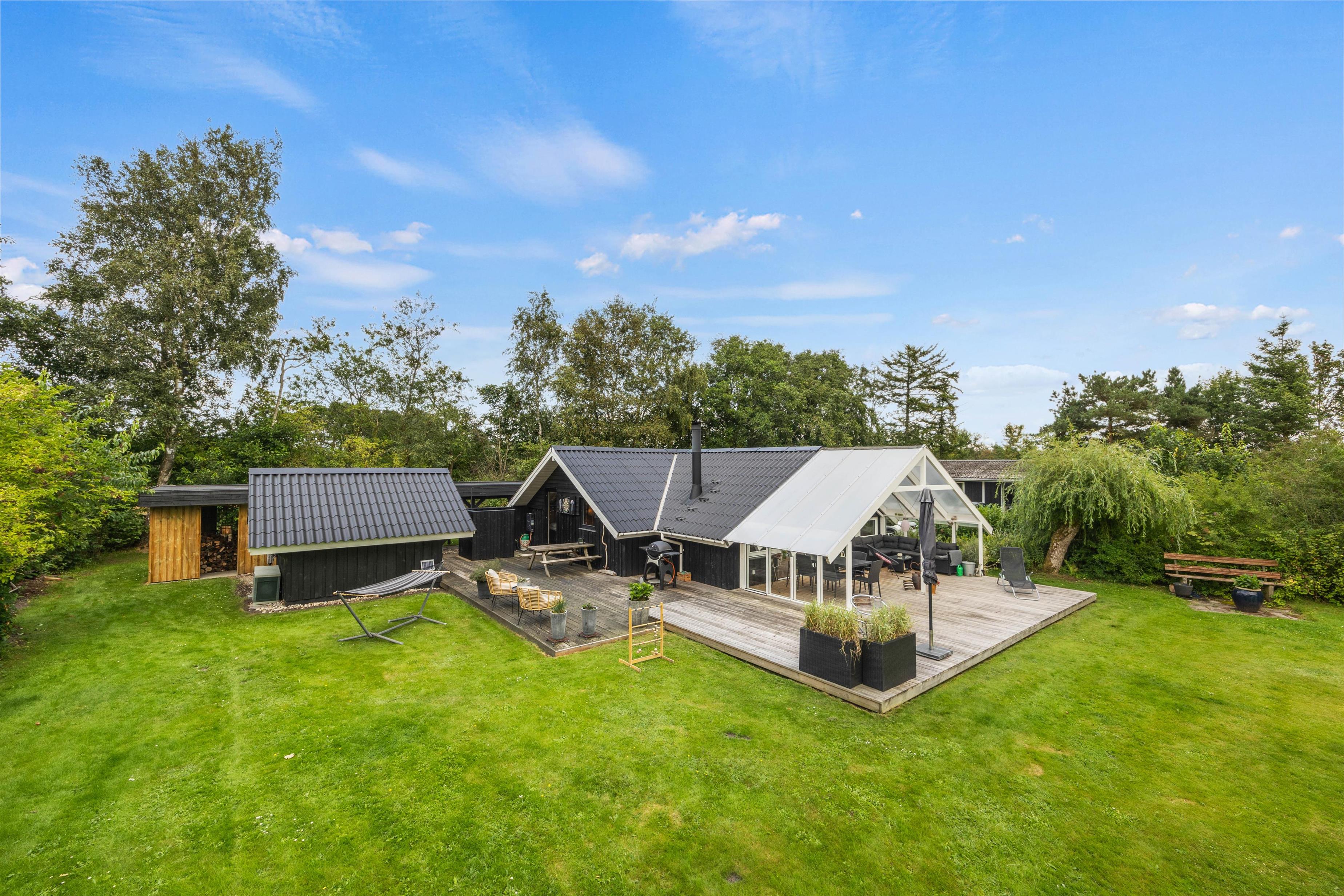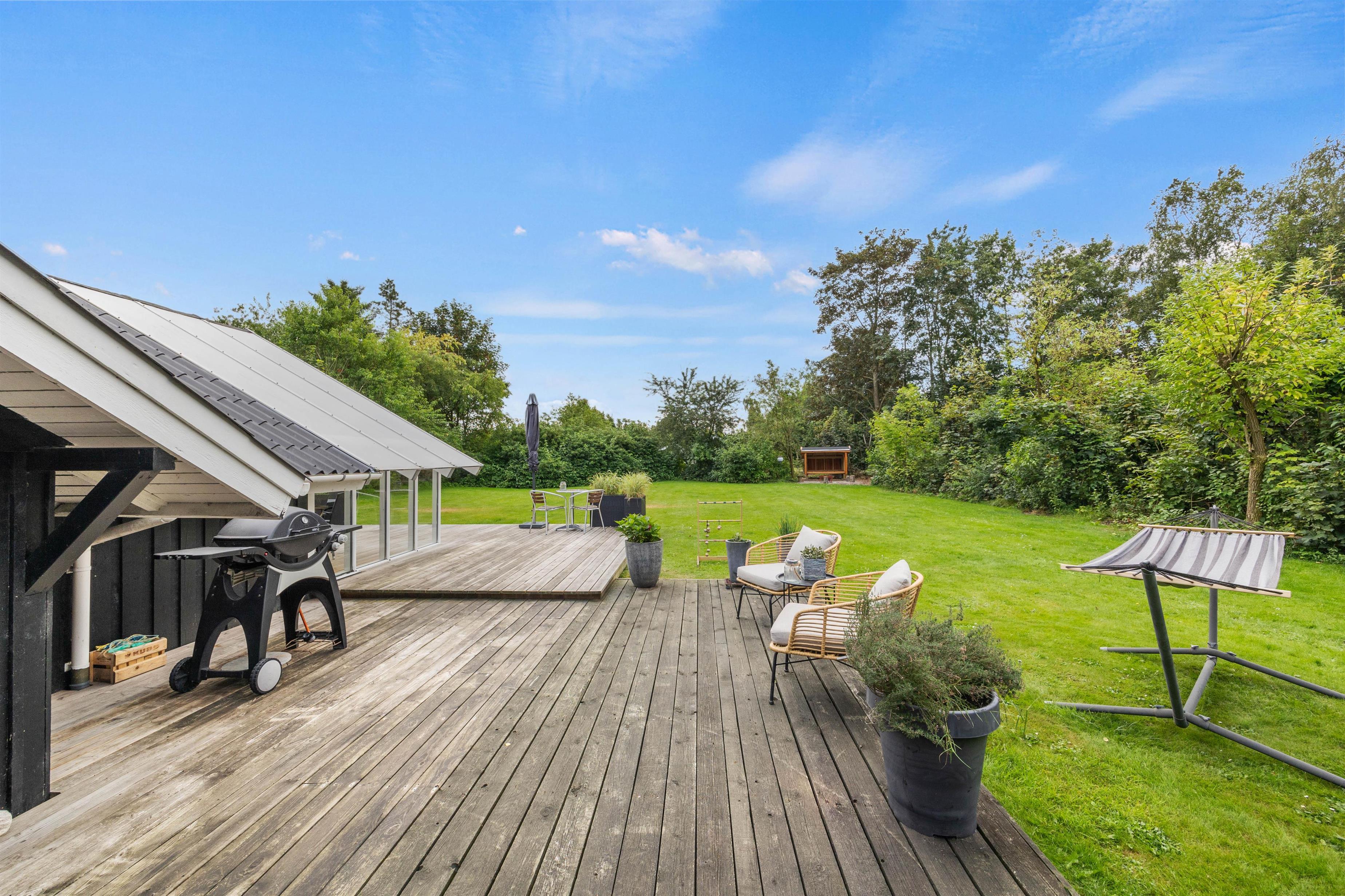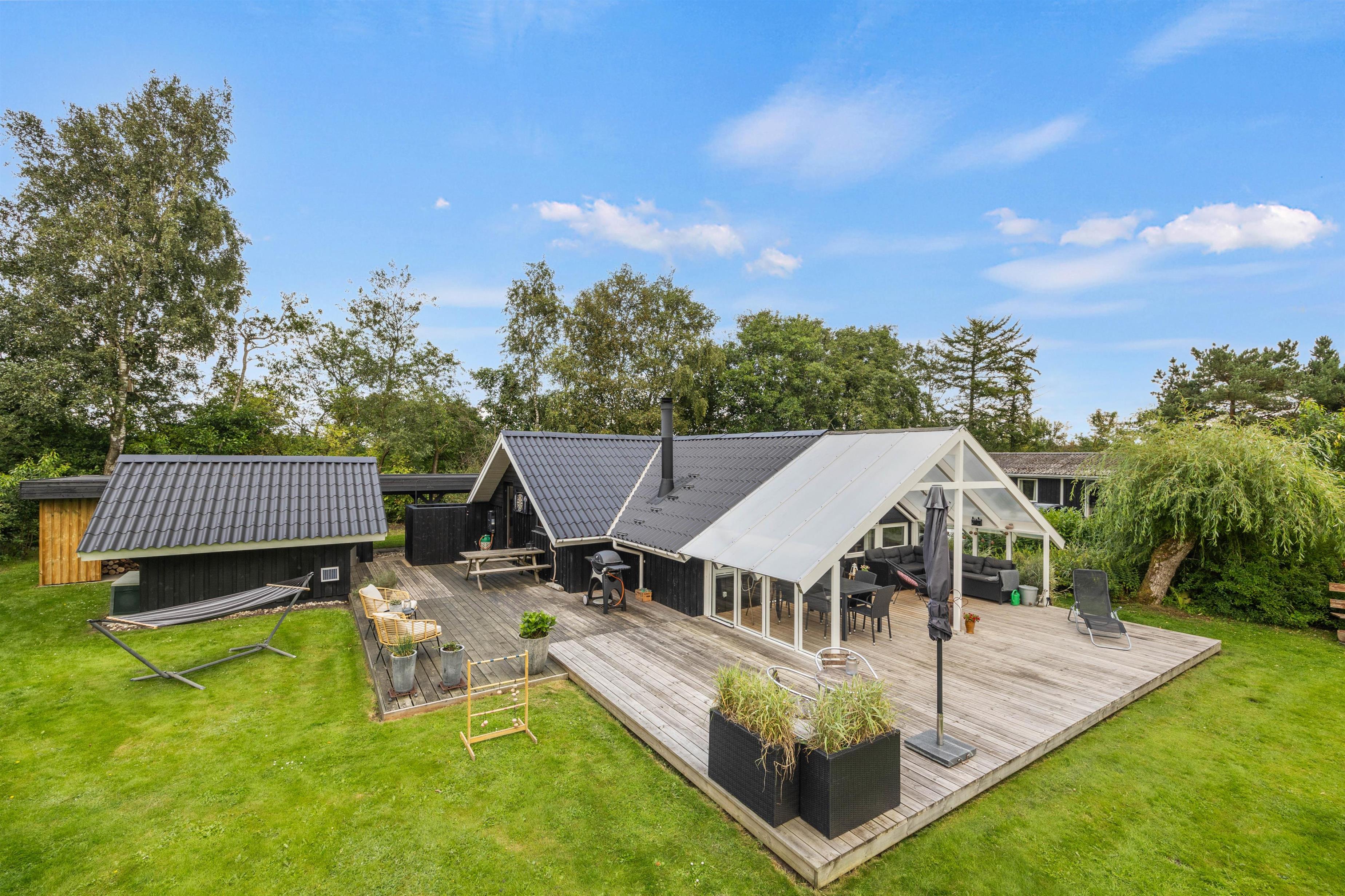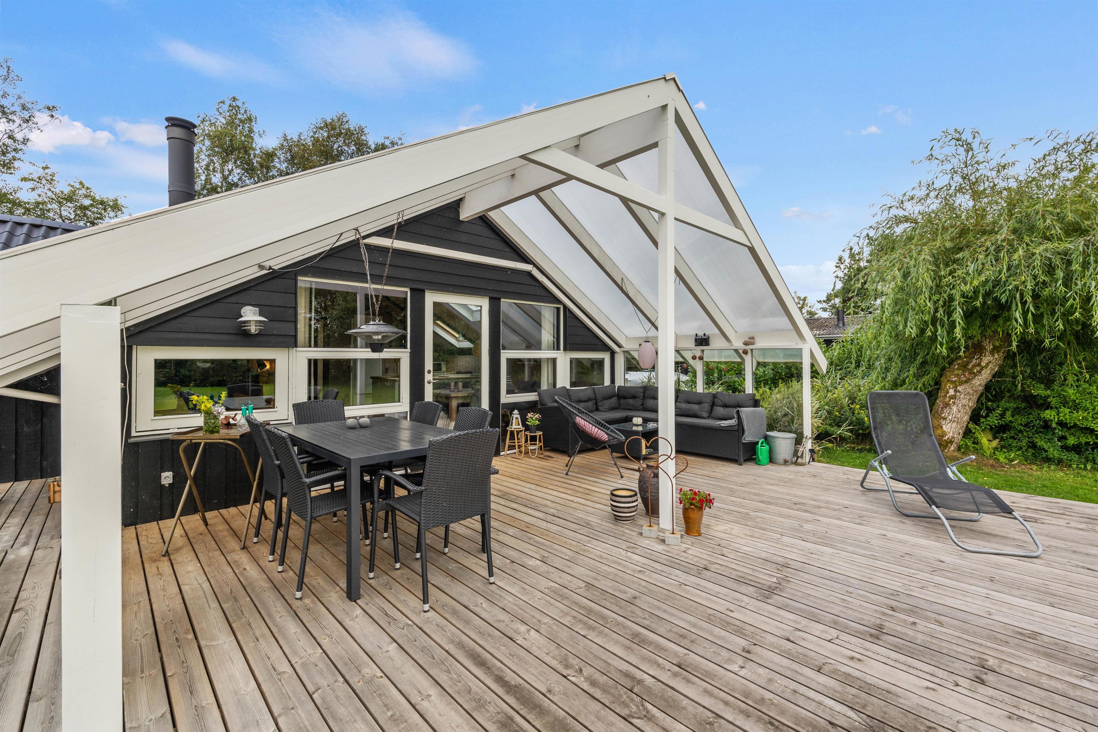 Sommerhuset byder på dejlige, udendørs faciliteter med flere terrasser – åben, afskærmet og delvist overdækket. Disse terrasser er perfekte til at nyde aftensmåltider under åben himmel. I kan bruge grillen og havemøblerne til at tilberede og nyde alt fra grillpølser til burgere i de hyggelige omgivelser. Solvogne og en parasol sørger for, at I kan slappe af og nyde de solrige dage.