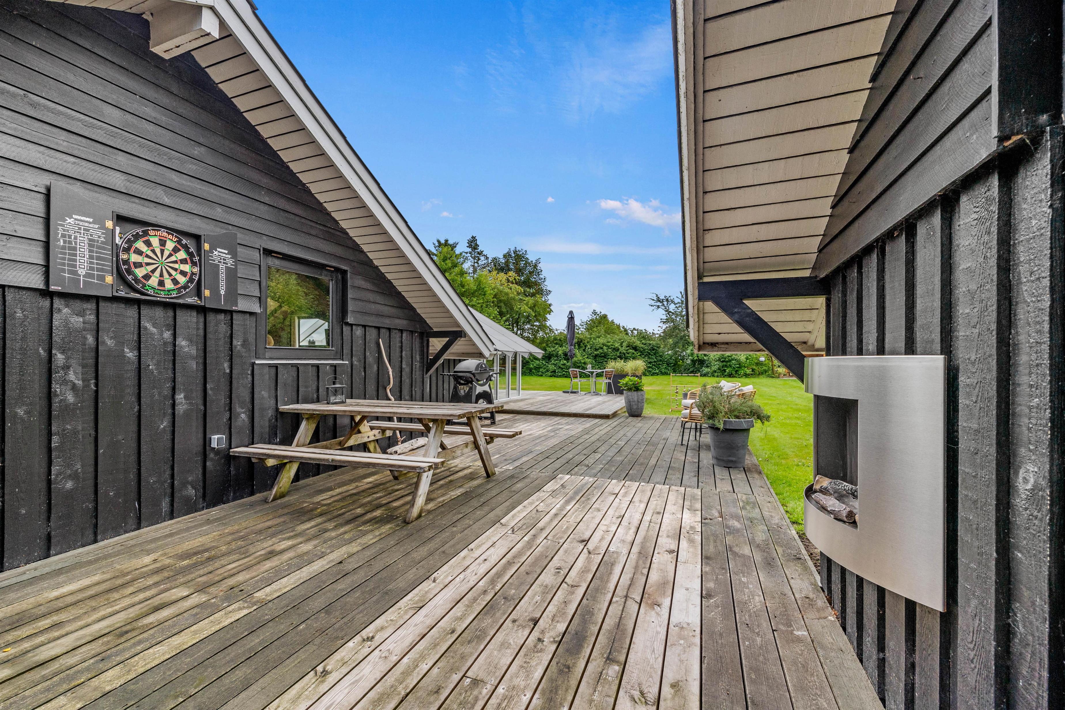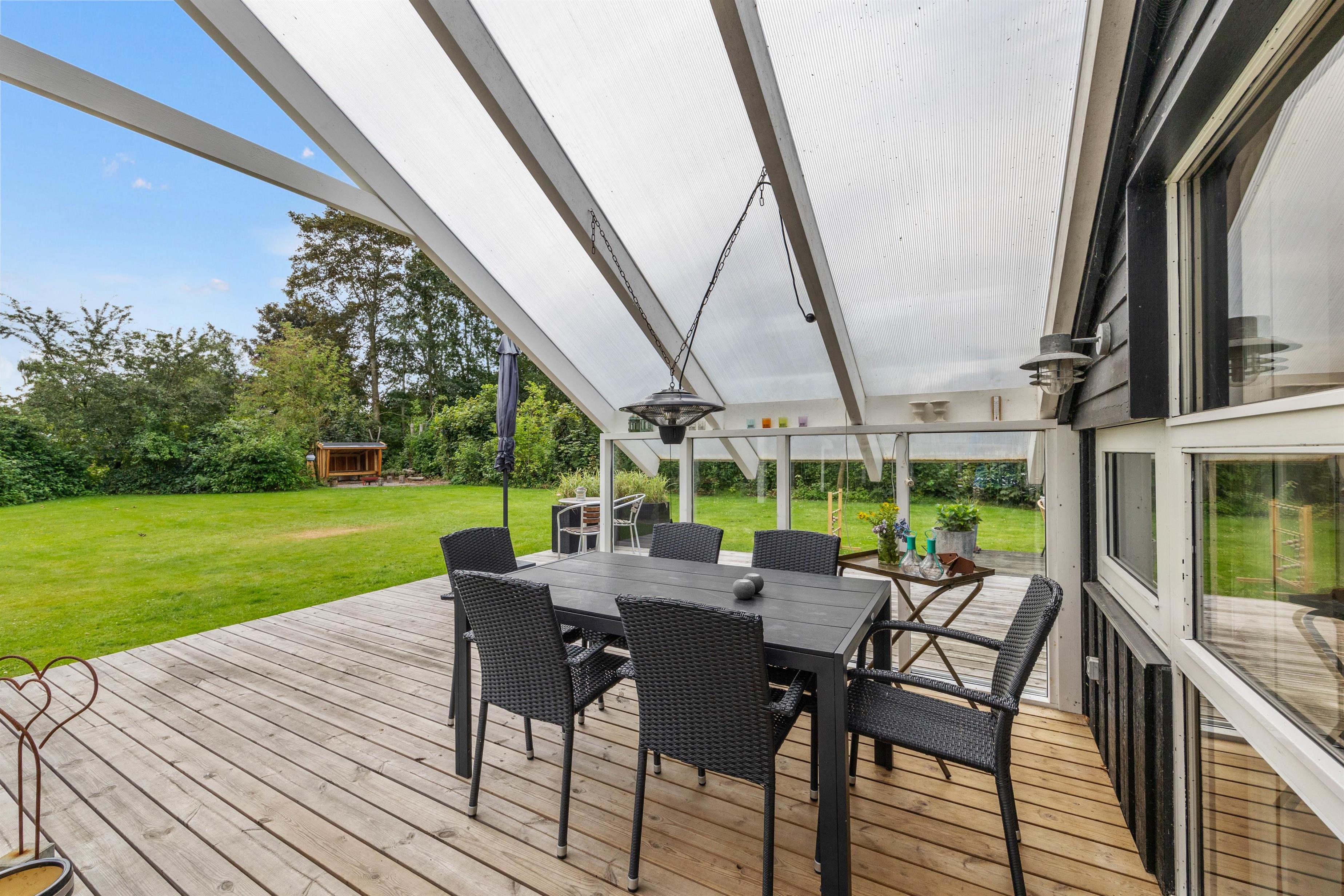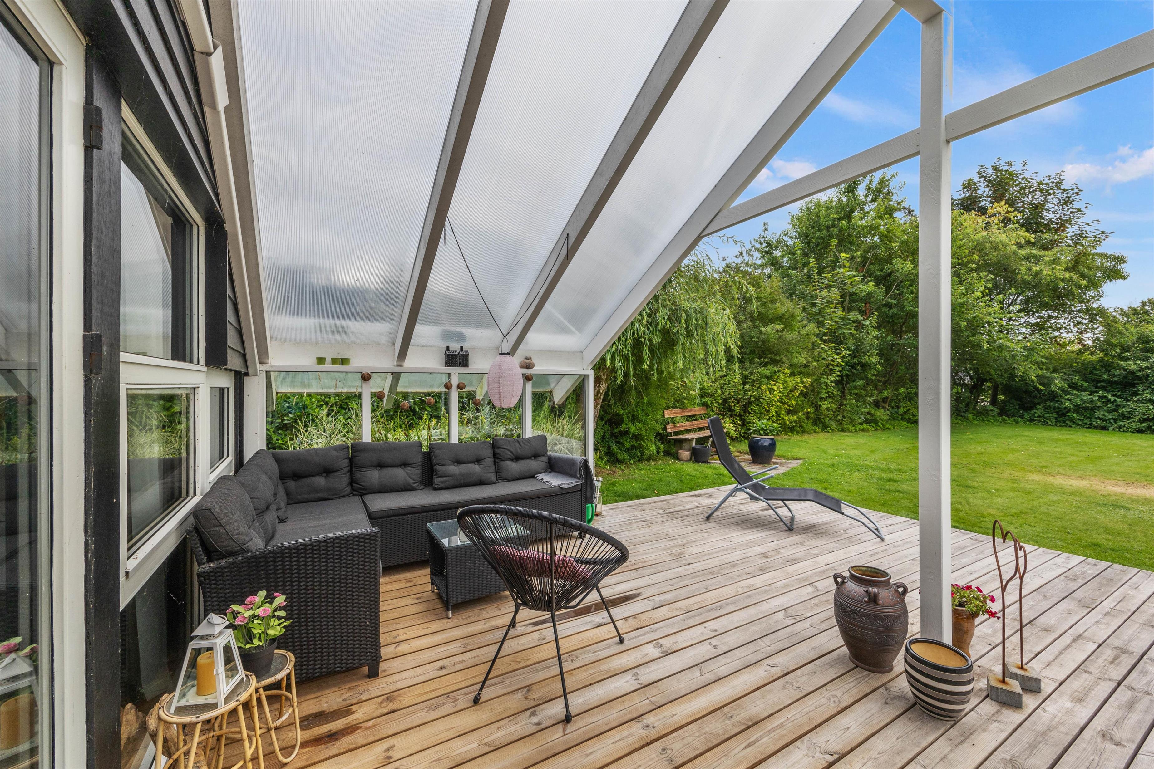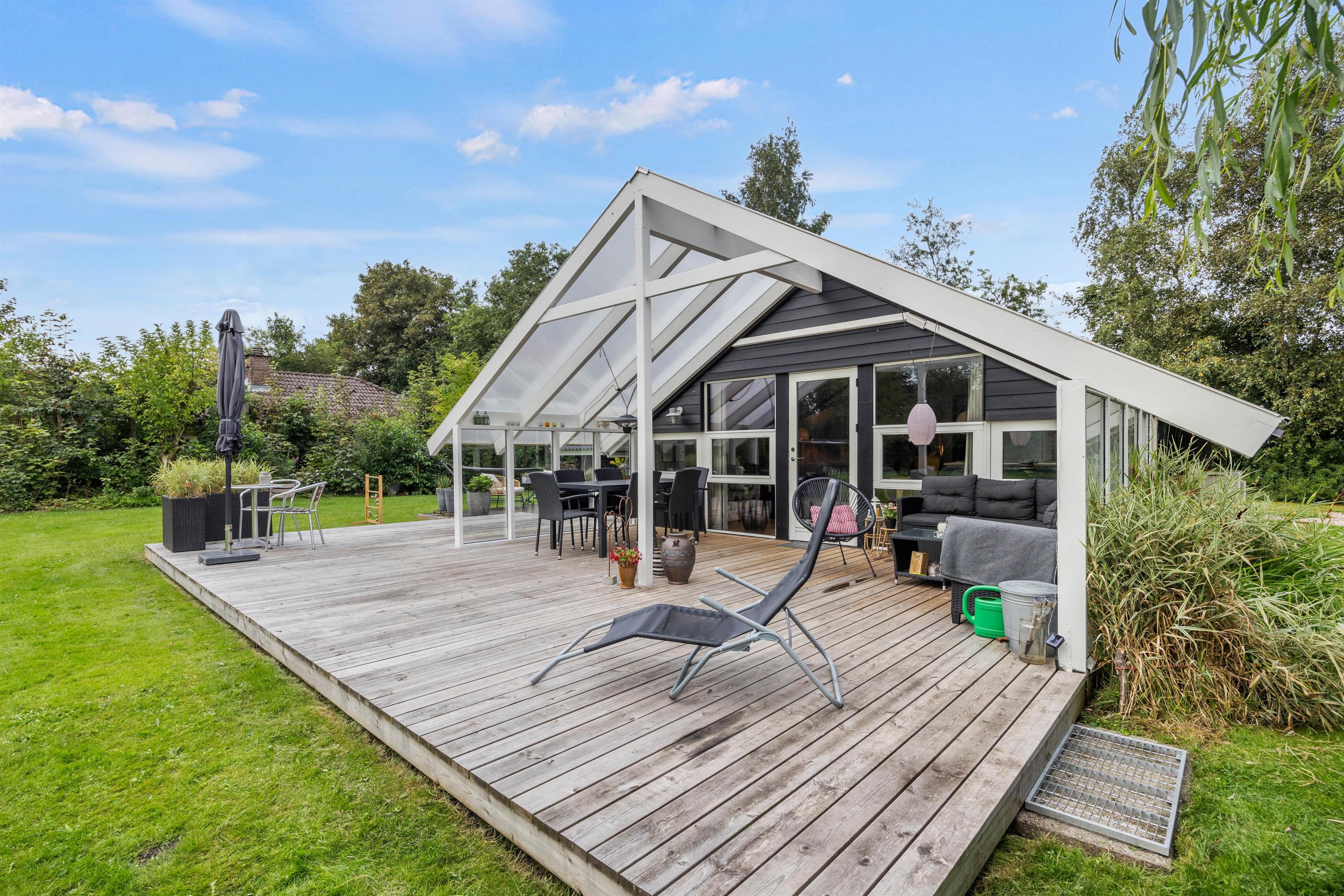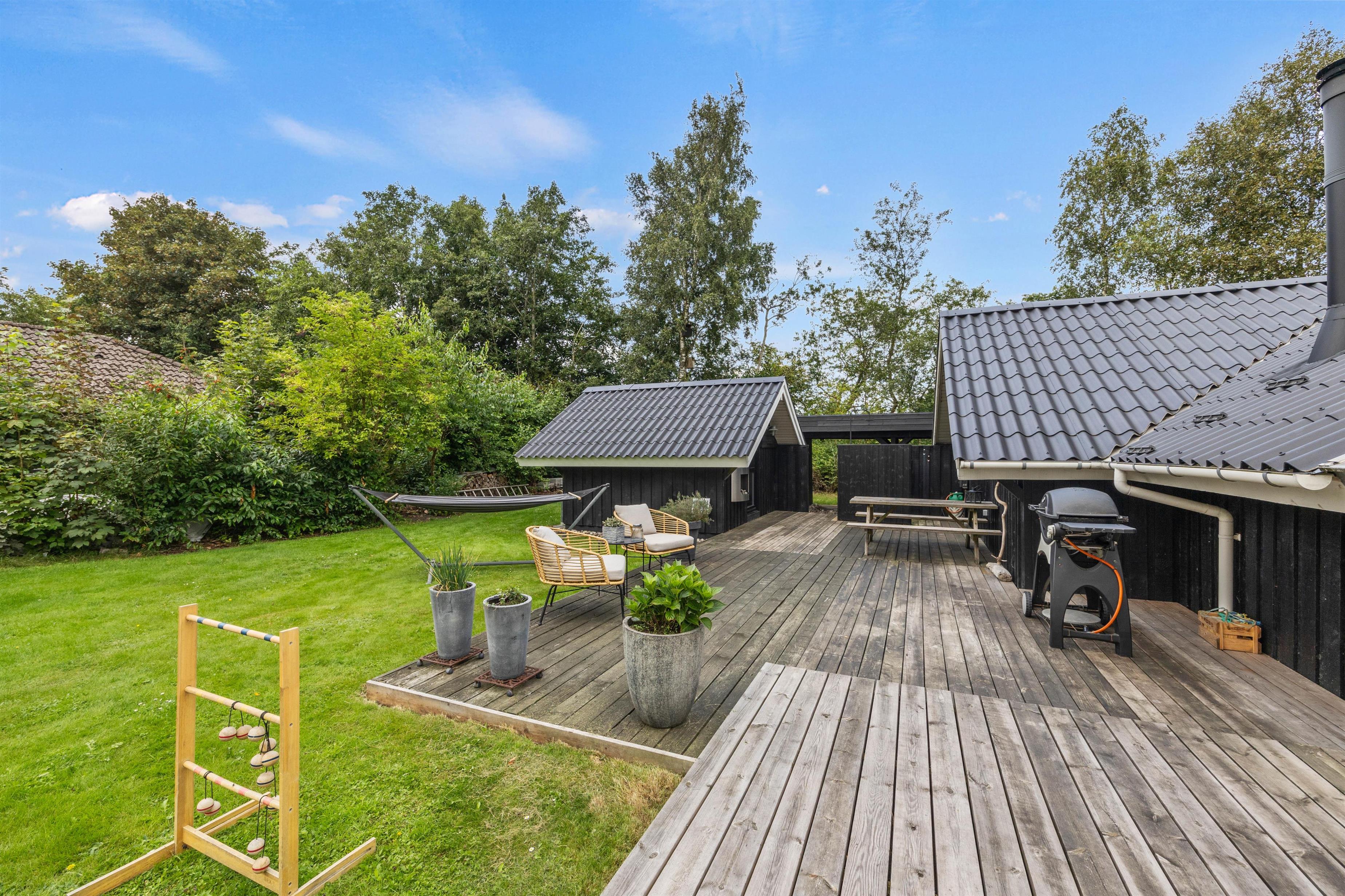 Sommerhuset byder på dejlige, udendørs faciliteter med flere terrasser – åben, afskærmet og delvist overdækket. Disse terrasser er perfekte til at nyde aftensmåltider under åben himmel. I kan bruge grillen og havemøblerne til at tilberede og nyde alt fra grillpølser til burgere i de hyggelige omgivelser. Solvogne og en parasol sørger for, at I kan slappe af og nyde de solrige dage.