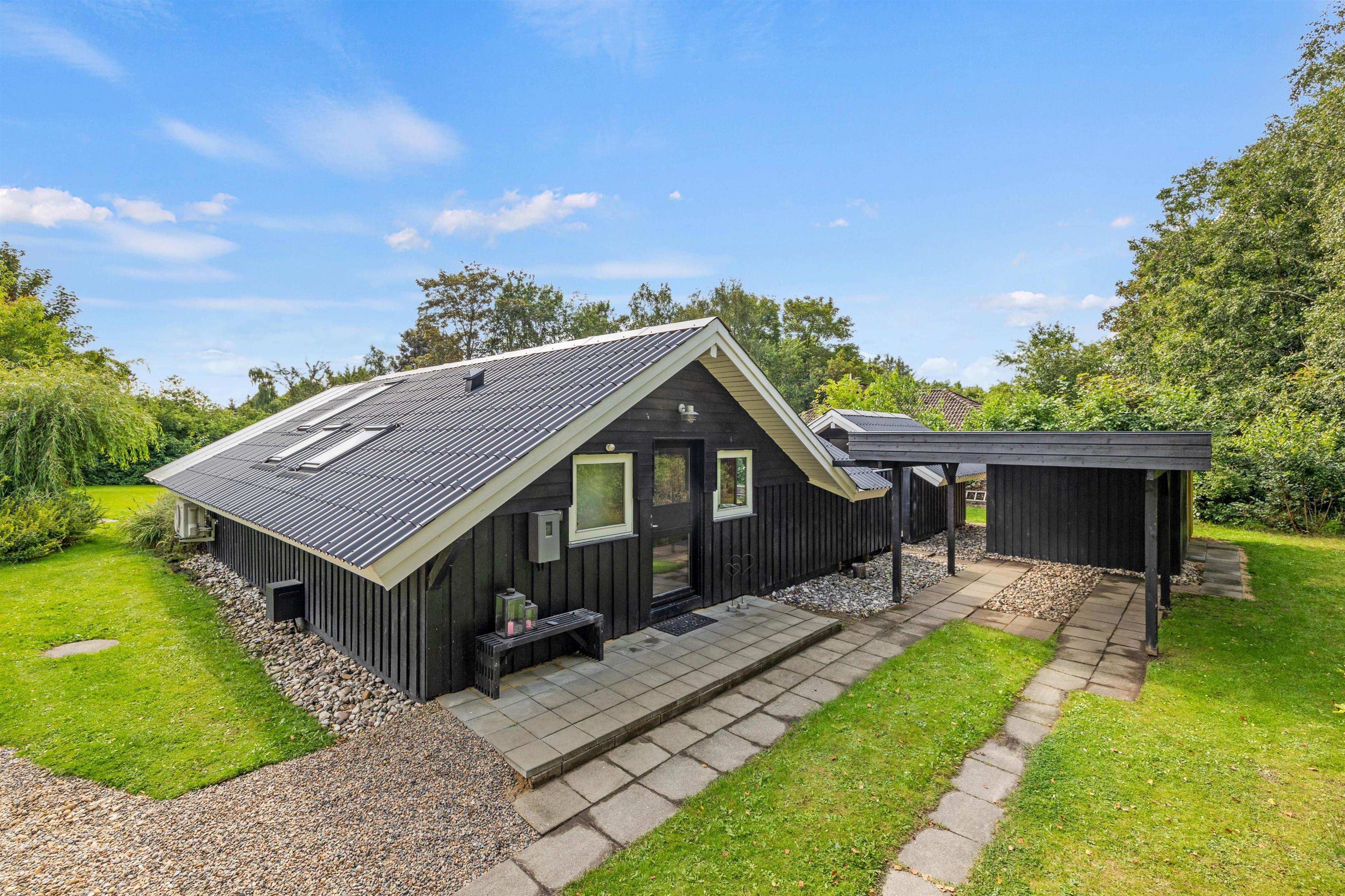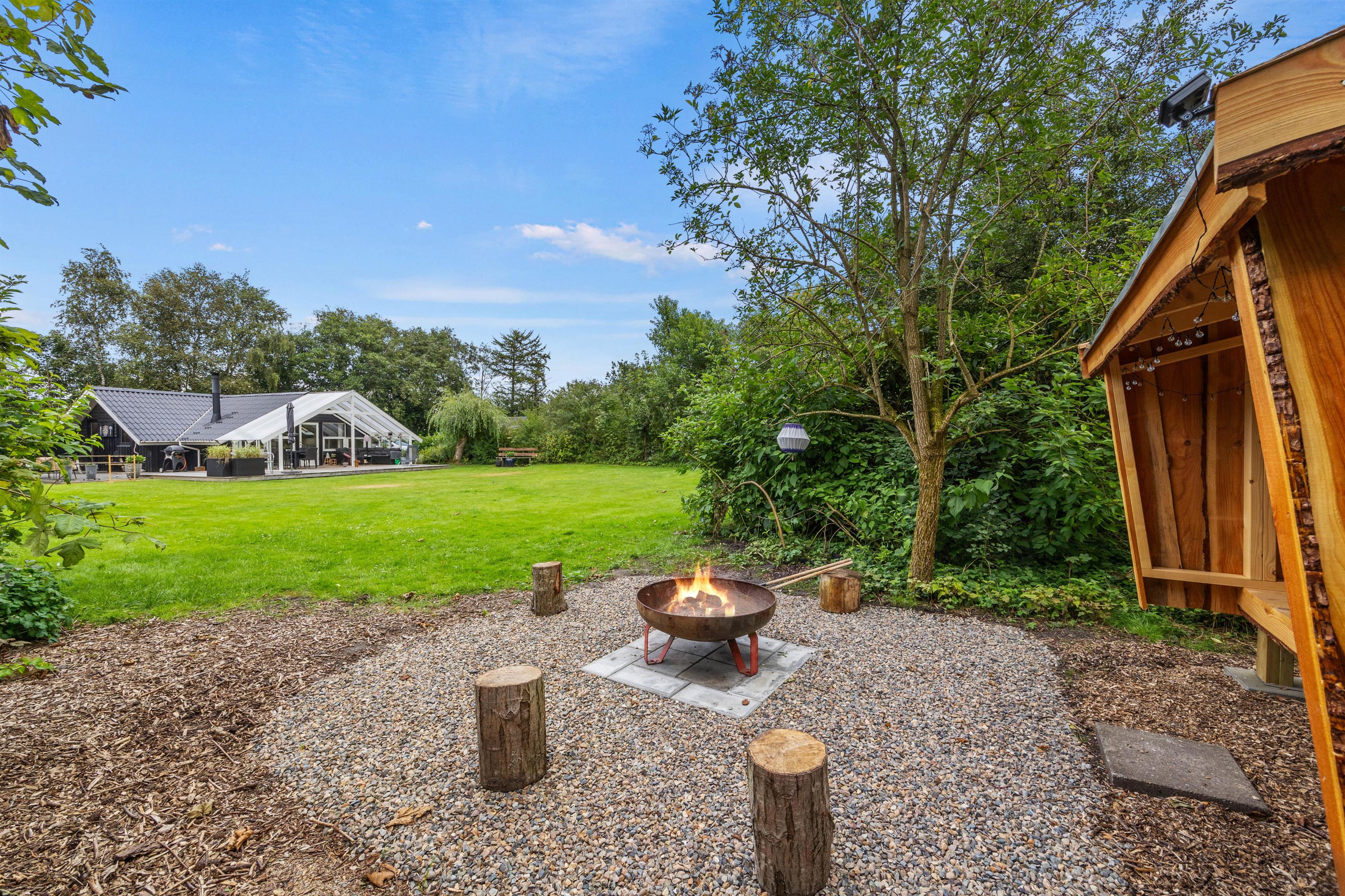 Fra terrasserne er der direkte adgang til den 1500 m2 store plænegrund, som giver rigelig plads til leg og aktiviteter for både børn og voksne. Udebruseren er tilgængelig fra april til oktober, og i haven finder I også et shelter og et bålsted, der skaber de perfekte rammer for hyggelige aftener under stjernerne. Til bilen er der en carport, så den kan stå beskyttet mod vind og vejr.