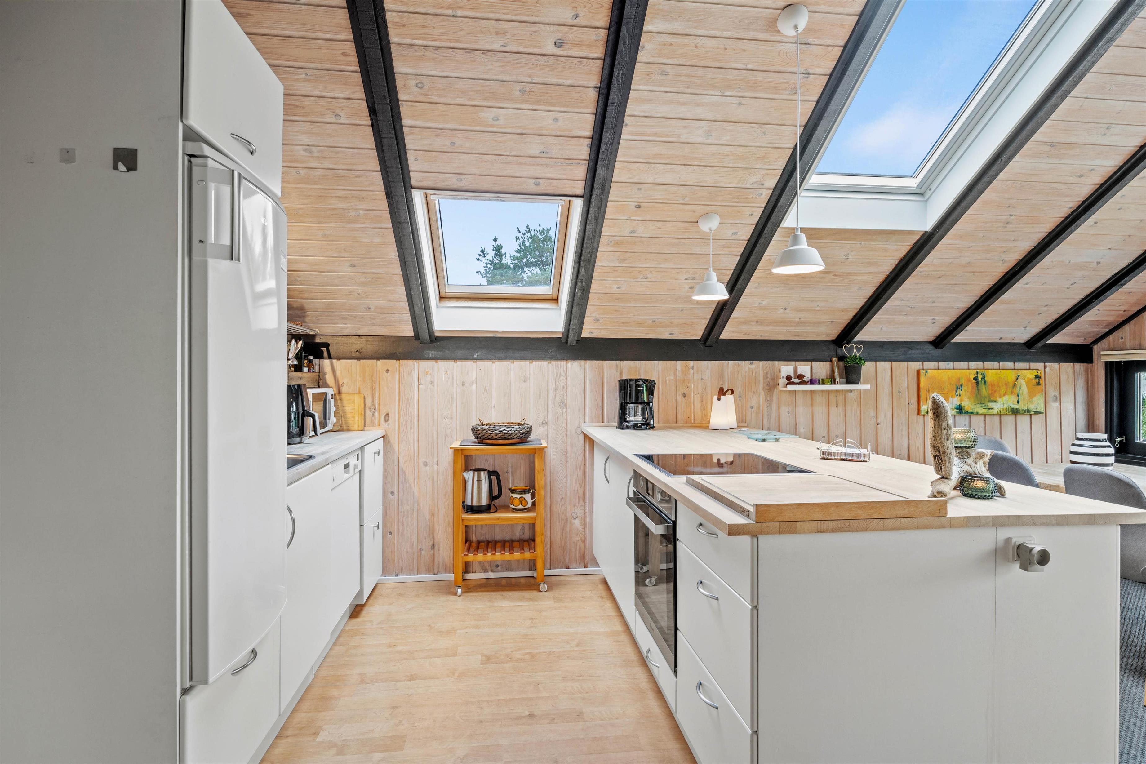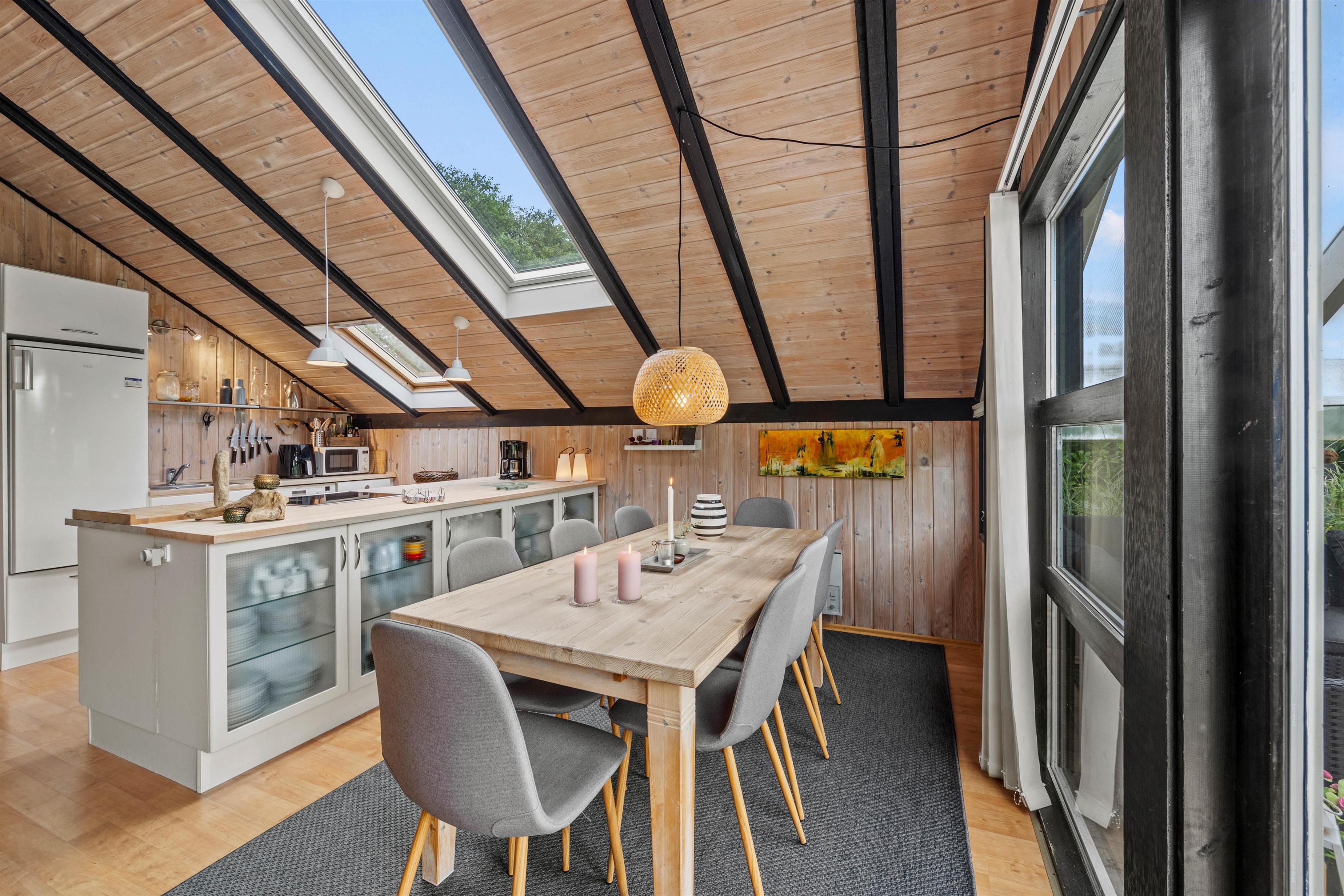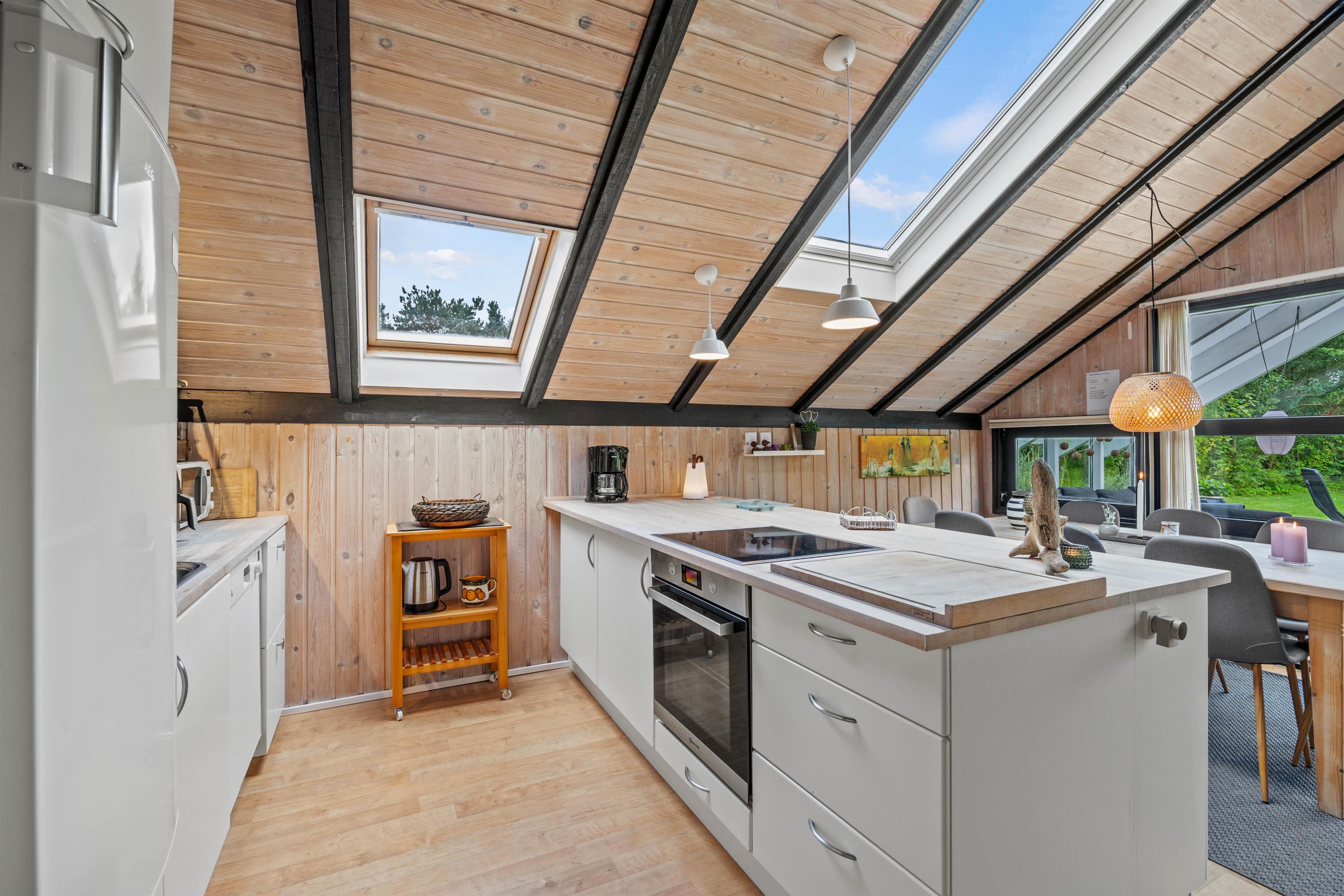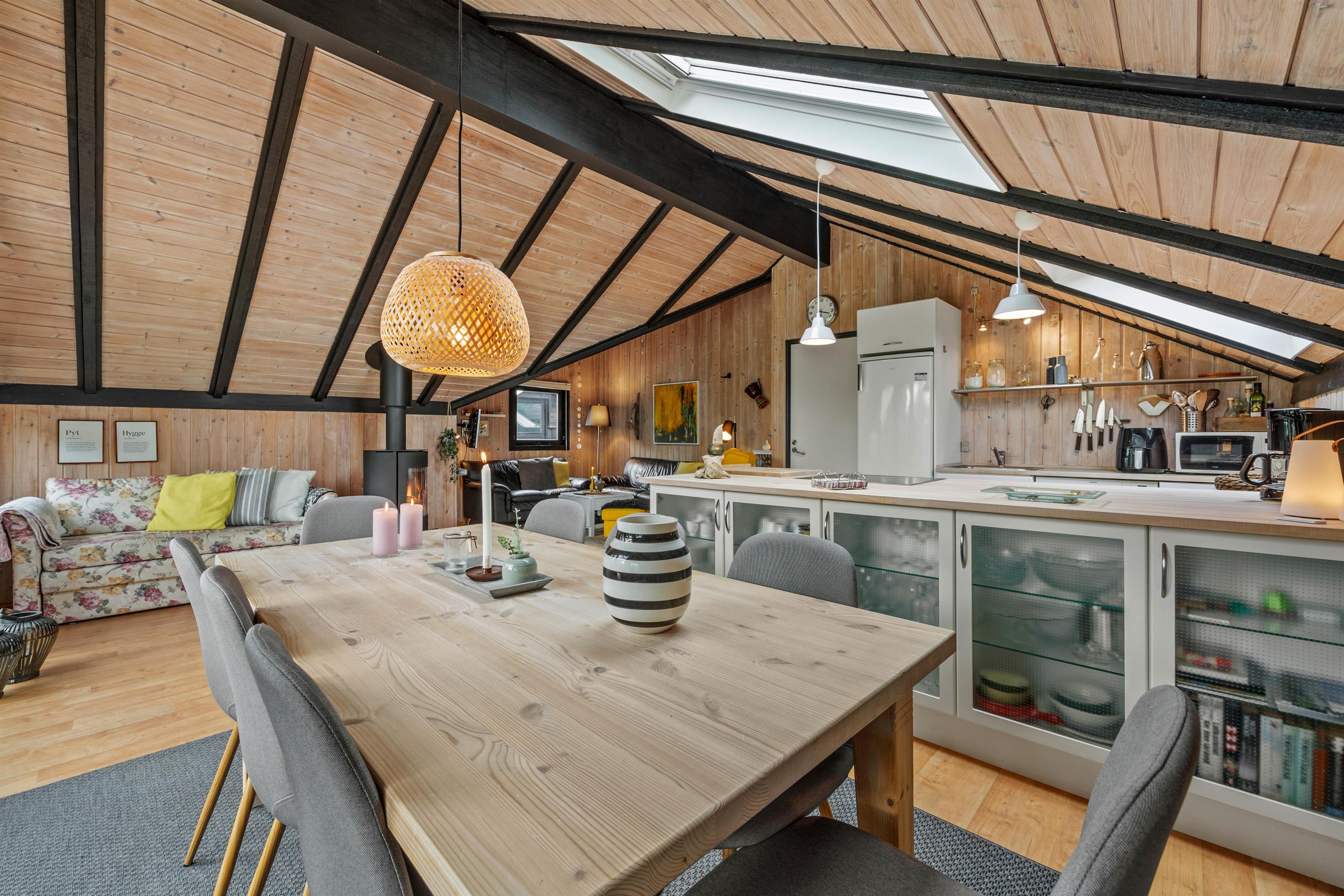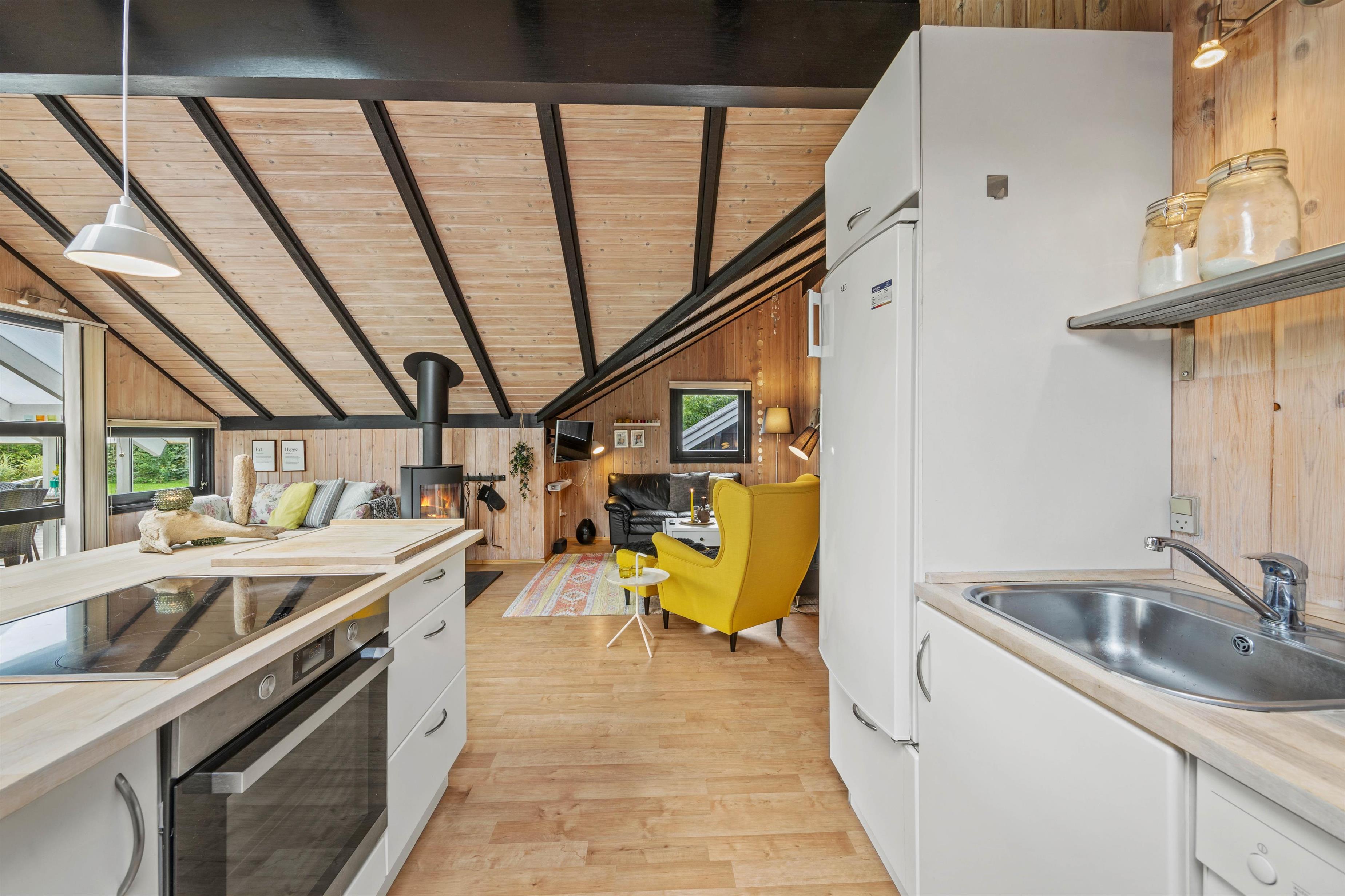Inde i sommerhuset finder I alle de nødvendige faciliteter for et behageligt ophold. Køkkenet er lyst indrettet, og den åbne planløsning med køkken, spisestue og stue giver mulighed for samvær under madlavningen. En opvaskemaskine i køkkenet gør det nemt at rydde op, så I hurtigt kan vende tilbage til hyggen. I stuen kan I slappe af foran brændeovnen og streame jeres yndlingsfilm og serier med Chromecast og der er også en tv-pakke med blandt andet 4 tyske kanaler.