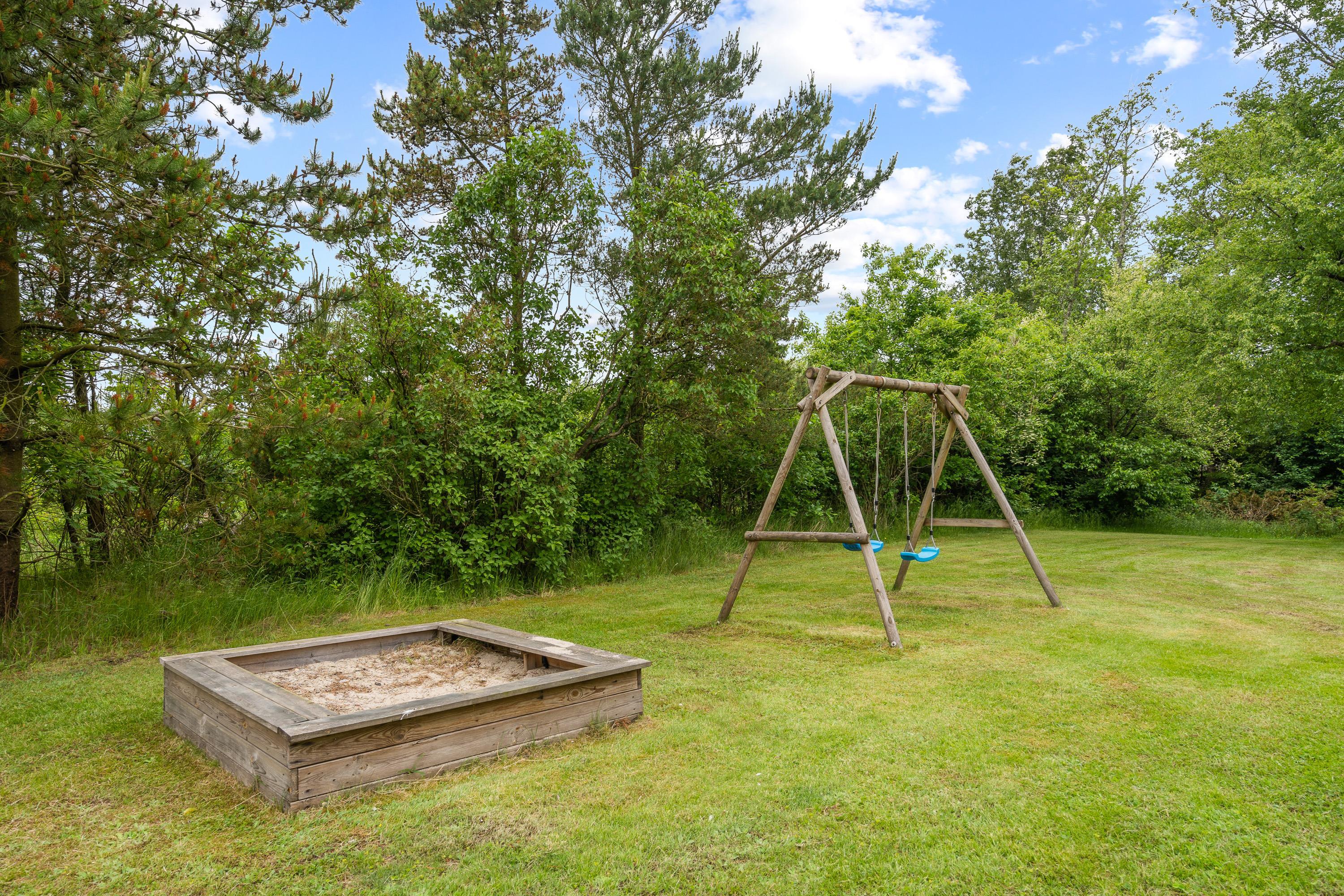 Sommerhusets grund er mere end 1.600 kvadratmeter stor, og her er der masser af plads for både store og små at boltre sig på. I haven er der tænkt på børnene, som både kan se frem til et gyngestativ og en sandkasse.