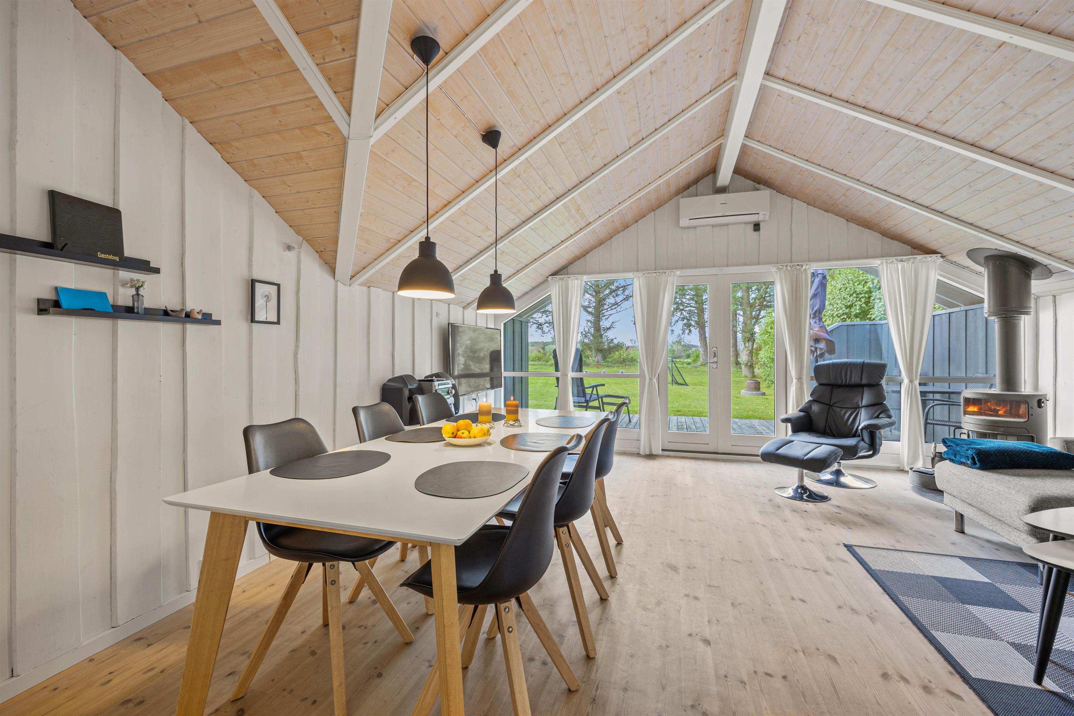 Sommerhusets hjerterum er hvor køkken og stue smelter sammen. Med højt til loftet, trænuancer og rolige farver er her en behagelig atmosfære. Her kan I hygge jer sammen, selvom nogle er i fuld gang med at tilberede feriens lækre måltider og andre slapper af på sofaen. Sæt jer godt til rette med popcornene og en god film eller måske en god bog i lænestolen.