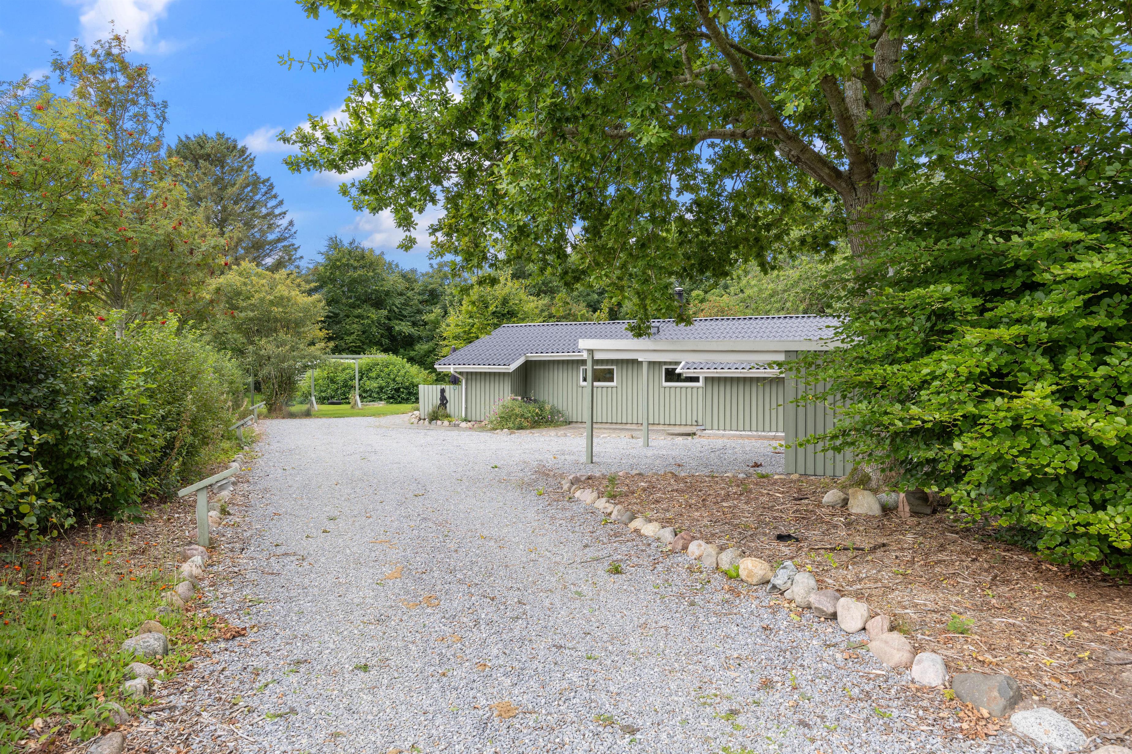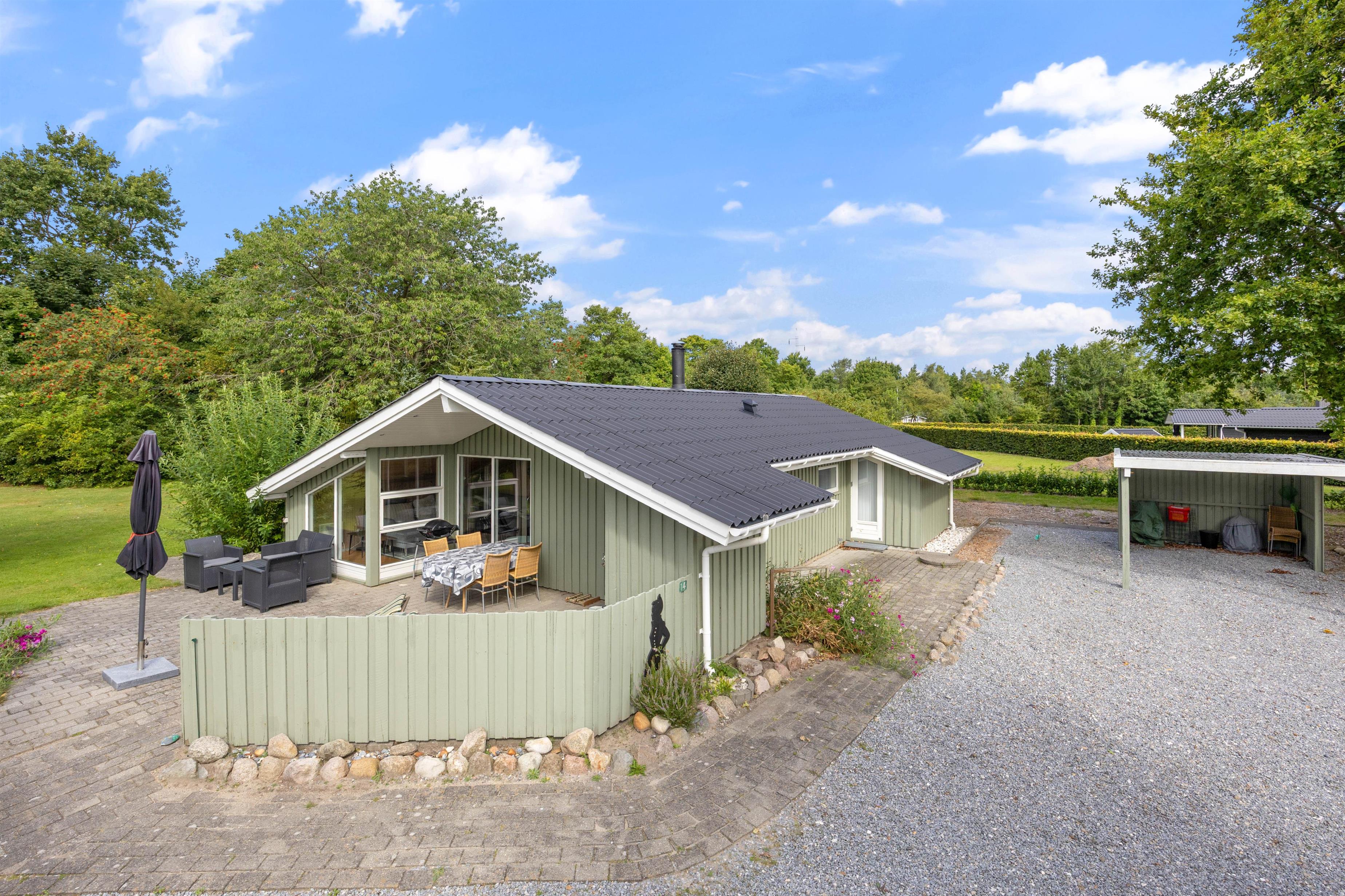 Terrassen, der både er åben, afskærmet og overdækket, tilbyder et alsidigt opholdssted, hvor I kan nyde herlige måltider tilberedt på den medfølgende gasgrill, uanset vejrets humør. Derudover sørger carporten for omsorgsfuld beskyttelse af bilen mod elementerne.