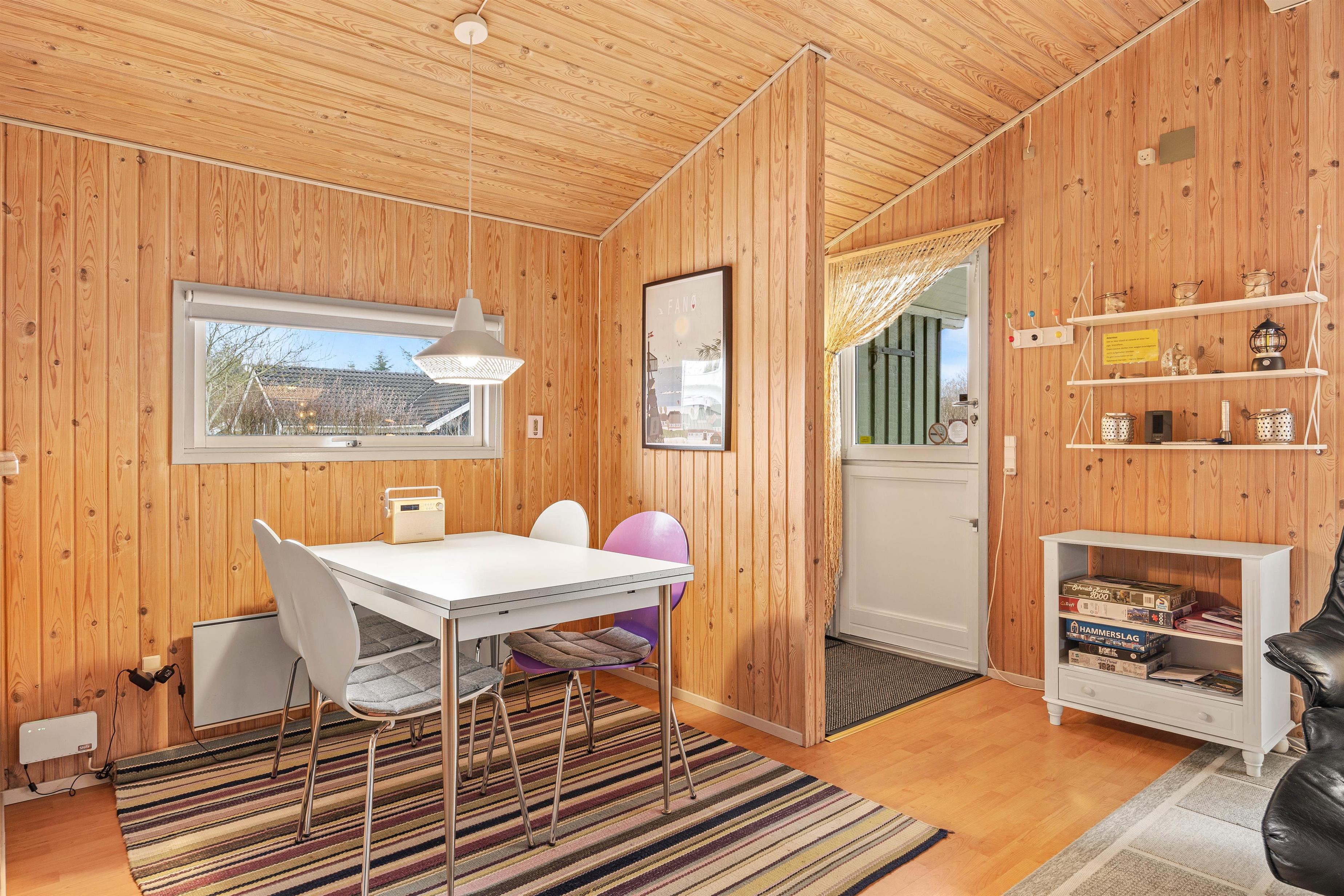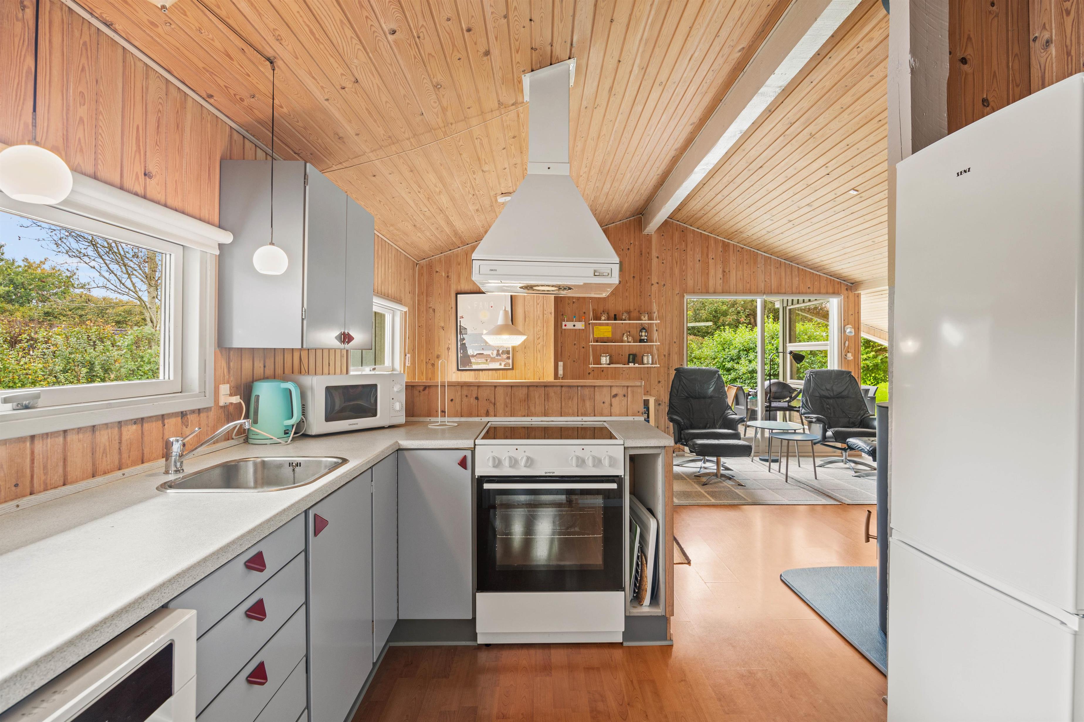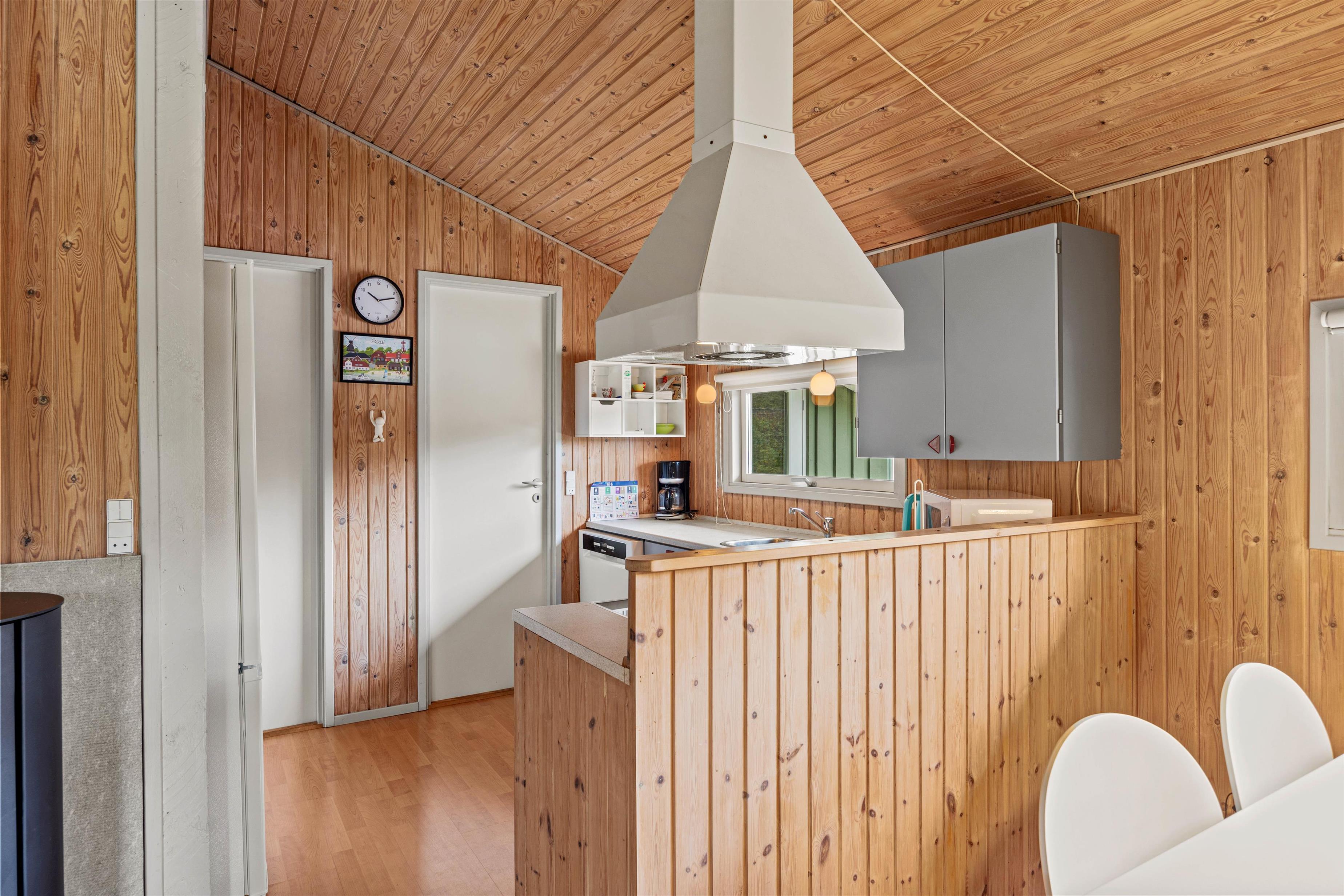 Indearealet i sommerhuset emmer af hygge og komfort. I stuen finder I en charmerende brændeovn, der spreder en varm og indbydende atmosfære, perfekt til kølige aftener. Det stilrene køkken er udstyret med en opvaskemaskine, hvilket gør oprydningen til en leg og giver jer mere tid til at nyde jeres ferie.
