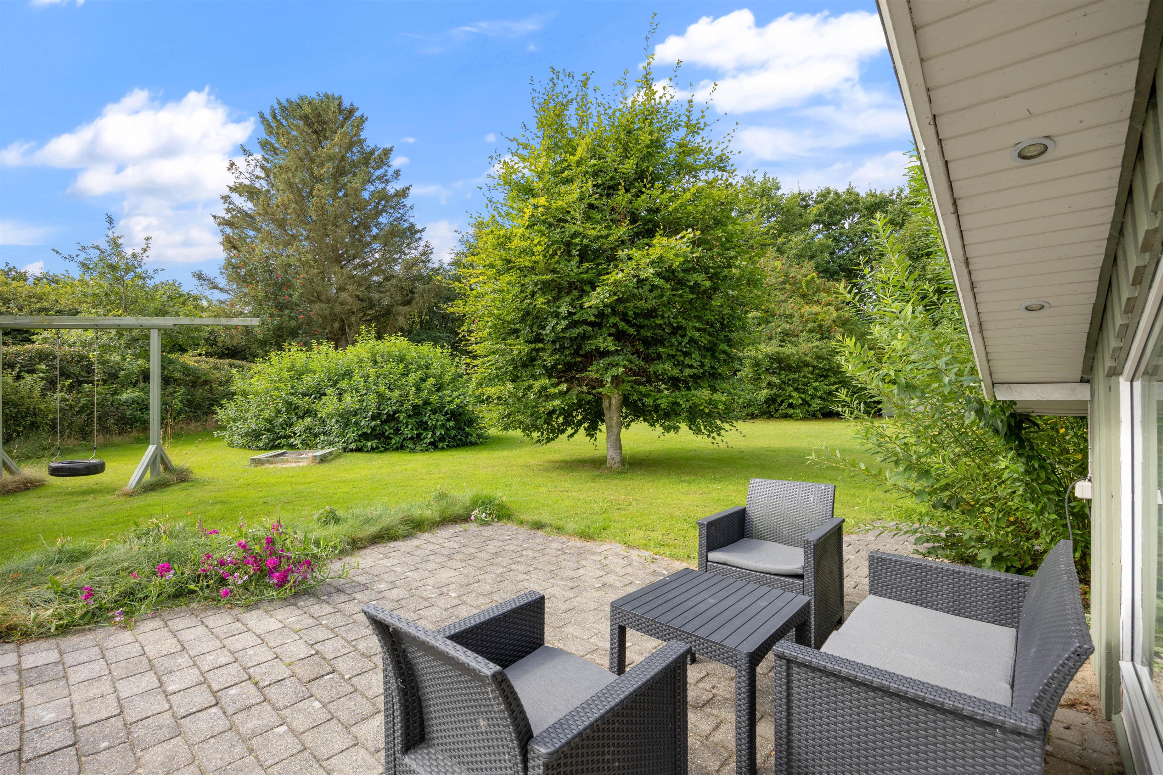Udemiljøet omkring sommerhuset er en indbydende ramme for afslapning og hyggeligt samvær. Den indhegnede plænegrund er perfekt for både børn og kæledyr, som kan boltre sig frit og trygt. De mindste kan have sjov i sandkassen eller få en tur på gyngen, mens I nyder haven.