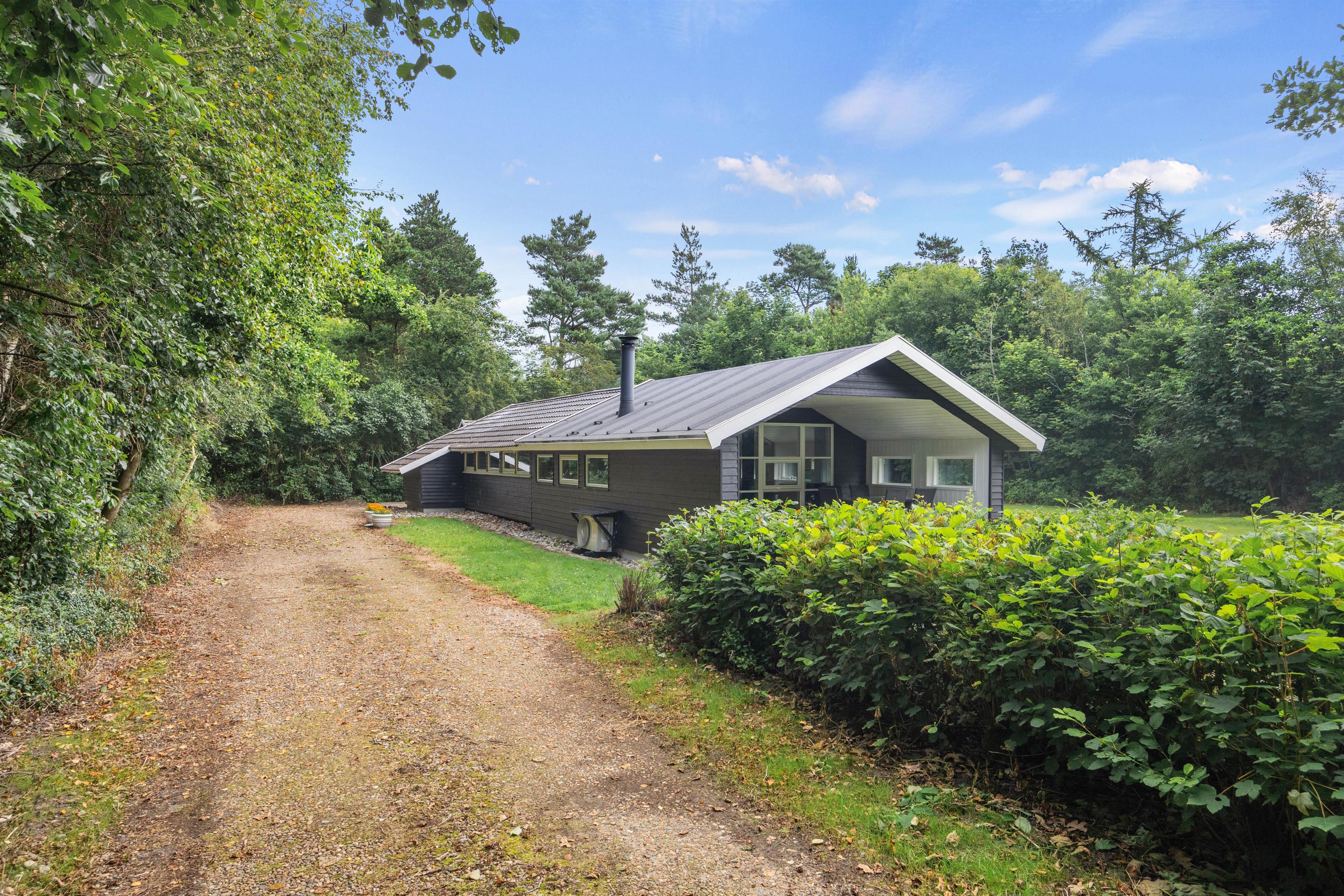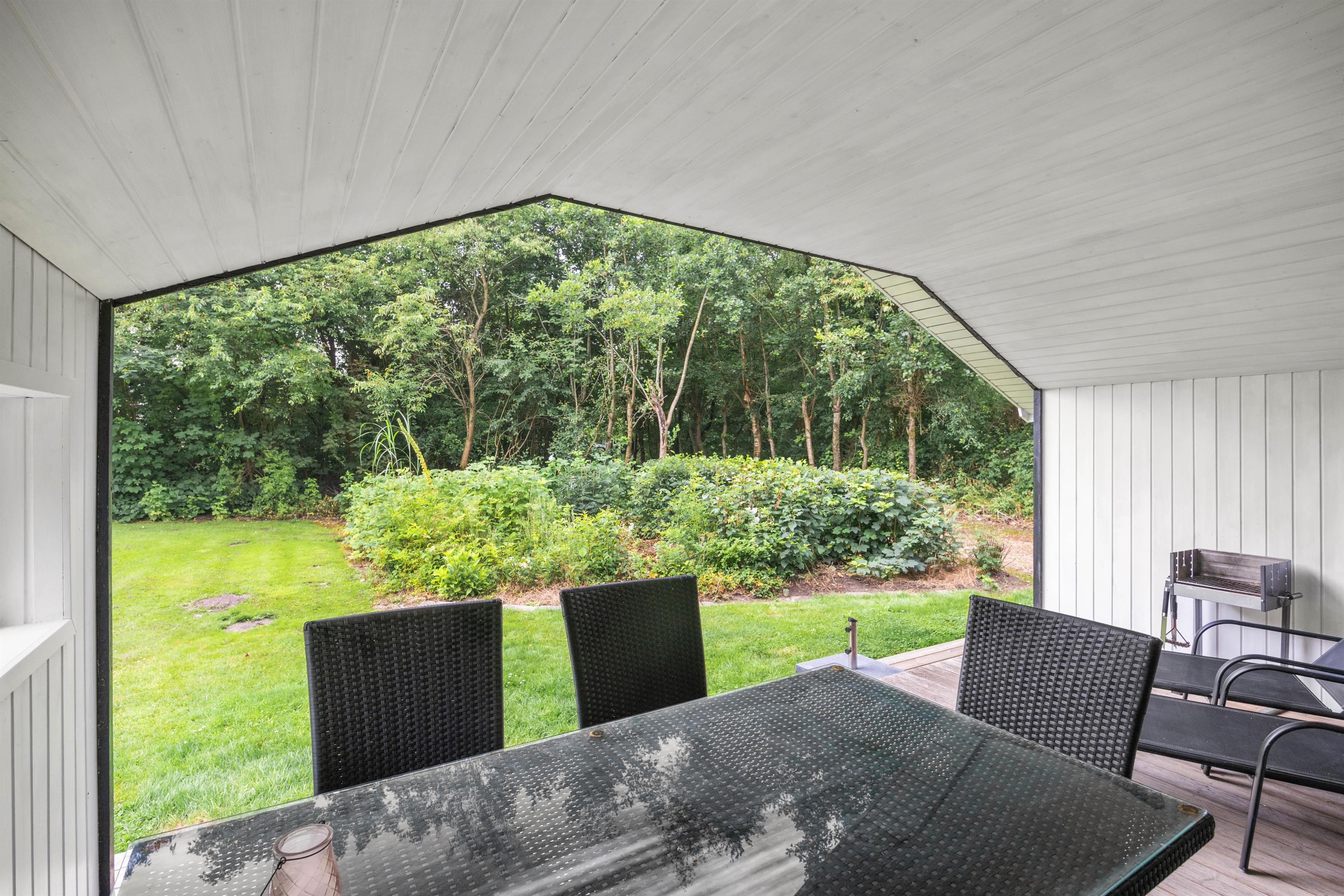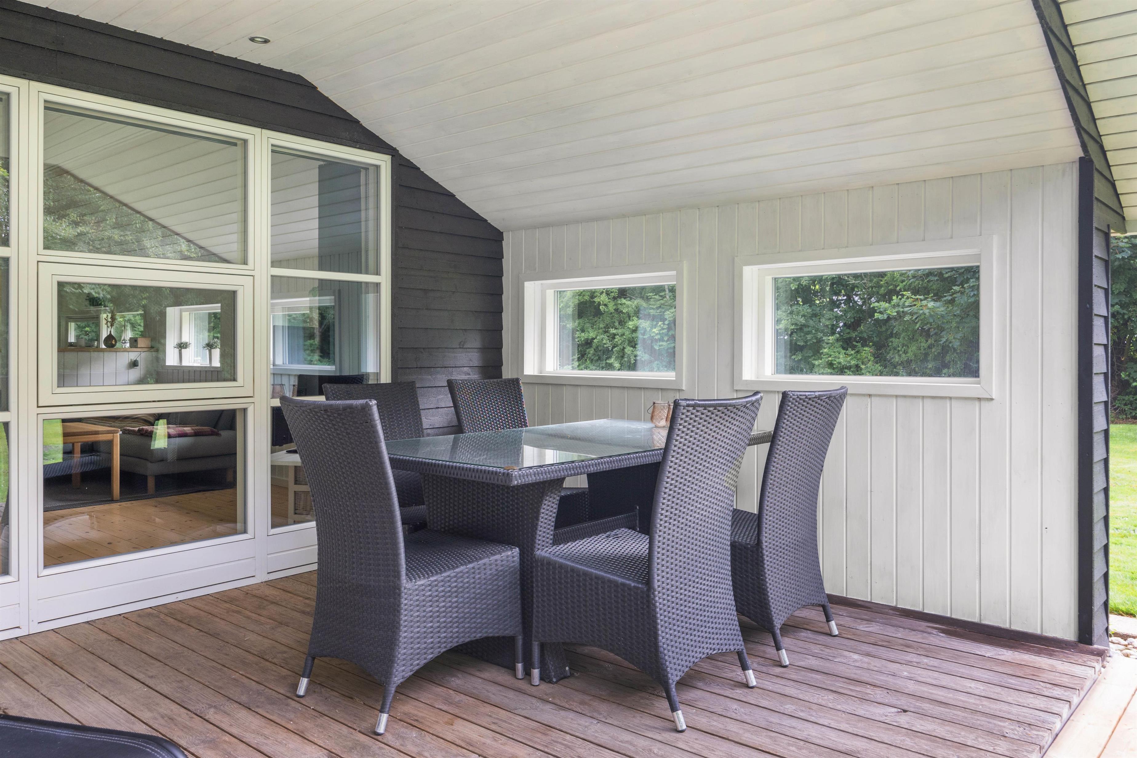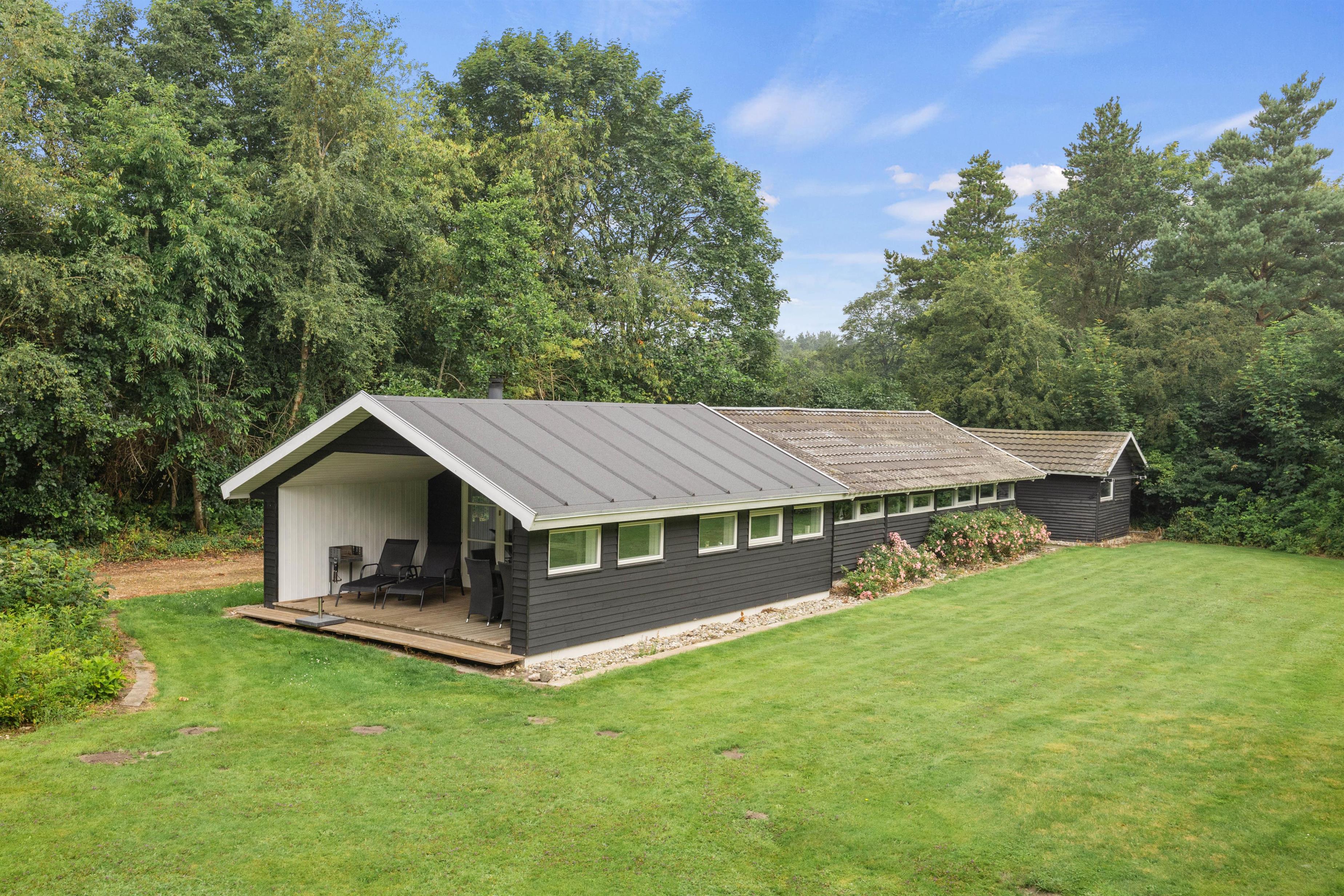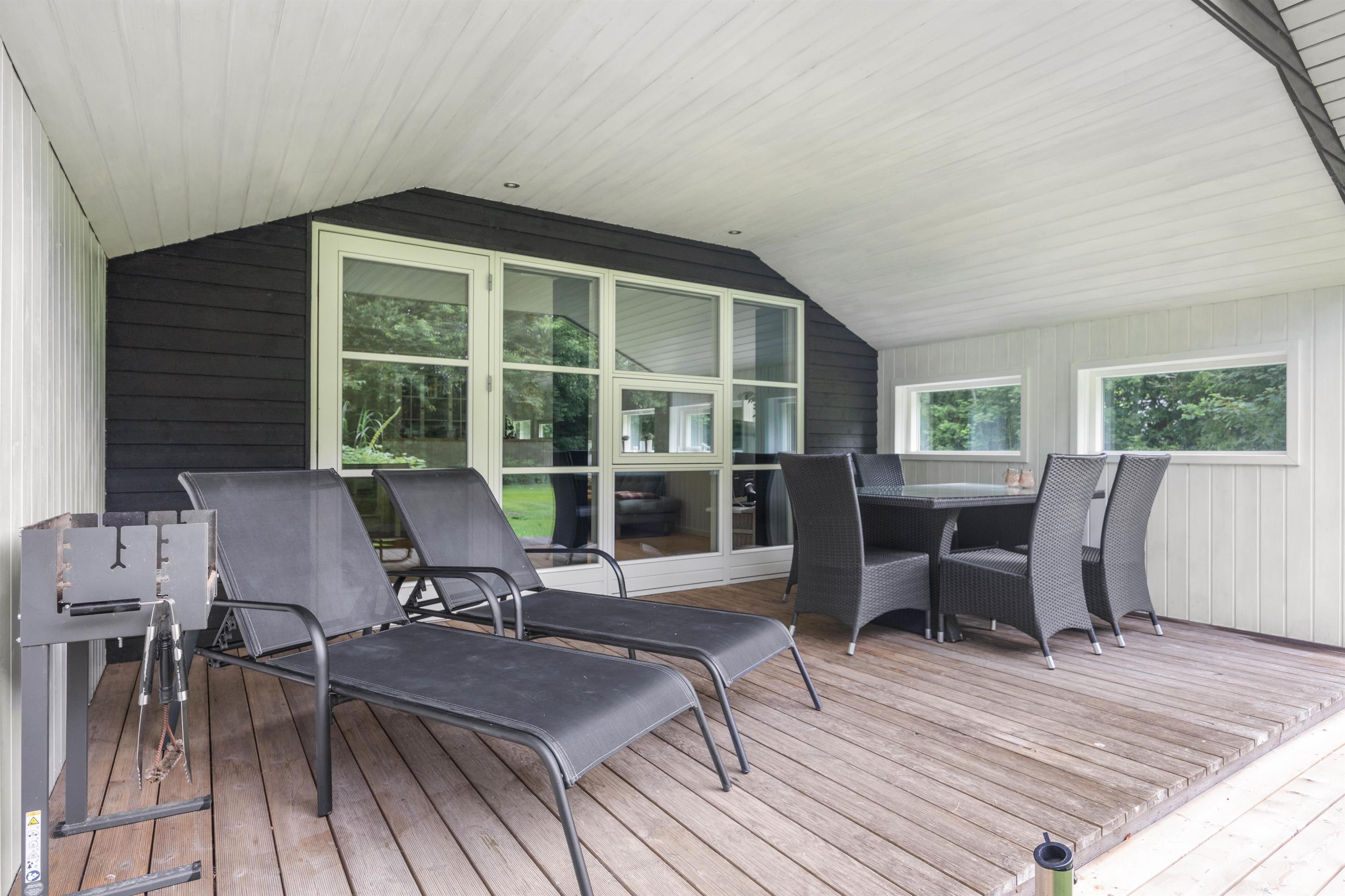 Udenfor er der god plads til leg for børnene på den grønne plæne og mulighed for skønne grillaftener under den delvist overdækkede terrasse, der tillader udeliv året rundt. Store vinduer sikrer masser af naturligt lys, mens den varme brændeovn skaber hyggelige omgivelser indendørs.