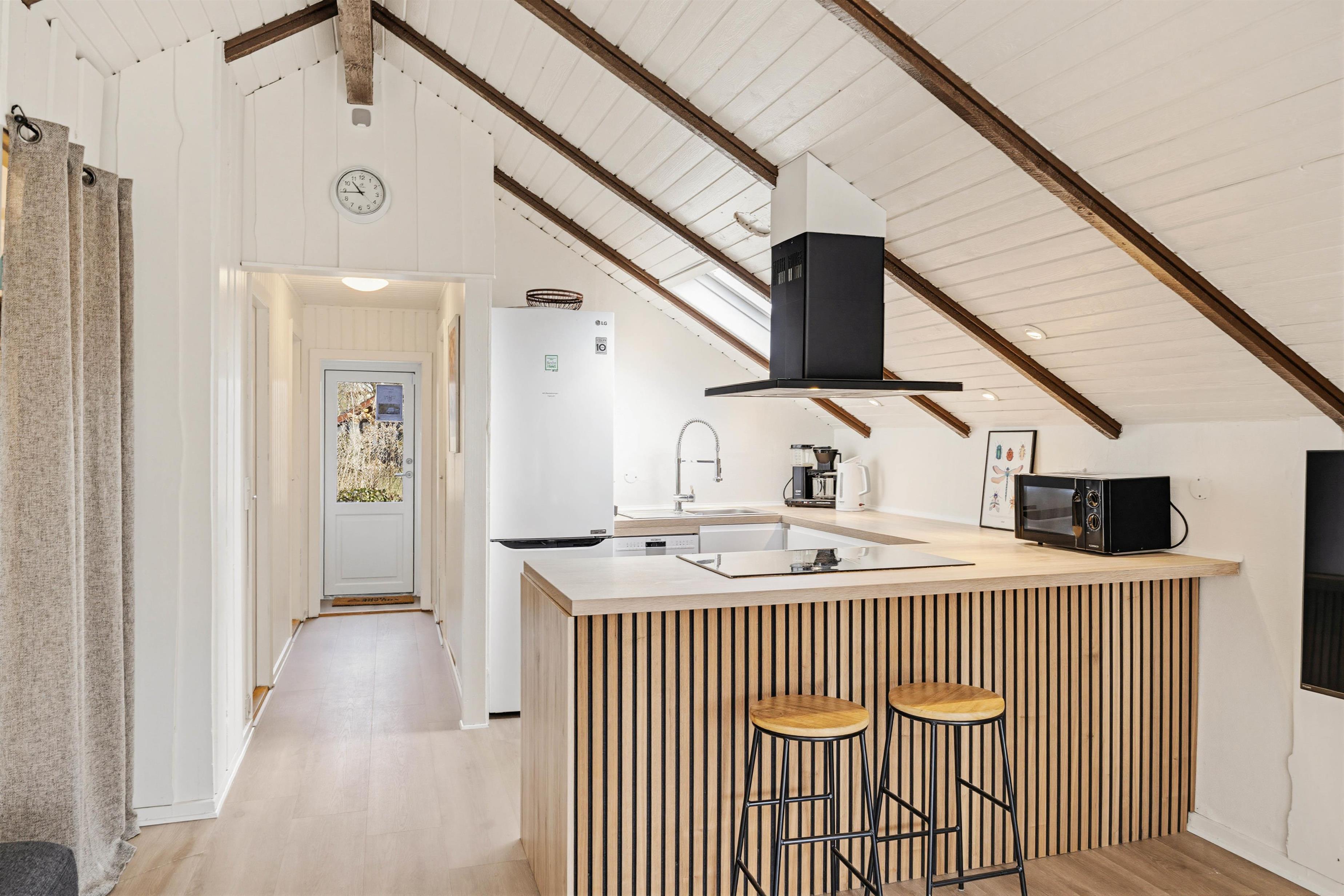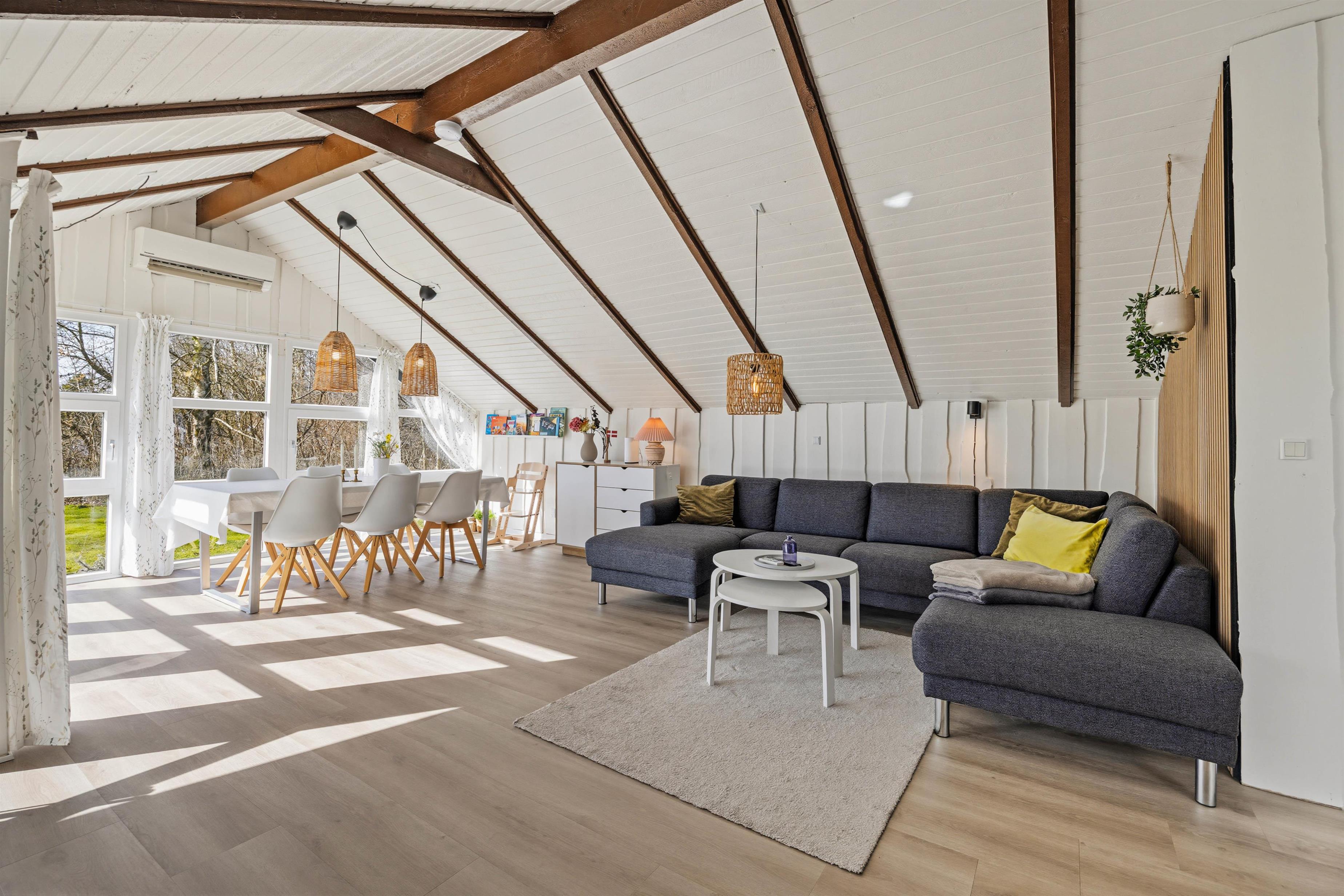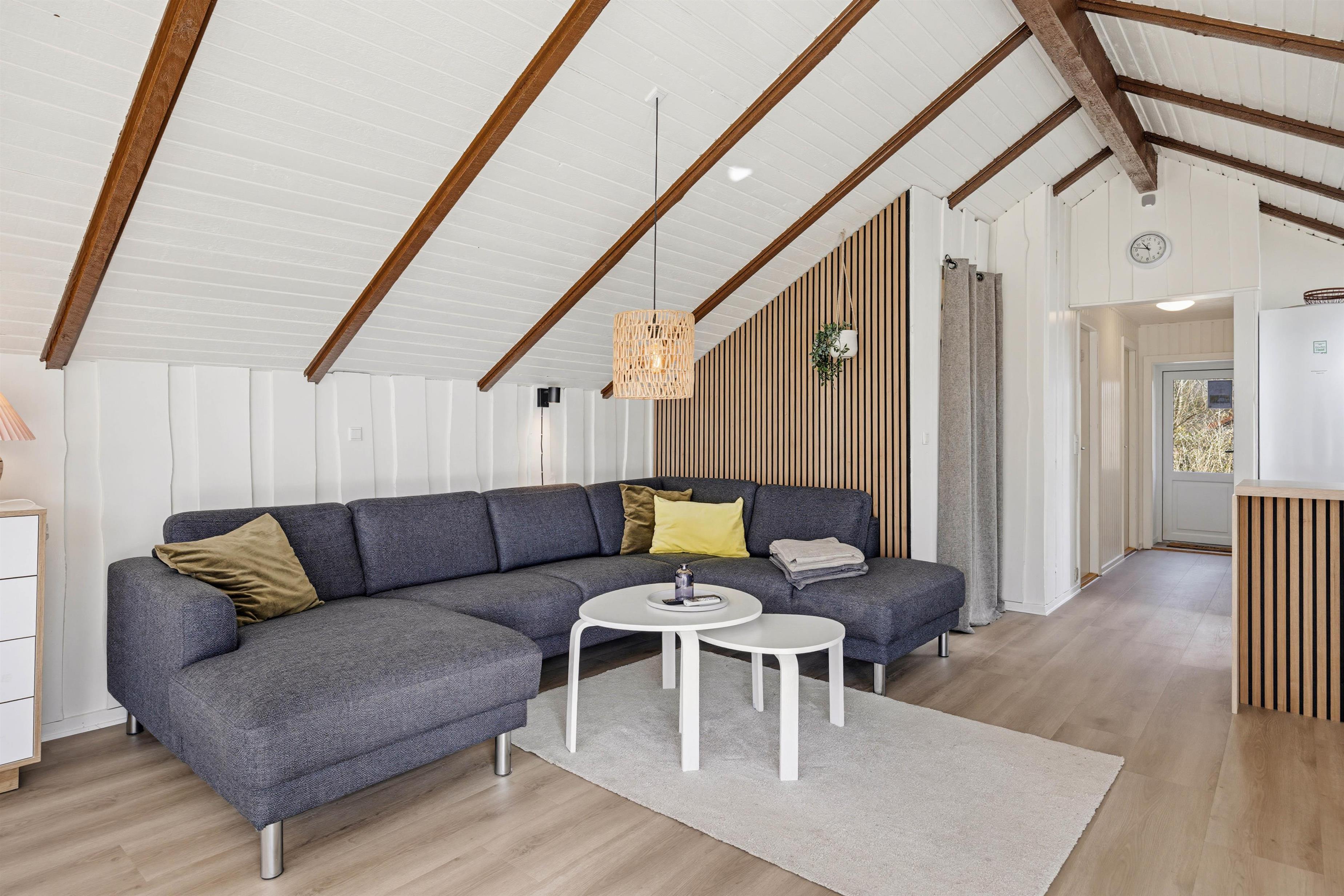 Indenfor er feriehuset lyst og hyggeligt indrettet med et dejligt opholdsrum, hvor naturligt lys skaber en varm og behagelig atmosfære. I stuen finder du en hyggelig pejs, som indbyder til afslappende aftener.