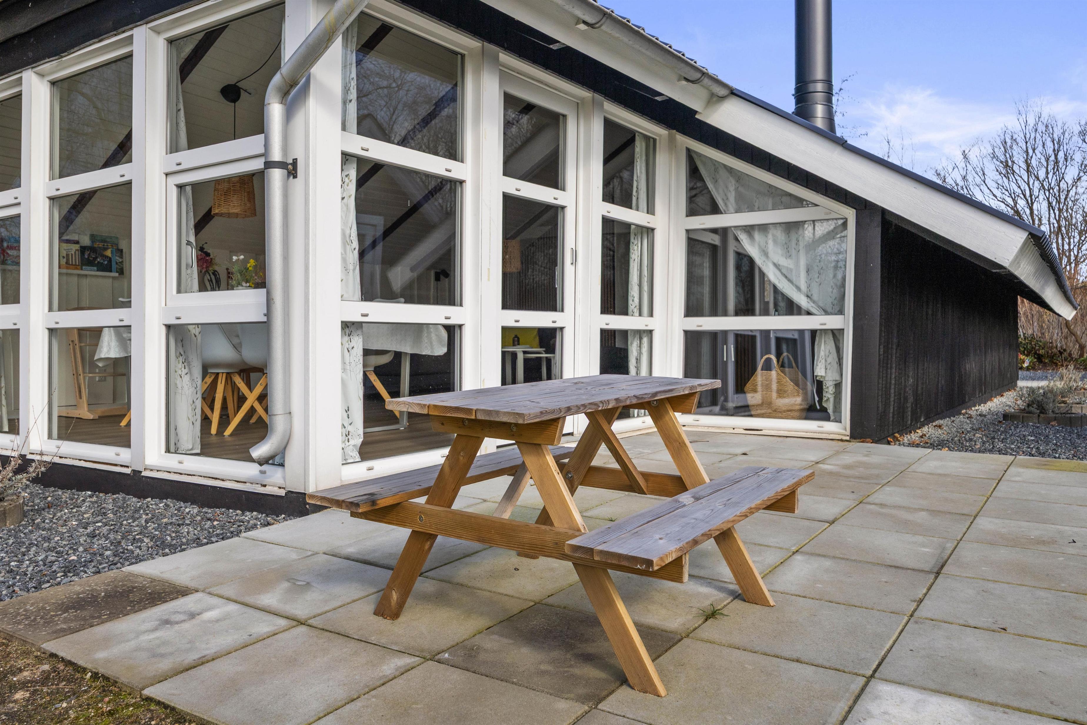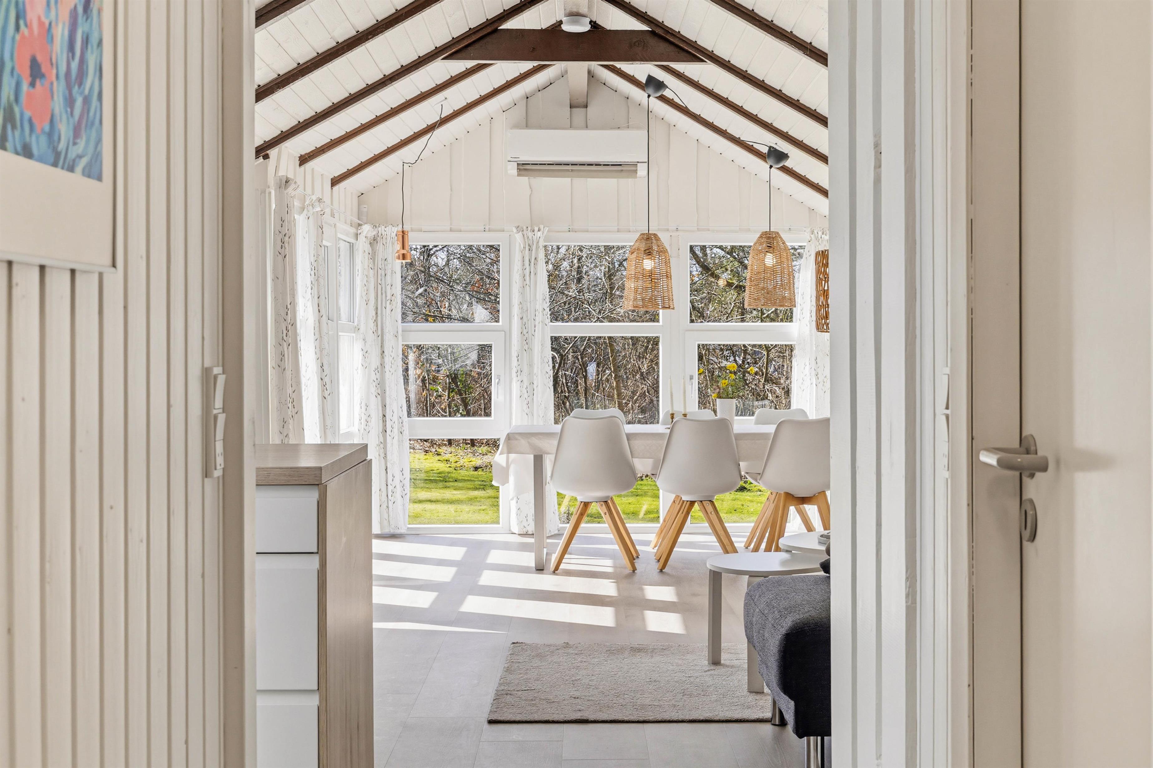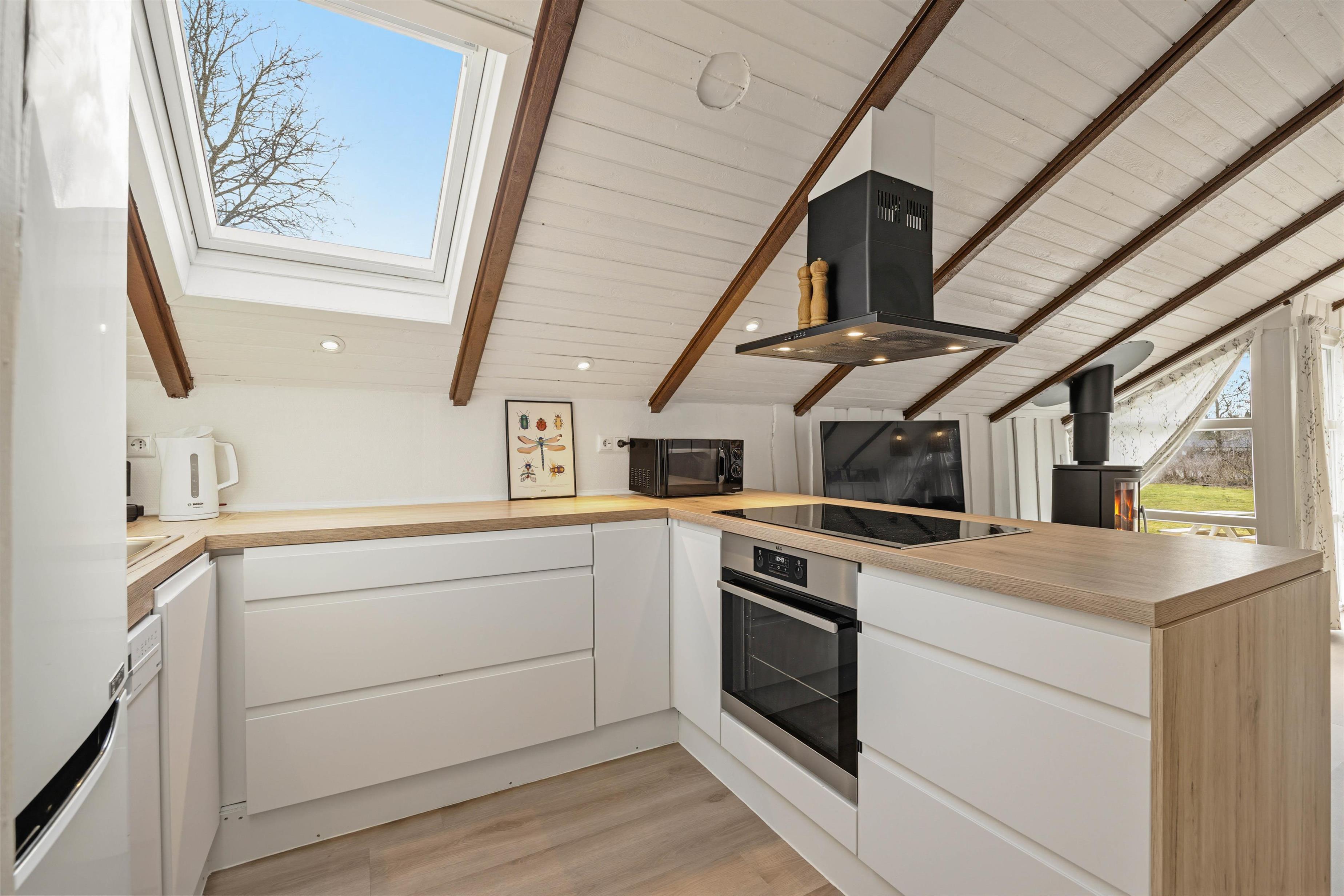 Indenfor er feriehuset lyst og hyggeligt indrettet med et dejligt opholdsrum, hvor naturligt lys skaber en varm og behagelig atmosfære. I stuen finder du en hyggelig pejs, som indbyder til afslappende aftener.