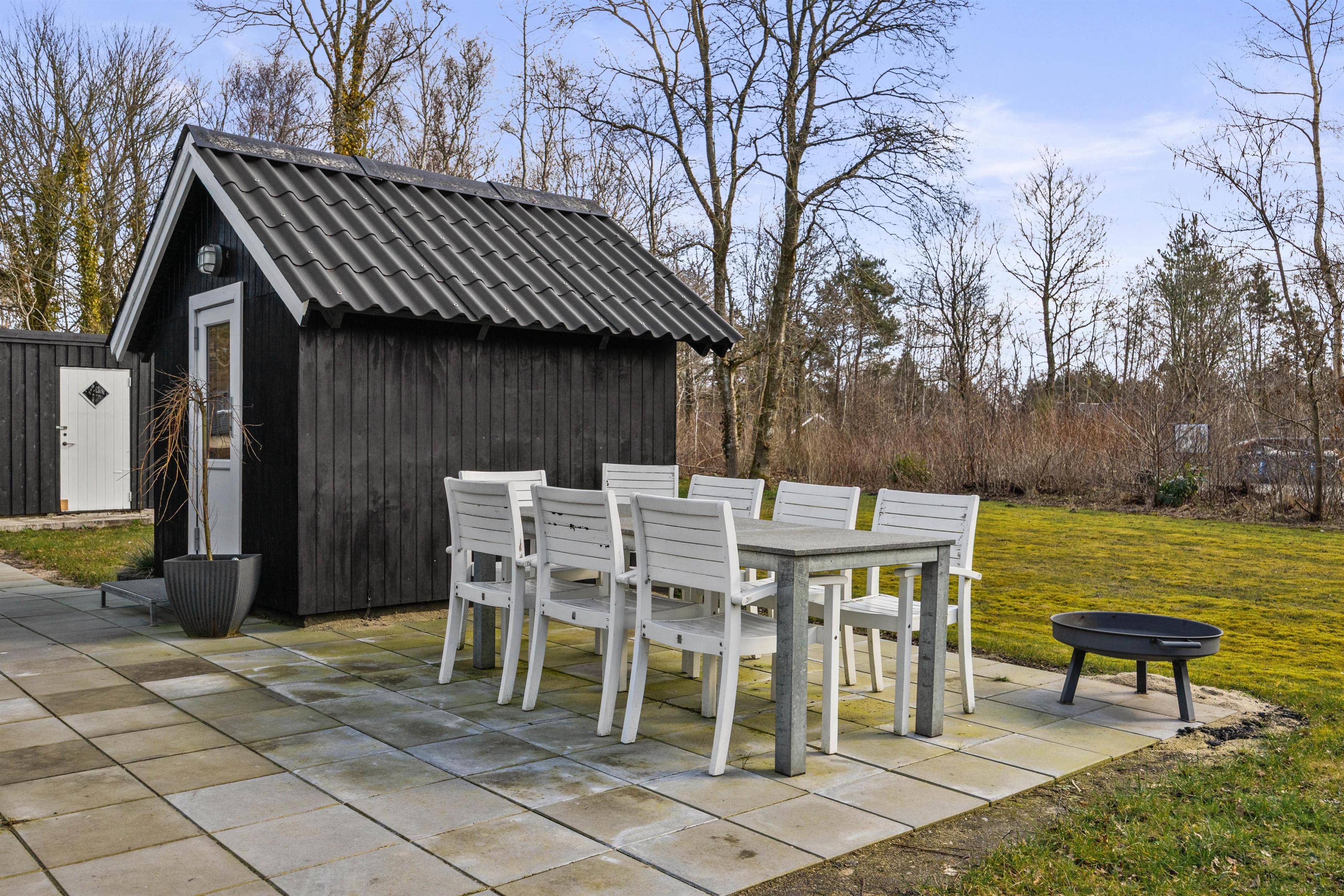 Grunden er på 1.519 m² og byder på både græsplæne og naturskønne omgivelser. Her er god plads til leg og afslapning – børnene kan bevæge sig frit, mens de voksne nyder de rolige rammer. Et redskabsskur giver praktisk opbevaringsplads til udstyr.