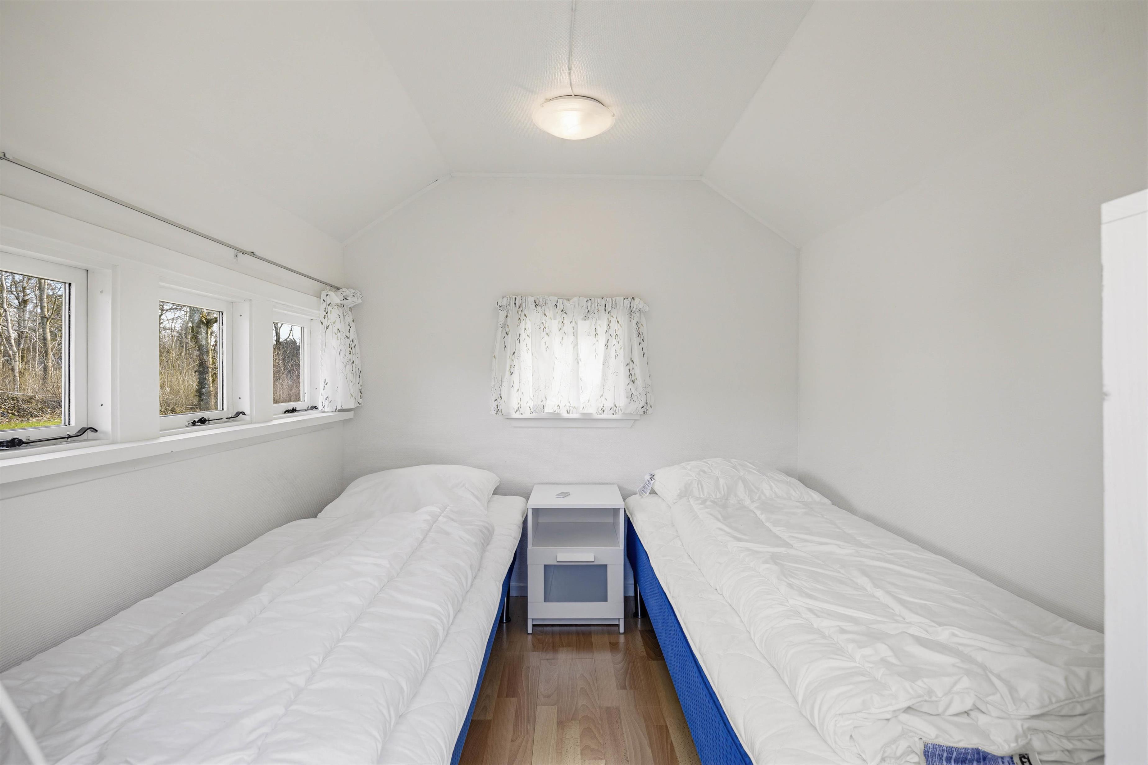 Feriehuset rummer 2 soveværelser: ét med dobbeltseng og ét med både dobbeltseng og enkeltseng – perfekt til børn, der gerne vil dele værelse. Derudover er der et anneks med 2 enkeltsenge, som giver ekstra plads til teenagere eller gæster, der ønsker lidt privatliv.