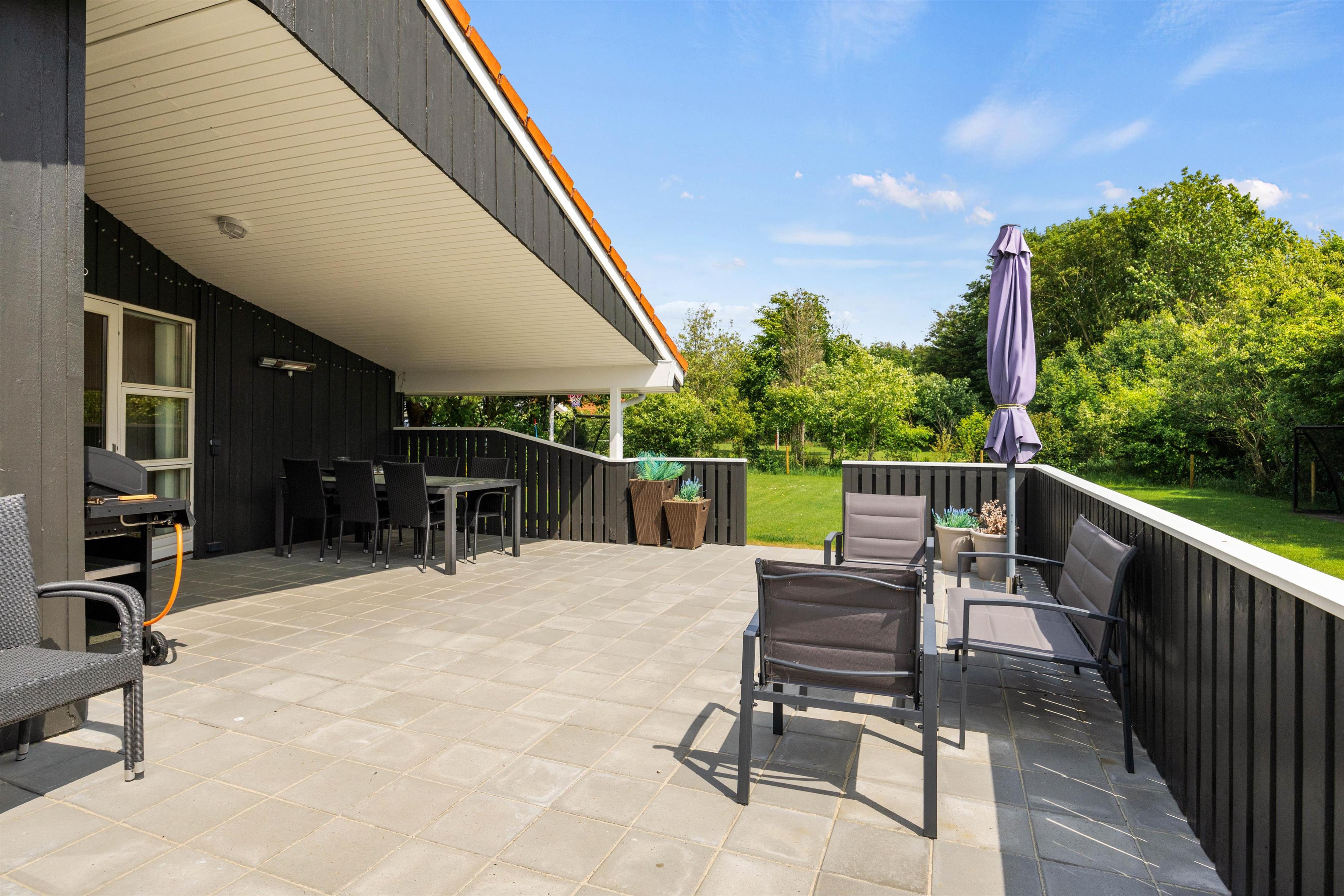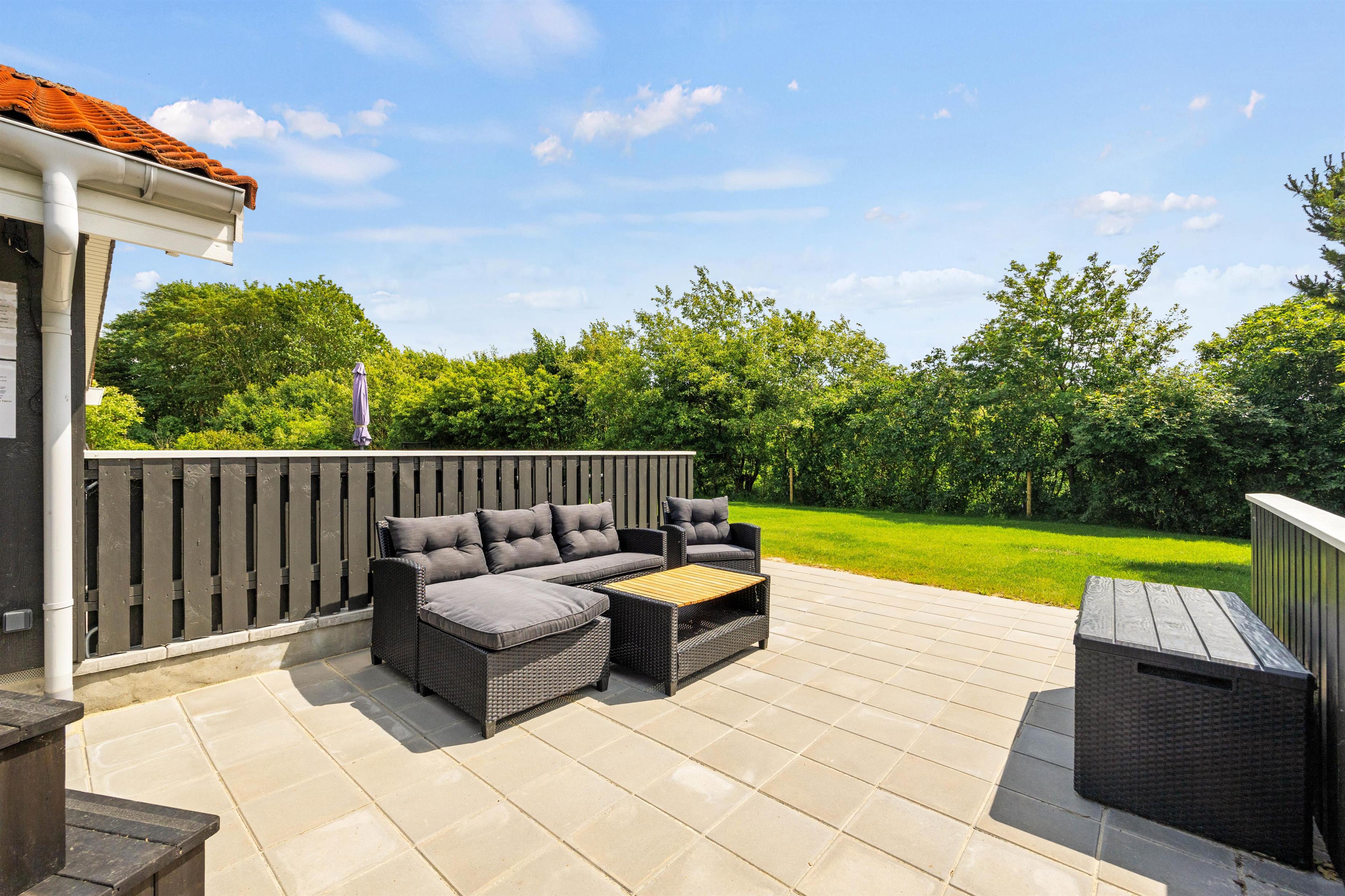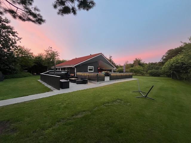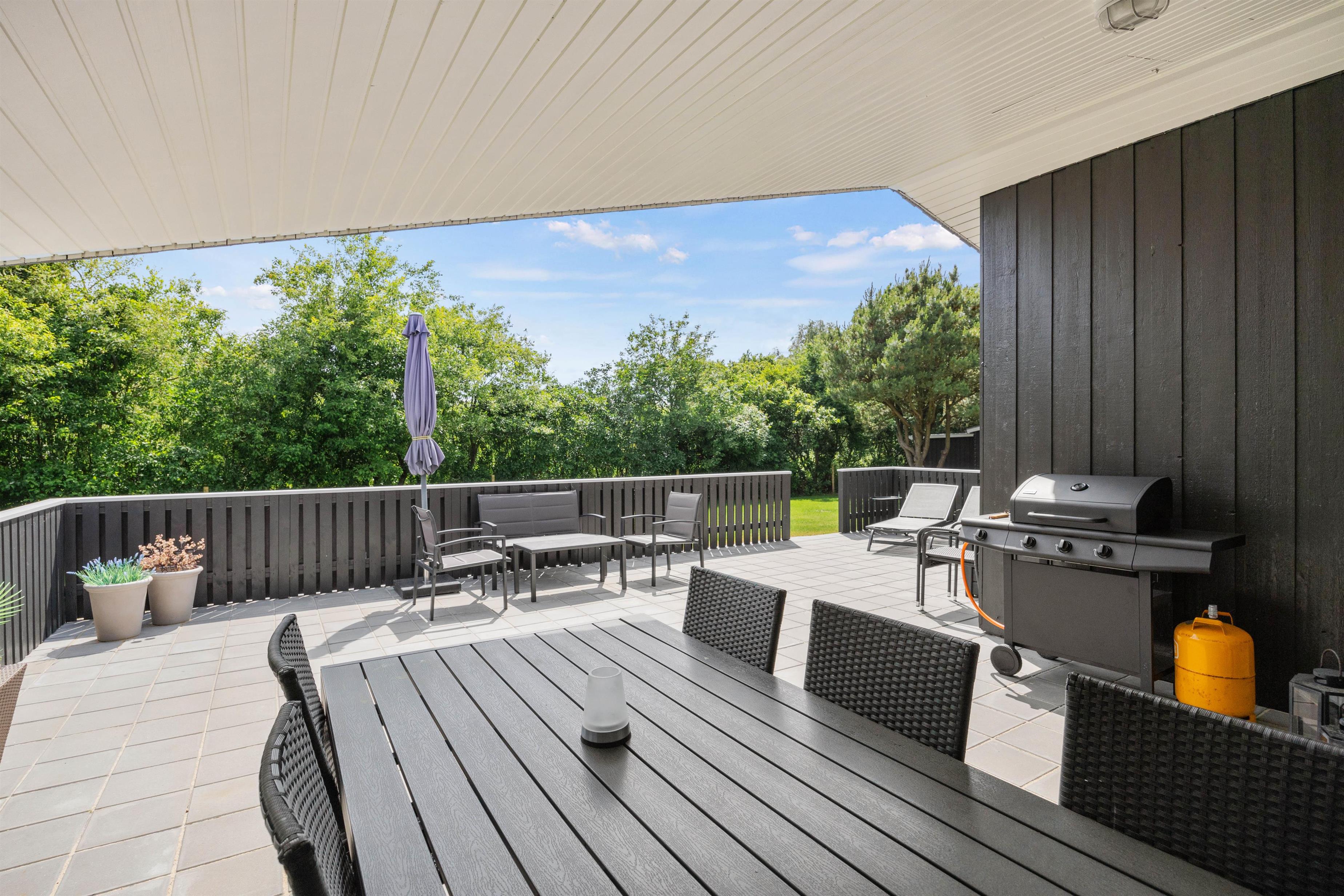 Fra stuen kan I træde ud på den overdækkede terrasse, som forlænger opholdsrummet ud i det fri og giver mulighed for at nyde frisk luft i al slags vejr. Udearealerne er indbydende med en afskærmet terrasse, hvor I uforstyrrede kan nyde måltider ved grillen og slappe af i havemøblerne. For at fuldende oplevelsen kan I også synke ned i det indbydende vildmarksbad for en perfekt afslutning på dagen.