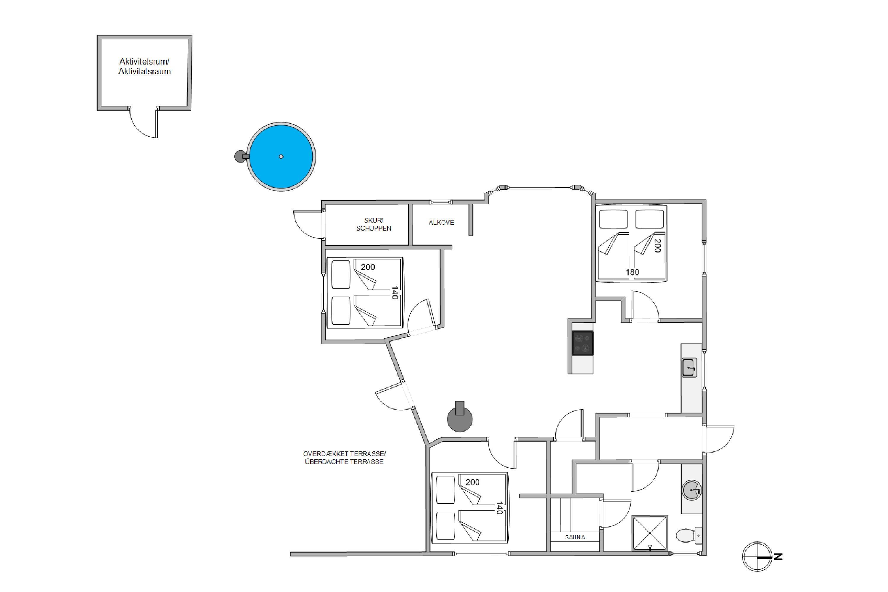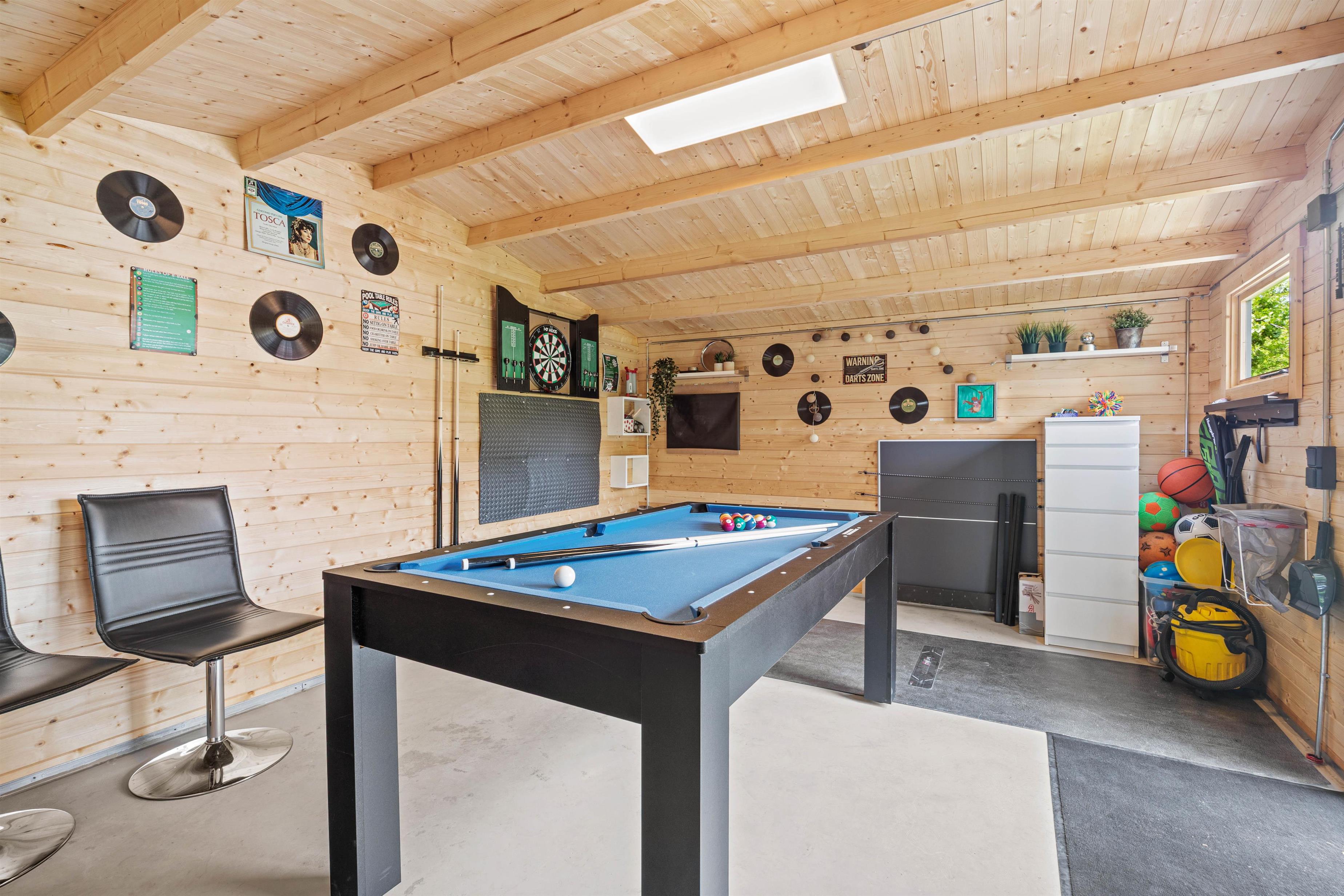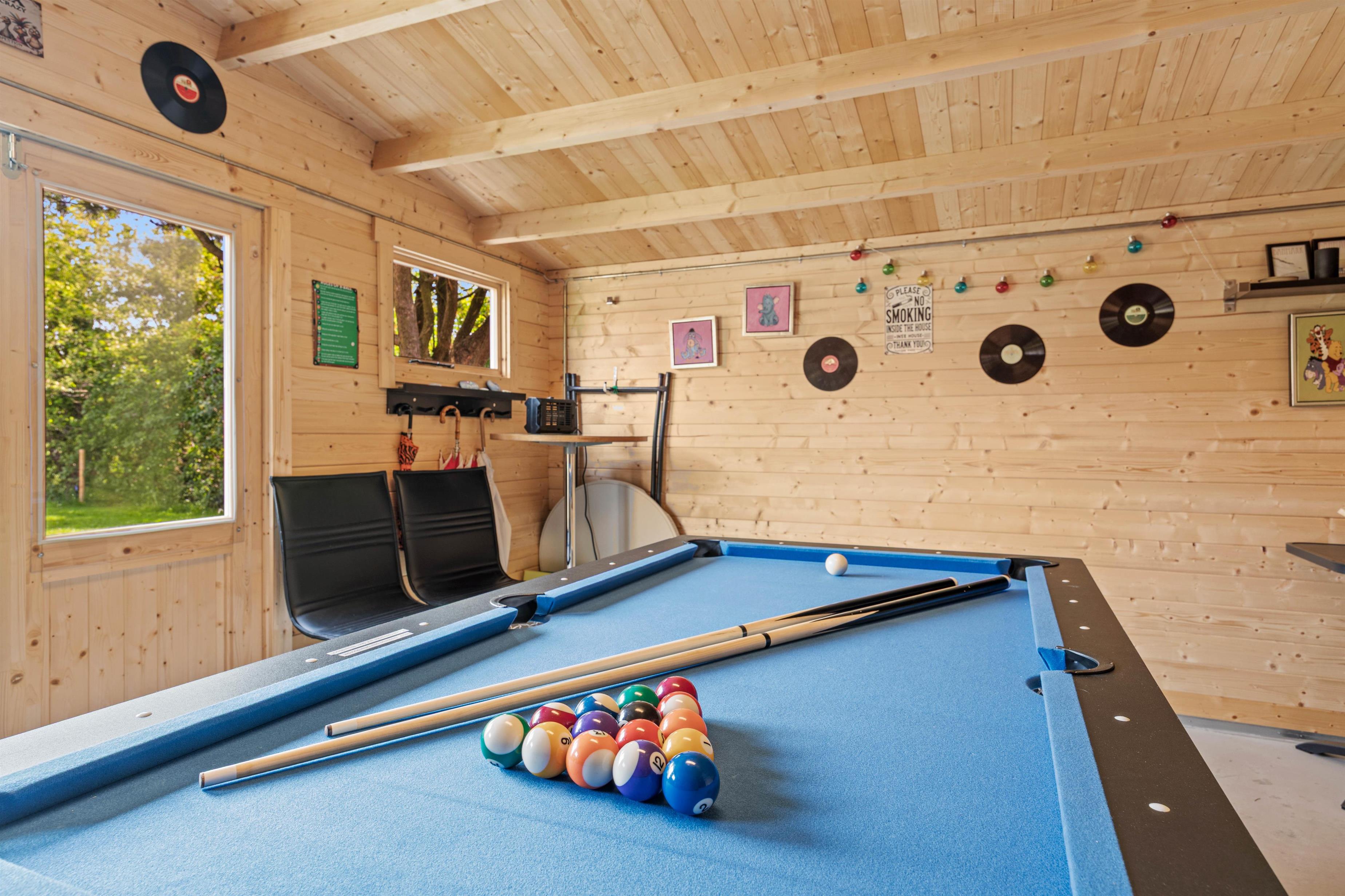 Lige ved siden af sommerhuset finder I en hyggelig hytte fyldt med indendørsaktiviteter. Et poolbord, der også kan bruges som bordtennisbord, er ideelt til mange timers sjov og konkurrence. Dartspillet står klar til at teste jeres præcision, og der er rigeligt med mulighed for at sidde sammen omkring poolbordet, hvor der kan lægges en plade på, for at spille det brede udvalg af brætspil.