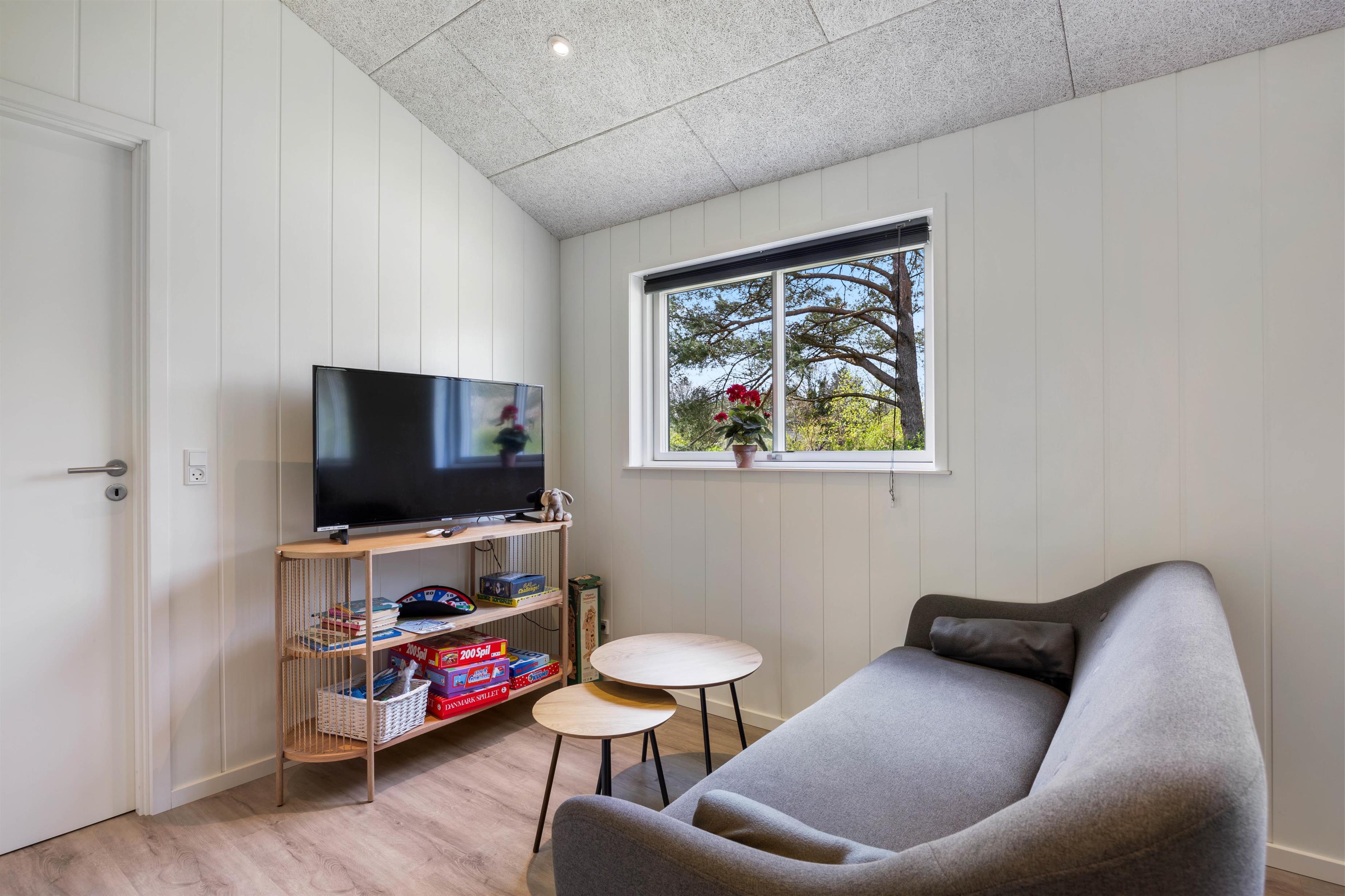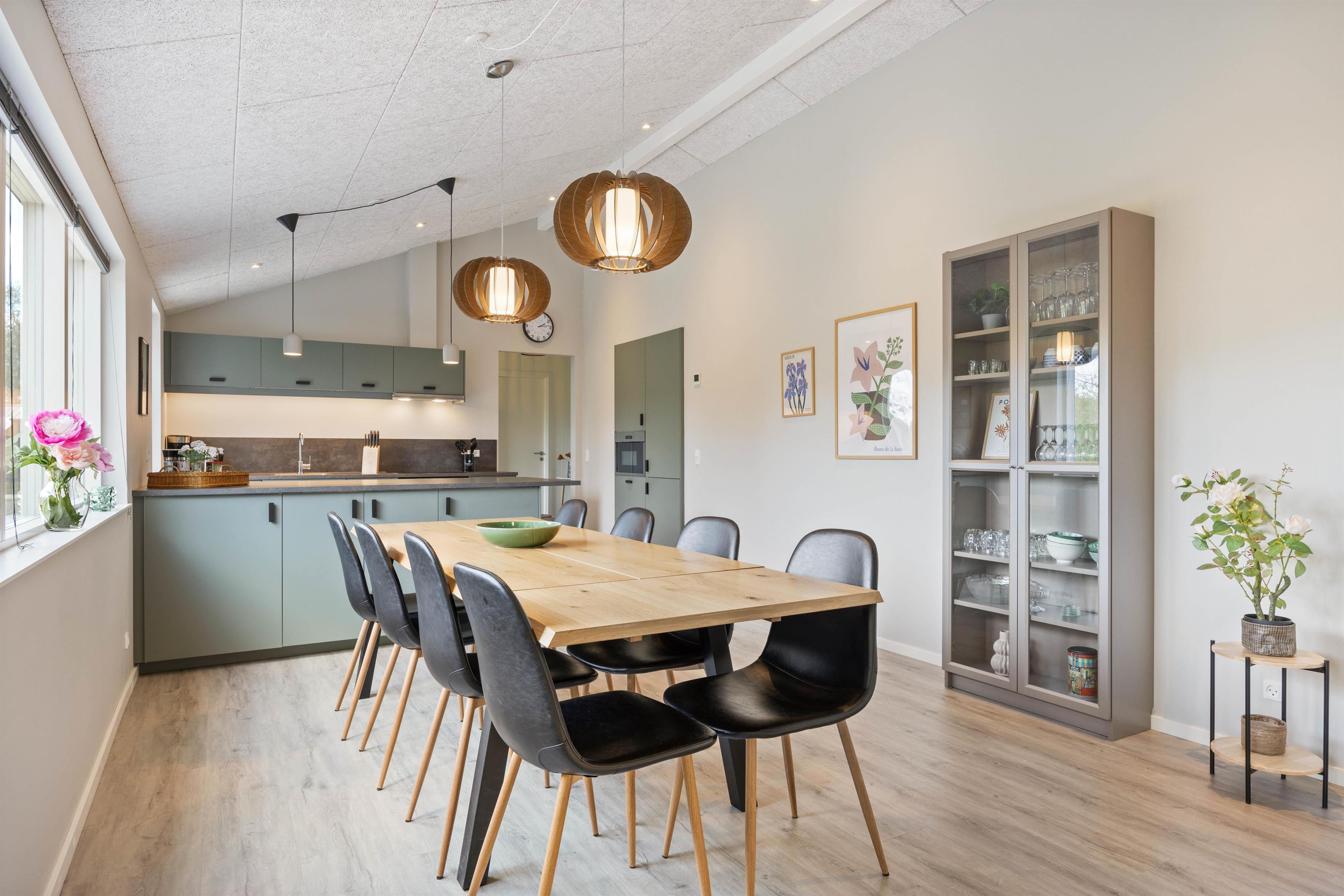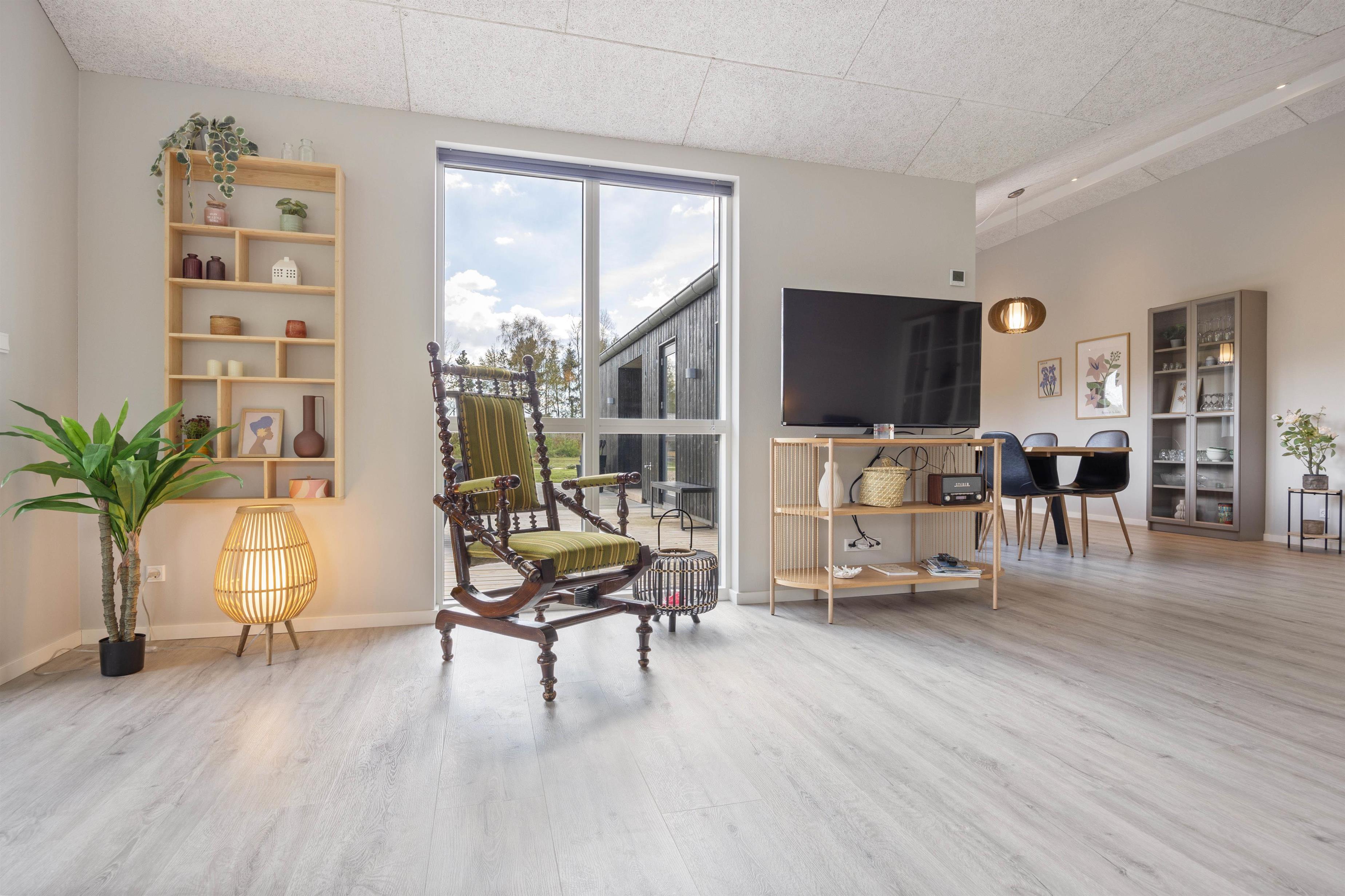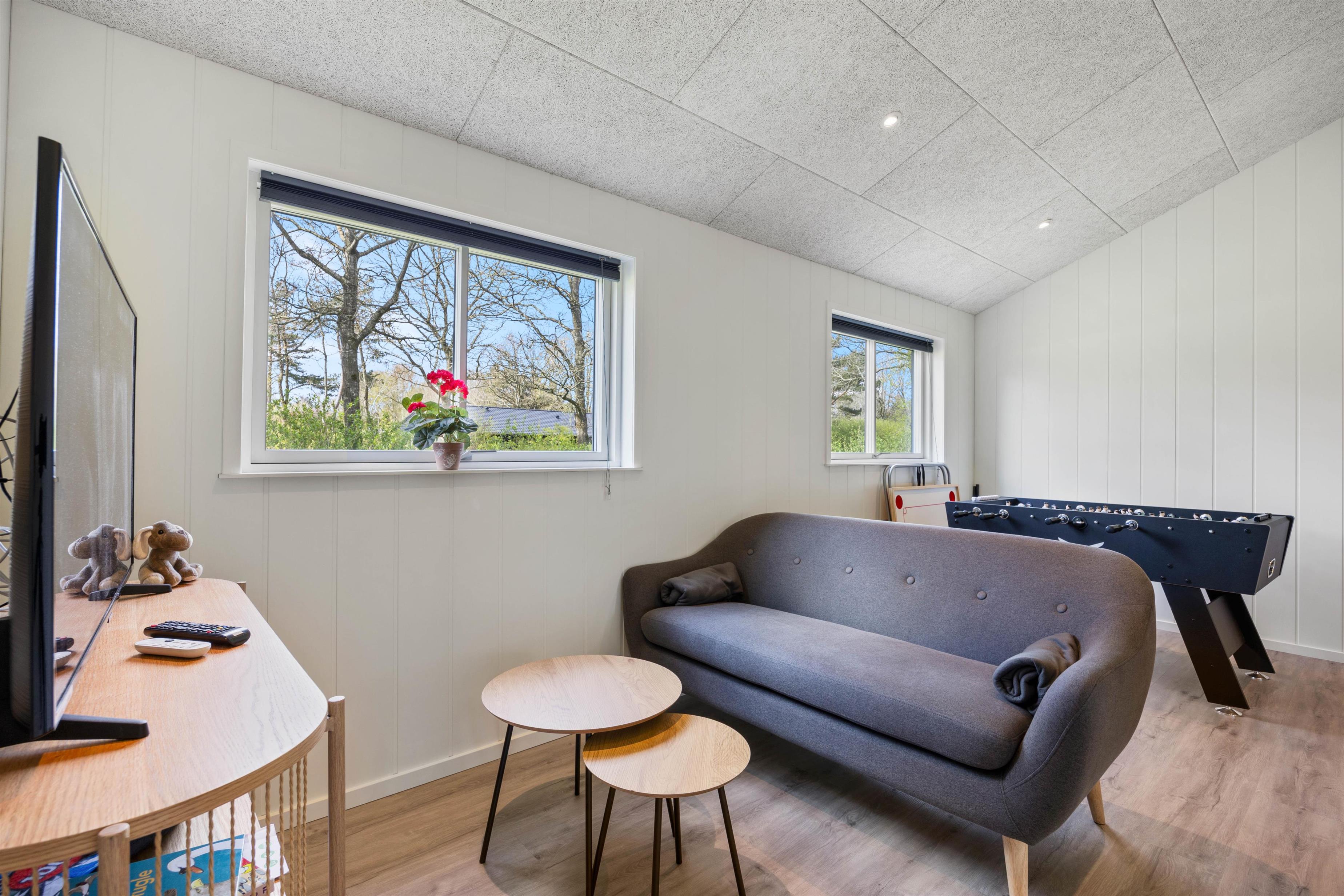 Hjertet af sommerhuset er det store vinklede køkkenalrum, hvor stuen ligger i forlængelse. Ligesom i resten af feriehuset er her en smagfuld indretning, og gennem de store vinduespartier strømmer dagslyset ind. Her kan I grine sammen, lave dejlig mad i det funktionelle køkken og læse en god krimi i en af de behagelige lænestole. Fra stuen kan I hurtigt tilgå aktivitetsrummet, hvor I kan udfordre hinanden i bordfodbold. Også her er der en hyggelig sofakrog, hvor I kan lave jeres egen mini-biograf med en god film og popcorn.