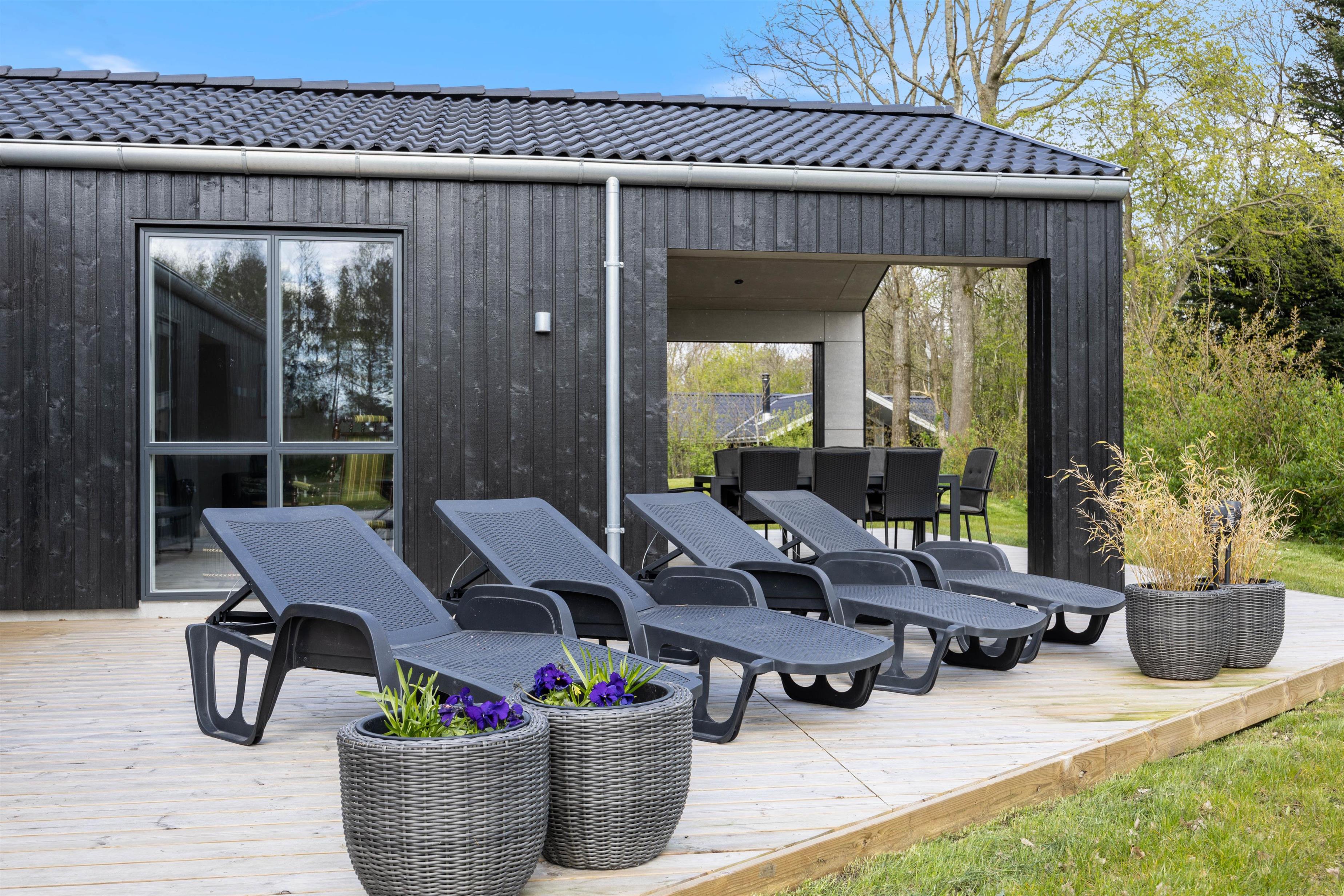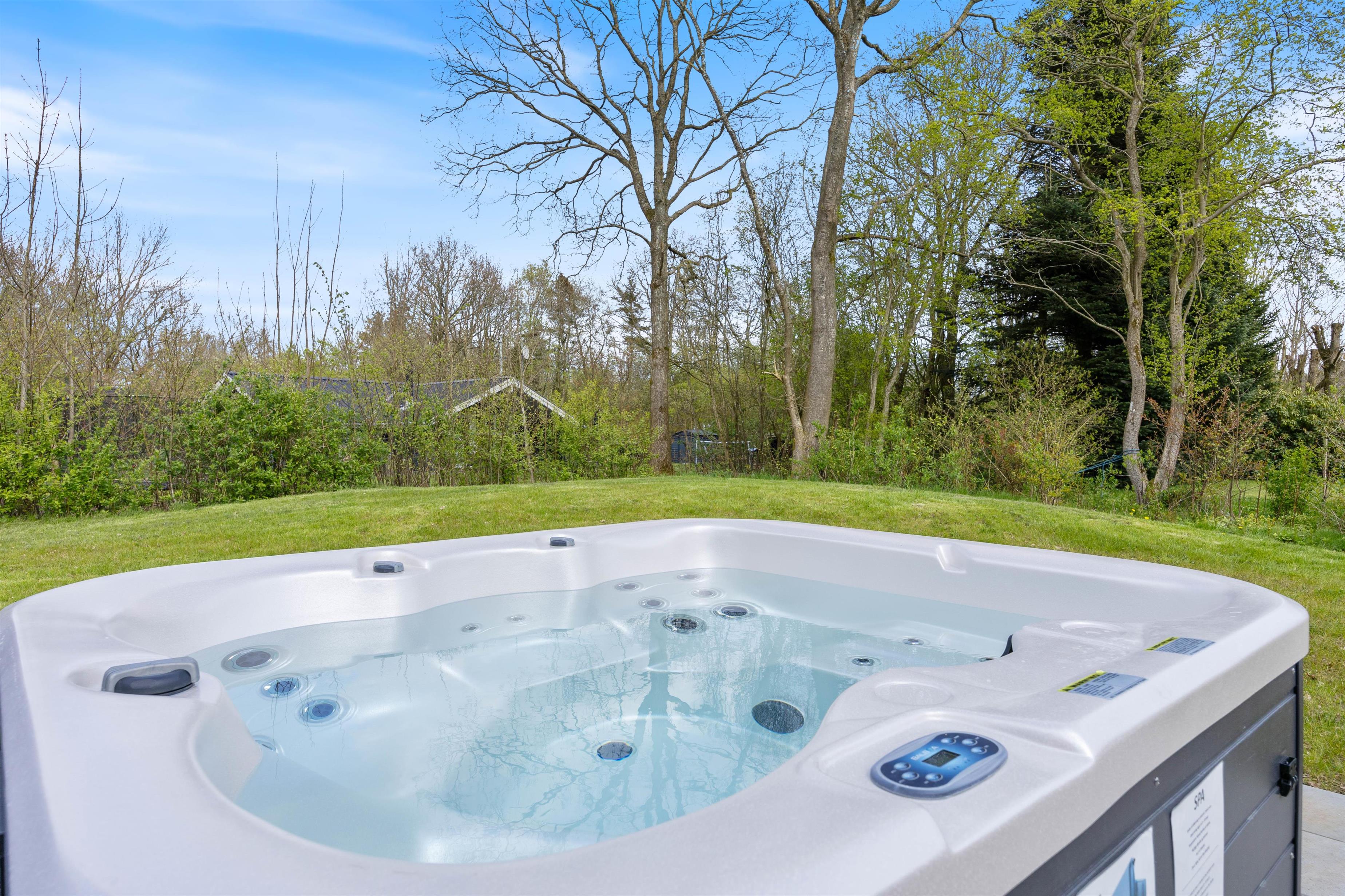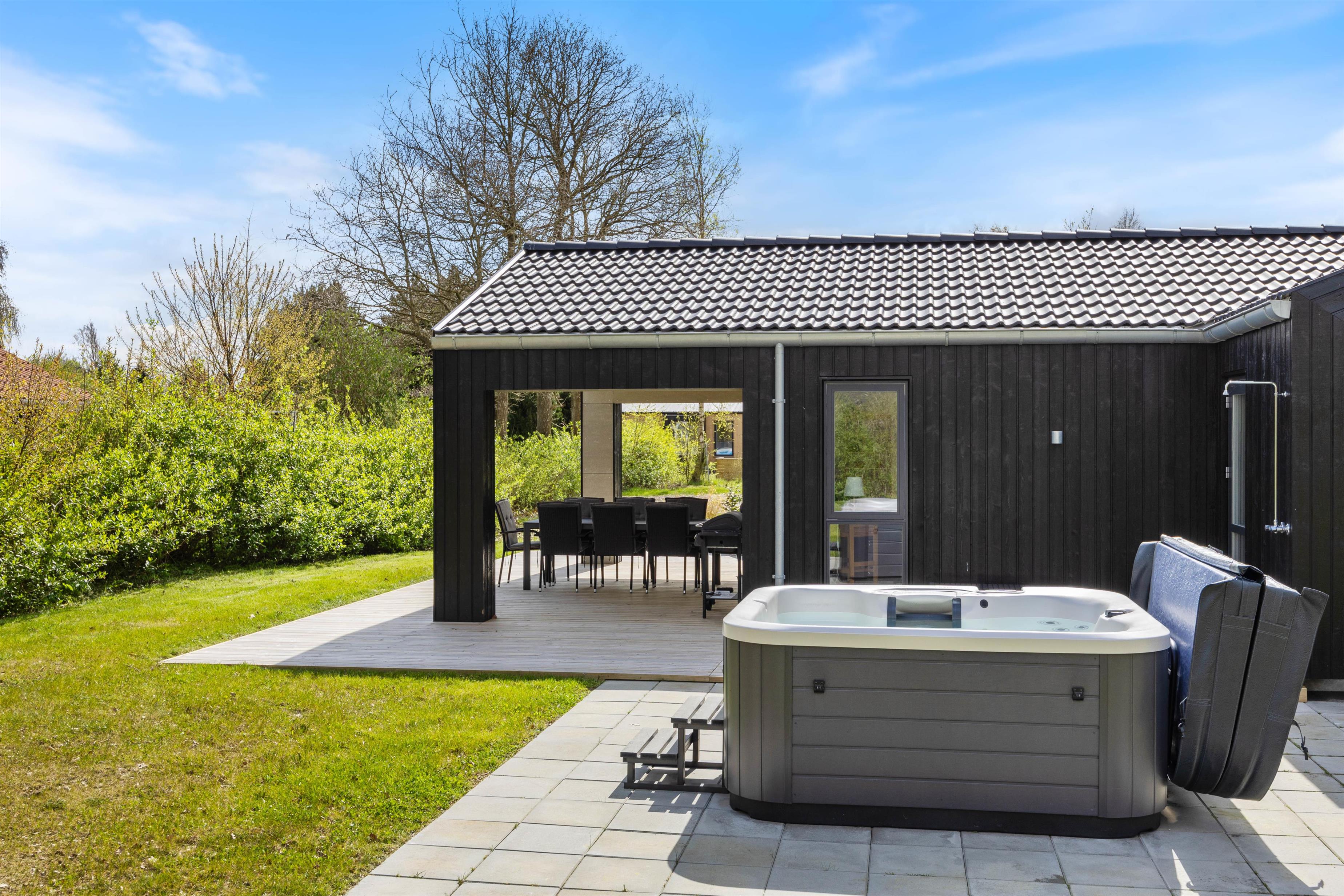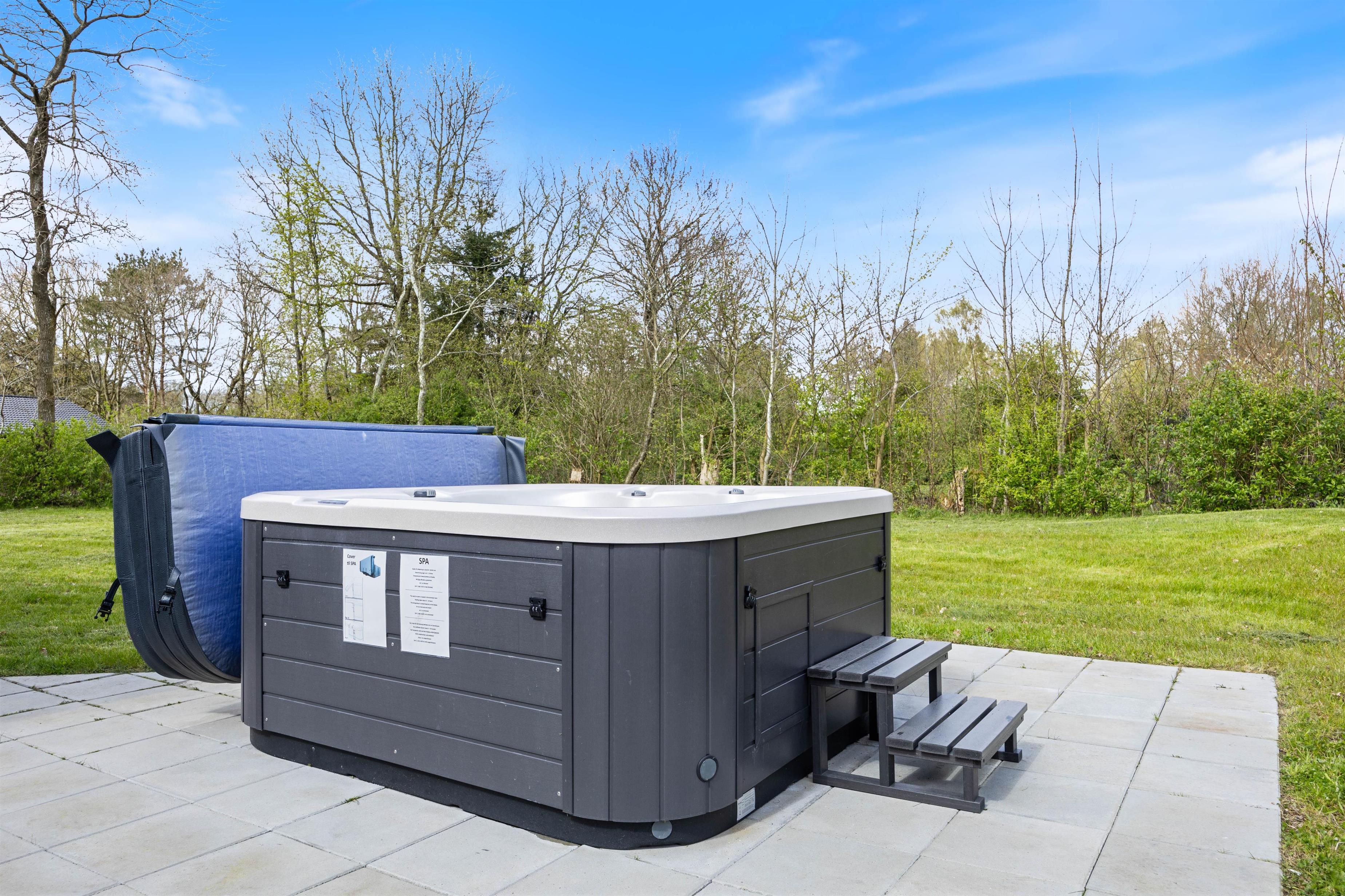 Fra alrummet kan I tilgå den skønne træterrasse, som er delvist overdækket. Her kan I slappe af og nyde solen i de komfortable havemøbler. Som lidt ekstra forkælelse er der et udendørs spabad og en udendørs bruser, hvor I kan slappe af og få løsnet muskler og led – superdejligt efter en lang cykeltur, og her kan man hurtigt glemme tiden. Udebruseren kan benyttes fra april til november