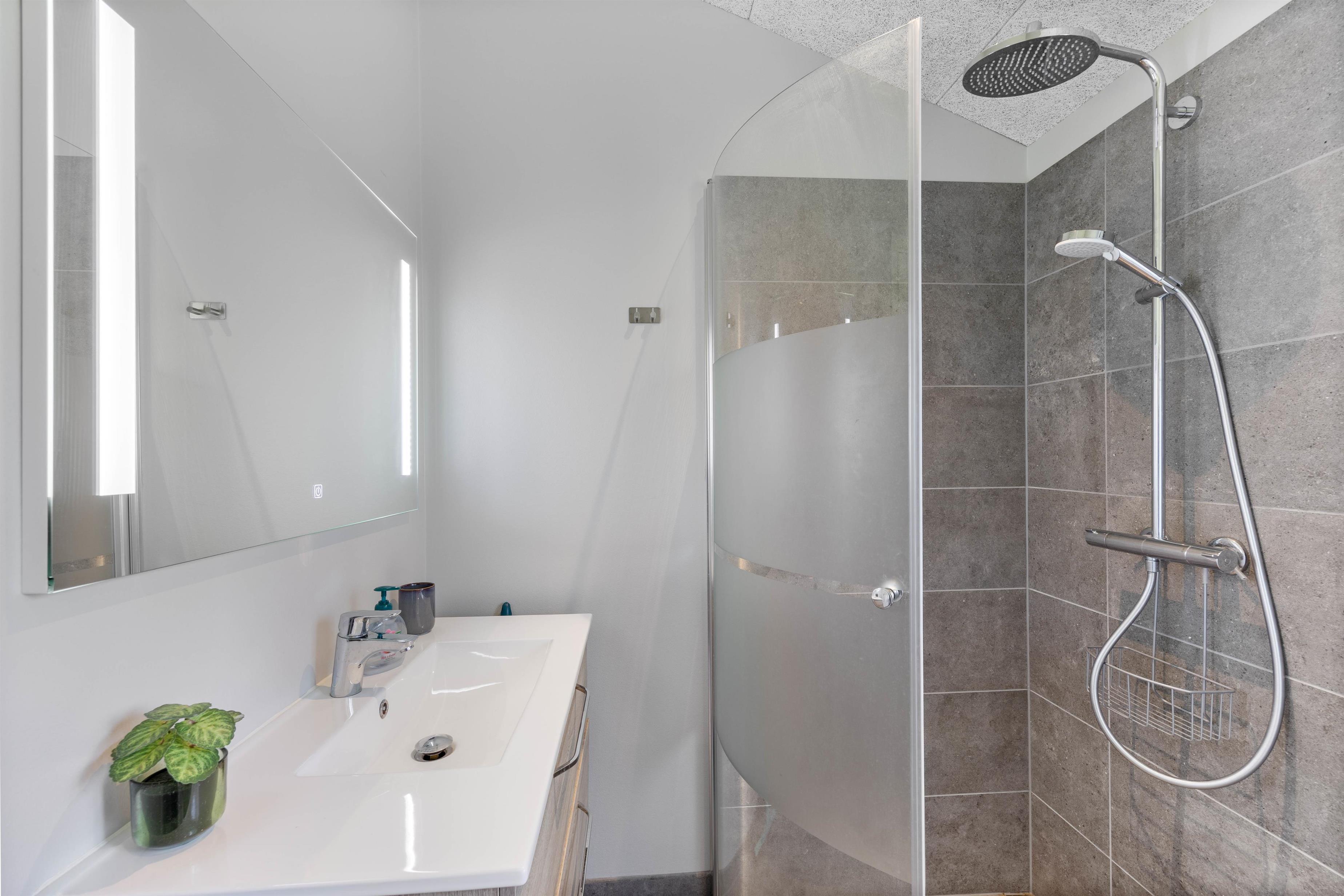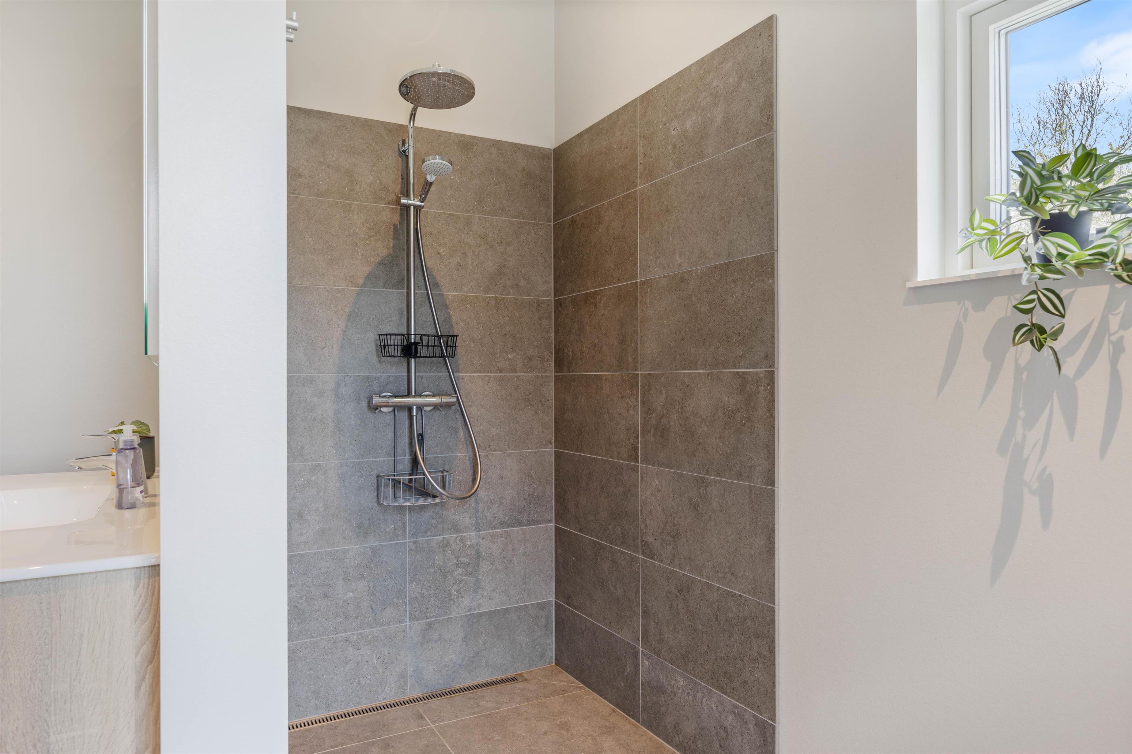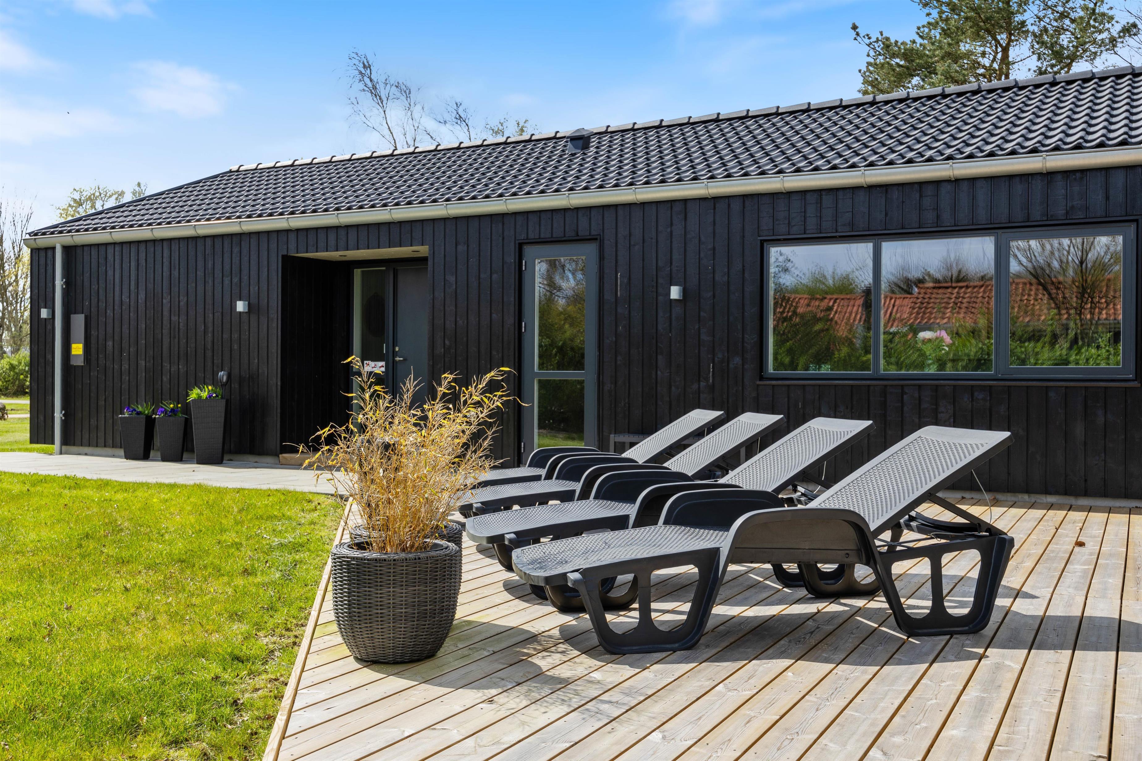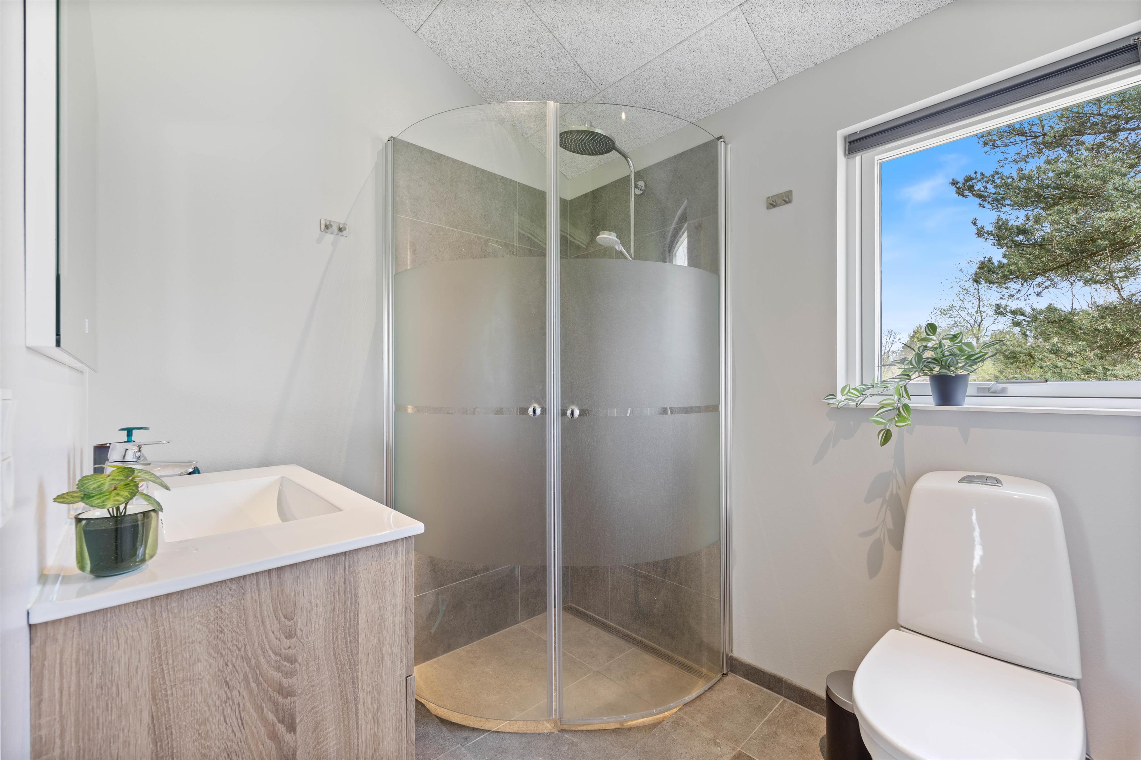 Fra alrummet kan I tilgå den skønne træterrasse, som er delvist overdækket. Her kan I slappe af og nyde solen i de komfortable havemøbler. Som lidt ekstra forkælelse er der et udendørs spabad og en udendørs bruser, hvor I kan slappe af og få løsnet muskler og led – superdejligt efter en lang cykeltur, og her kan man hurtigt glemme tiden. Udebruseren kan benyttes fra april til november