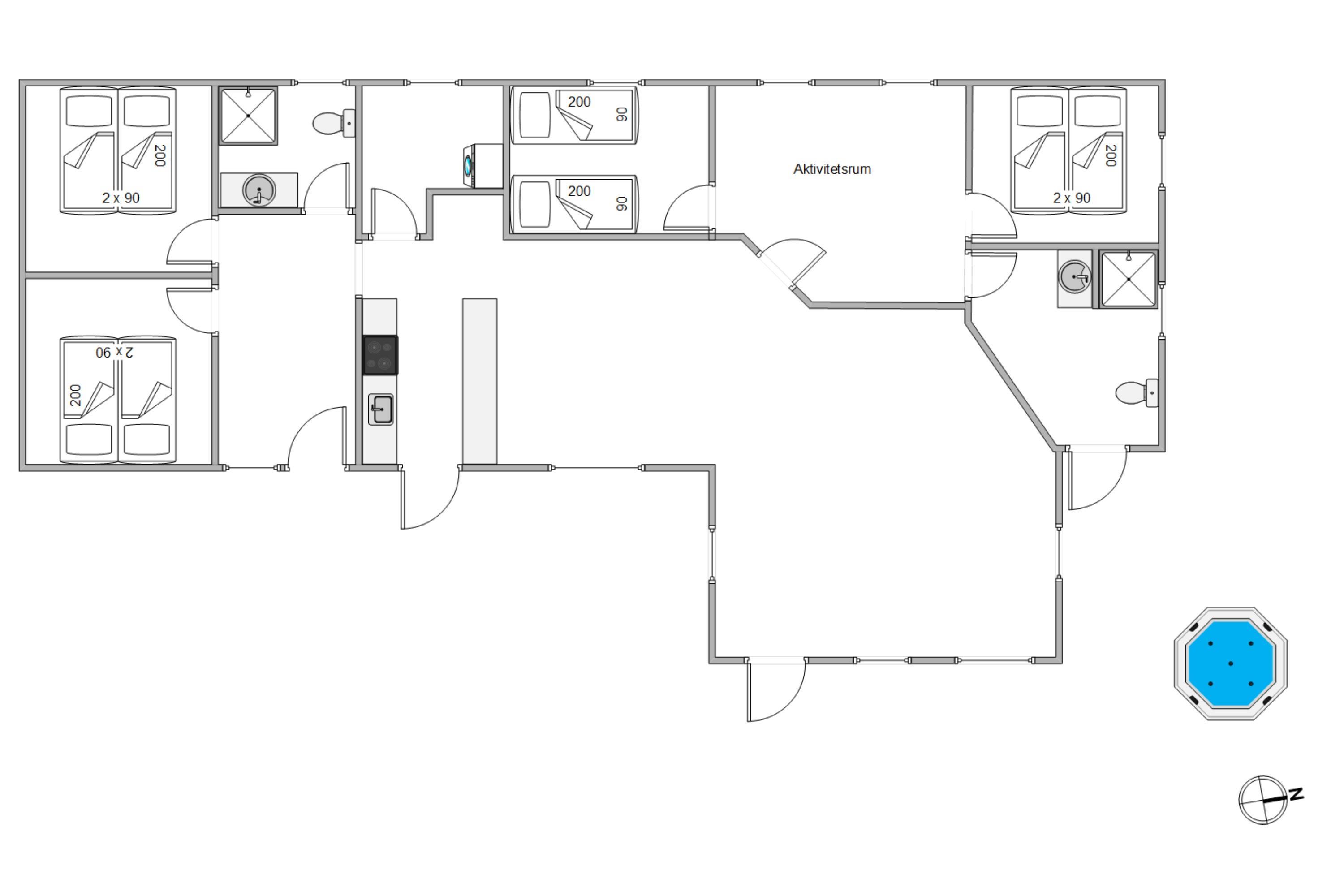 Et rummeligt feriehus på 153 m2 med masser af plads til en eller to familier. De otte sovepladser er fordelt på fire værelser. Der er to badeværelser og feriehuset er indrettet med en forældreafdeling, så der er mulighed for at få en god nattesøvn, selvom andre fortrækker at blive lidt længere oppe.