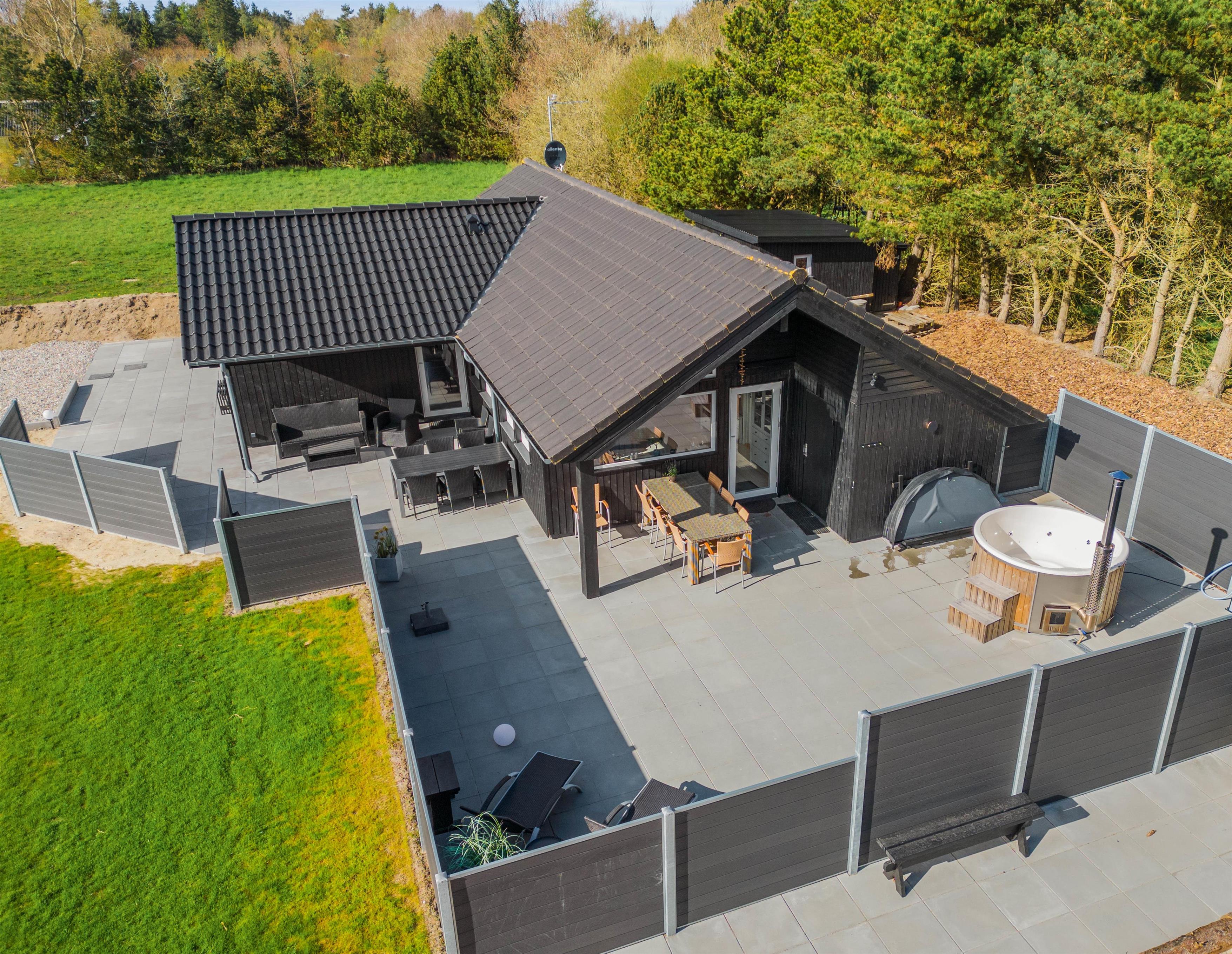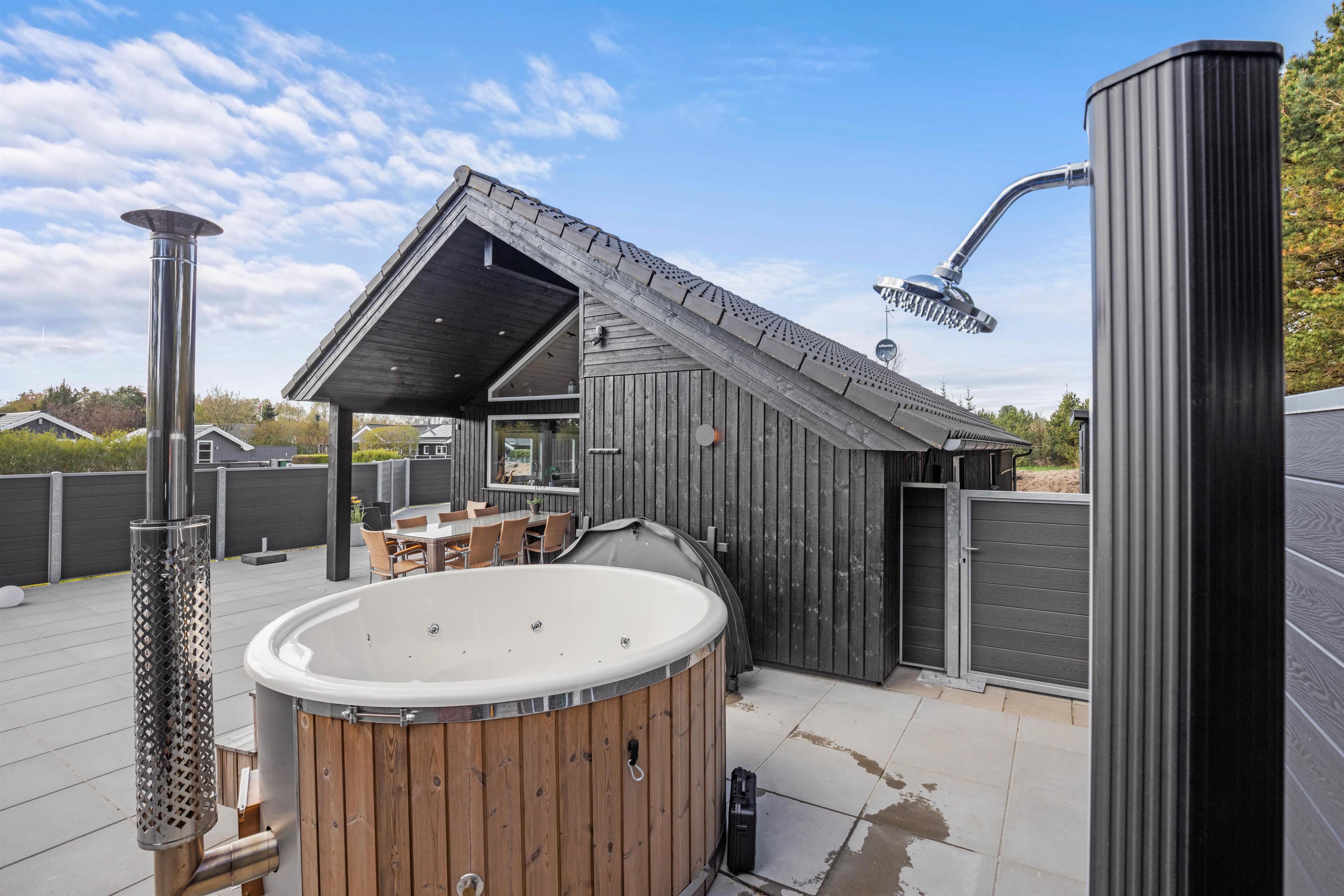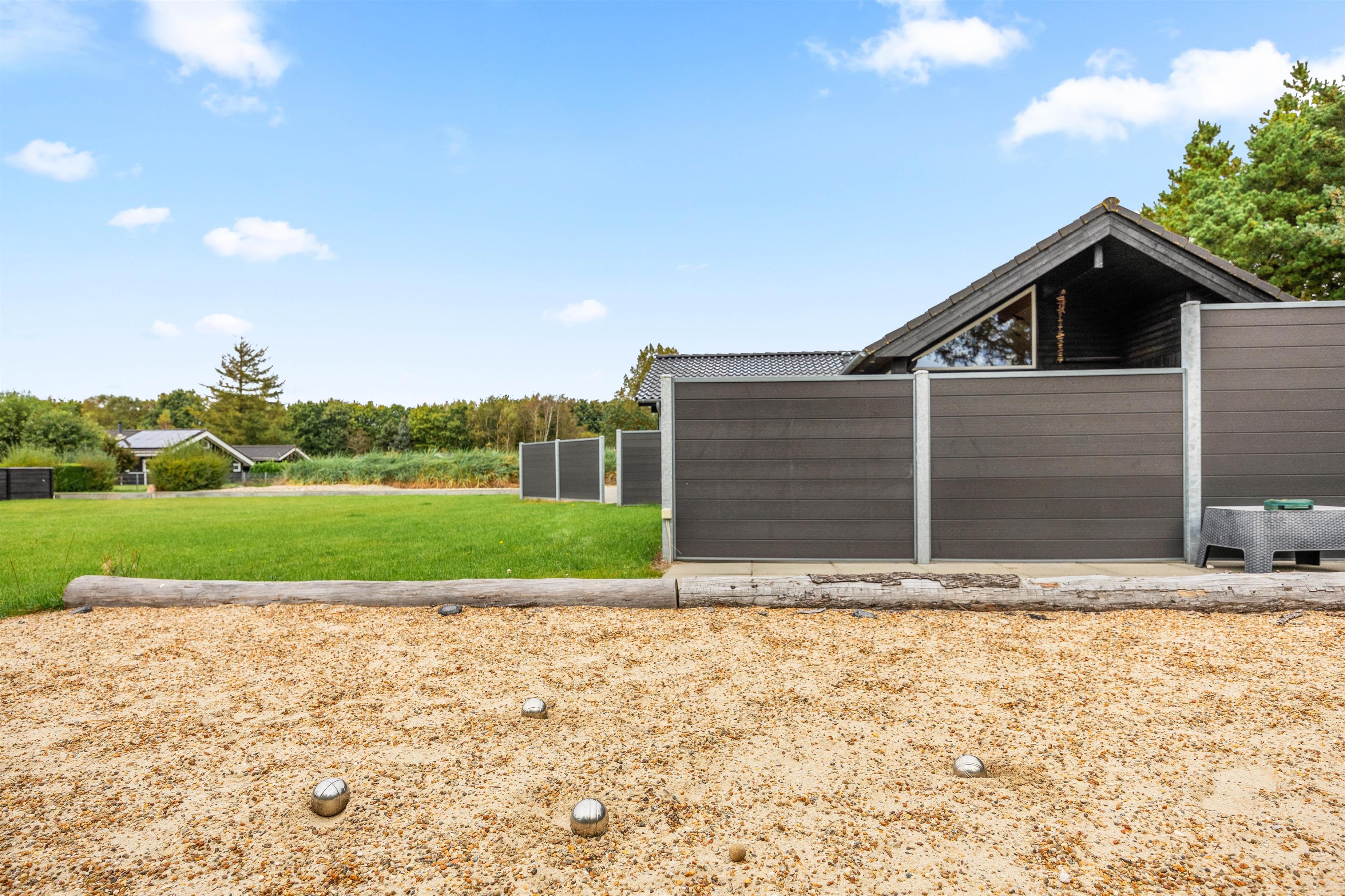 På sommerhusets udeområde venter jer flere skønne højdepunkter, som I kan se frem til på jeres ferie. På udeområdet finder I det skønne vildmarksbad, der inviterer til masser af afslapning under åben himmel. Kan I lide at spille petanque, kan I gøre dette i haven. Her finder I en dejlig stor petanque-bane, med internationale mål på 3,5 x 12m.