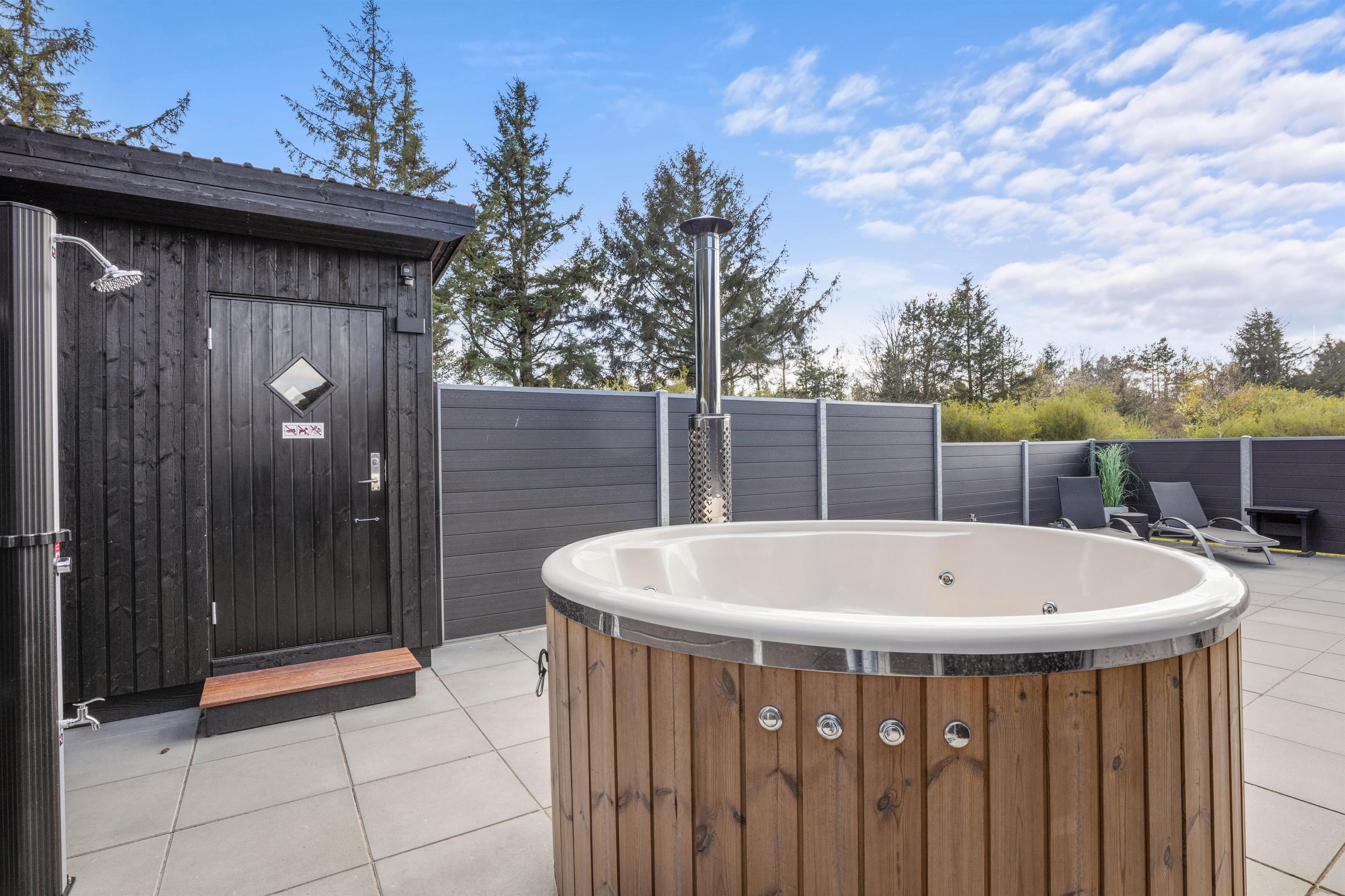 Med en række luksuriøse faciliteter som infrarød sauna, vildmarksbad med dyser og en rummelig terrasse, er ægte feriehygge garanteret. Udforsk den fantastiske naturgrund, og nyd nem adgang til både strand og indkøbsmuligheder i nærområdet.