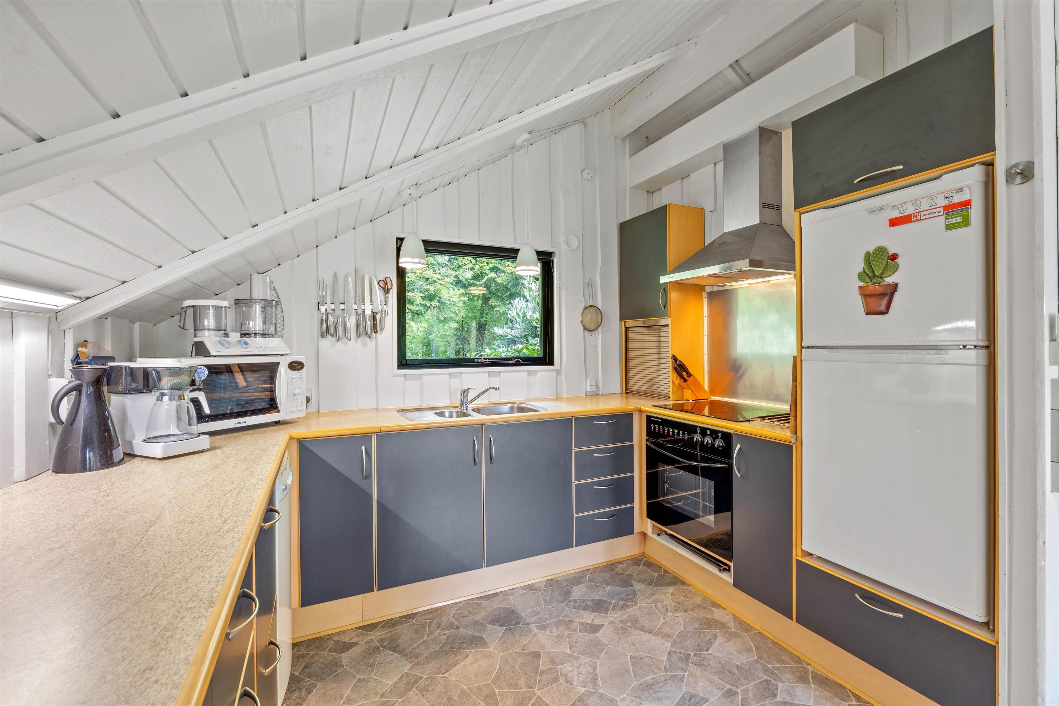 Køkkenet er forbundet med stuen, hvor I også finder spisebordet, hvor I kan spille spil og planlægge næste dags aktiviteter. I køkkenet er der også plads til, at børnene kan være med til at lave mad. Om aftenen kan I samle jer i de behagelige møbler og tænde op i brændeovnen, så I kan nyde varmen herfra. I kan også opvarme sommerhuset med den energibesparende luft-til-luft varmepumpe.