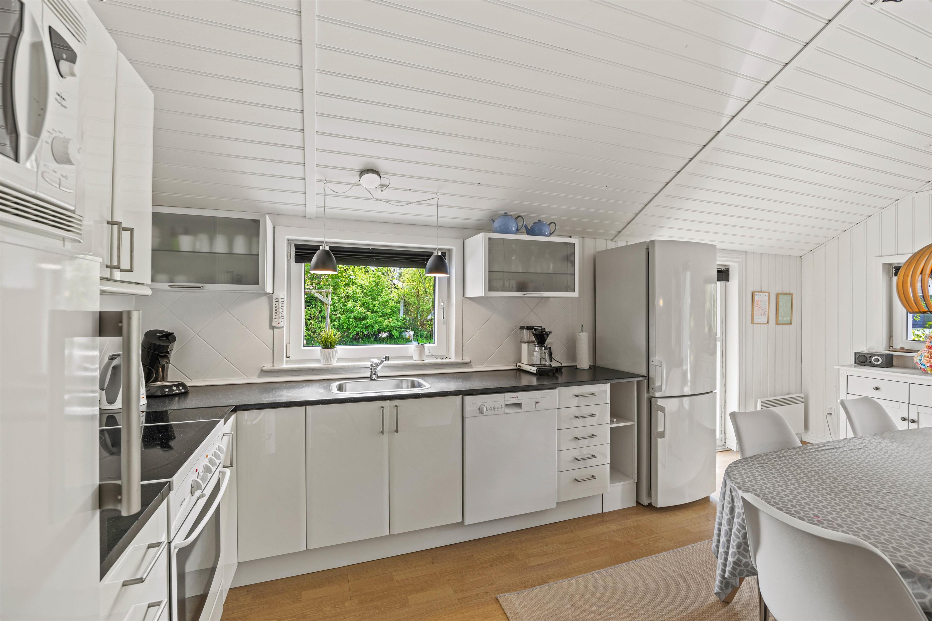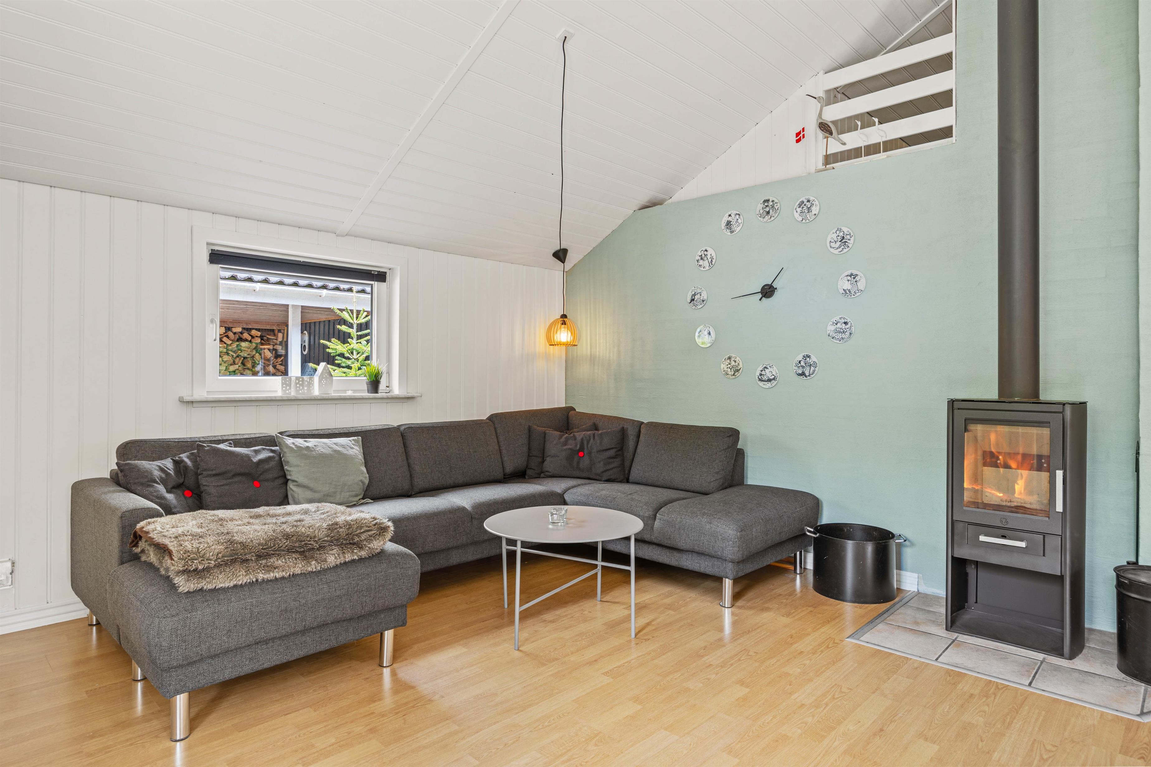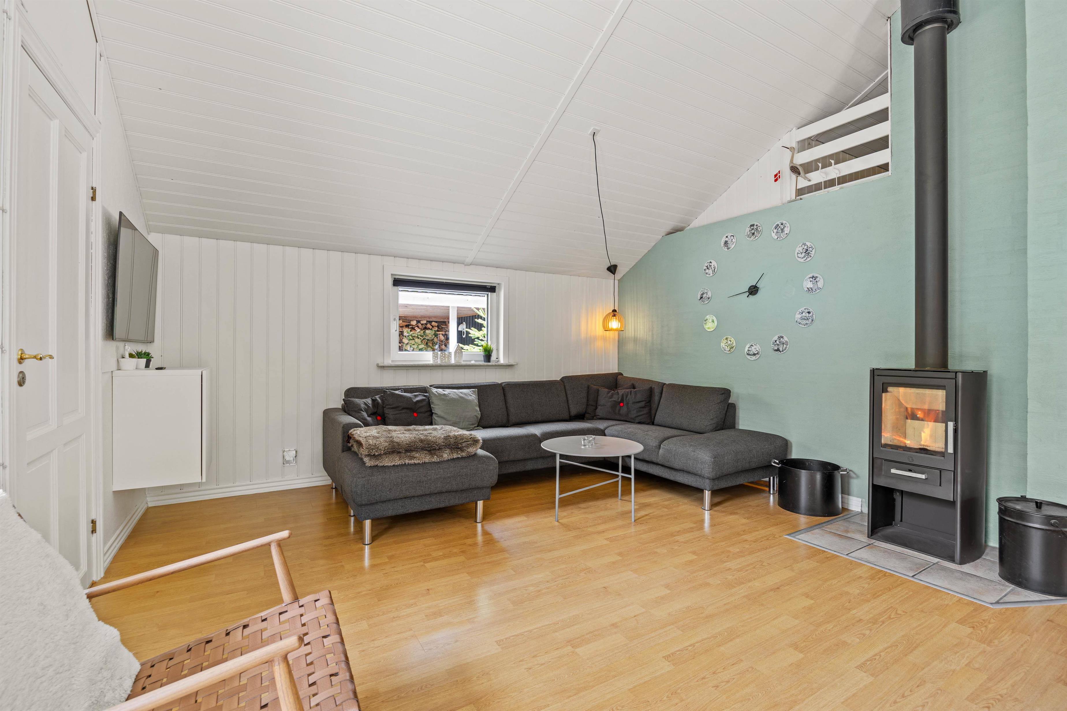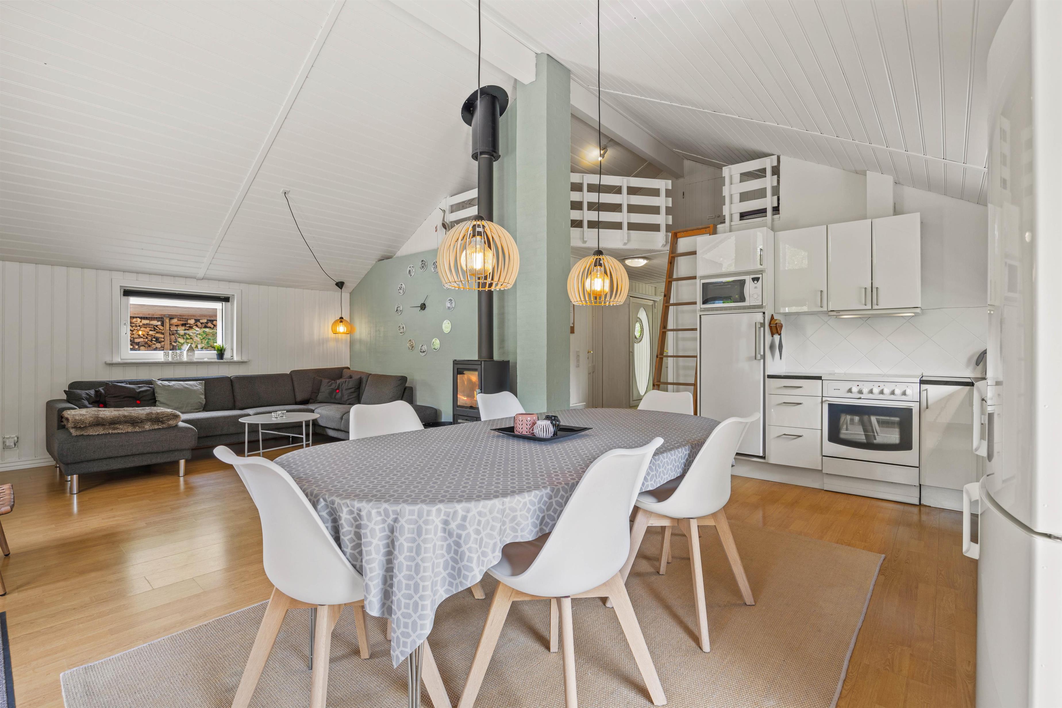 Bevæger I jer videre ind i sommerhuset finder I det store køkken alrum, som både med sit samtalevenlige køkken og opvaskemaskine, gør madlavningen til en leg. Stuen er udstyret med en brændeovn, som giver en hyggelig atmosfære og varme på kølige aftener.
