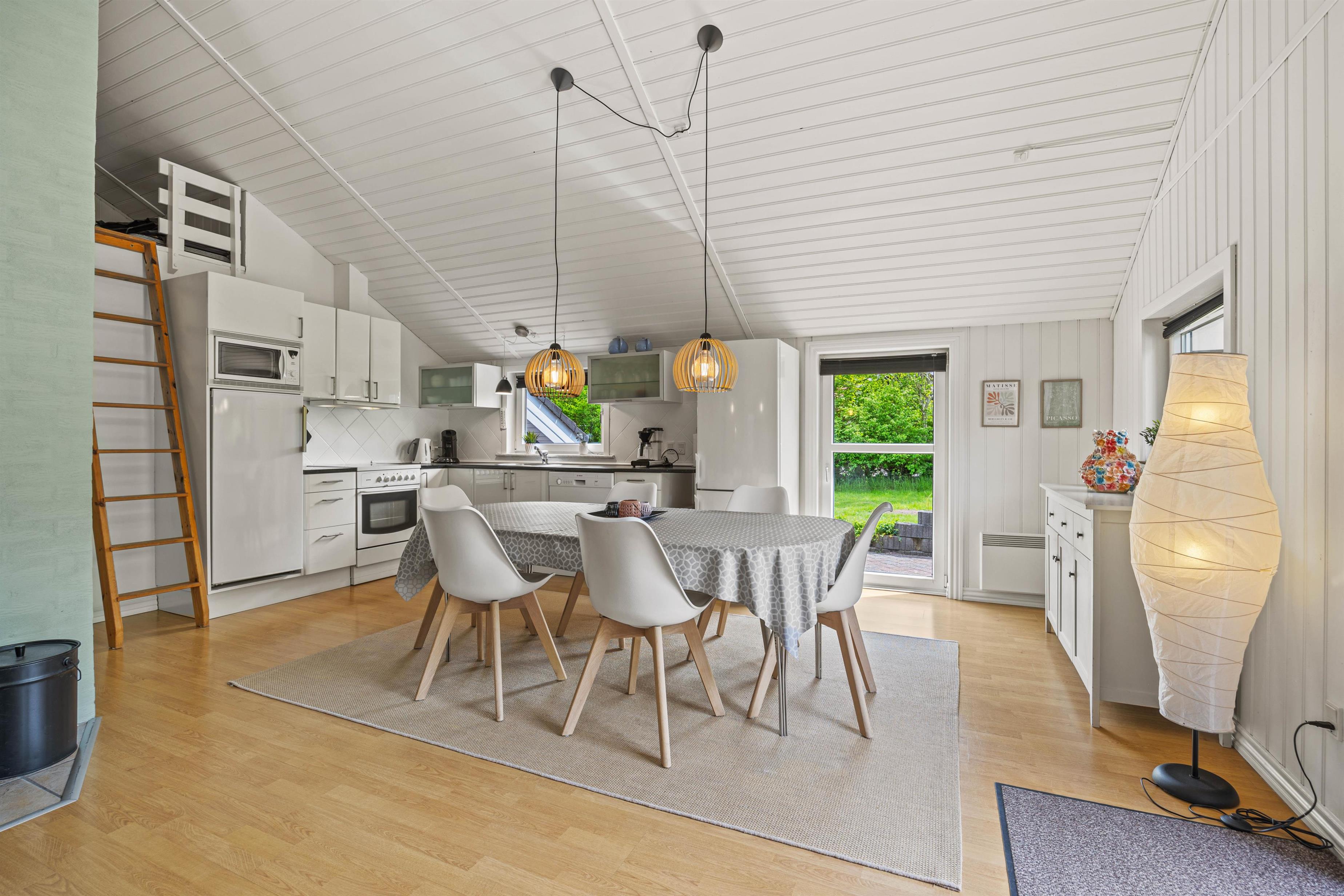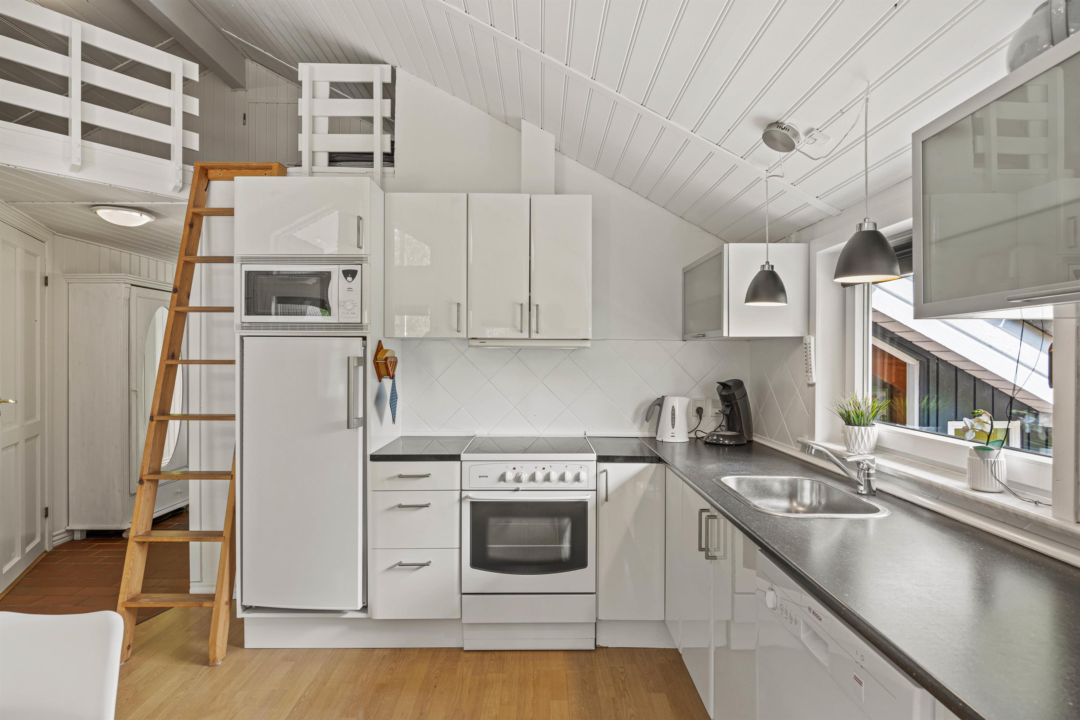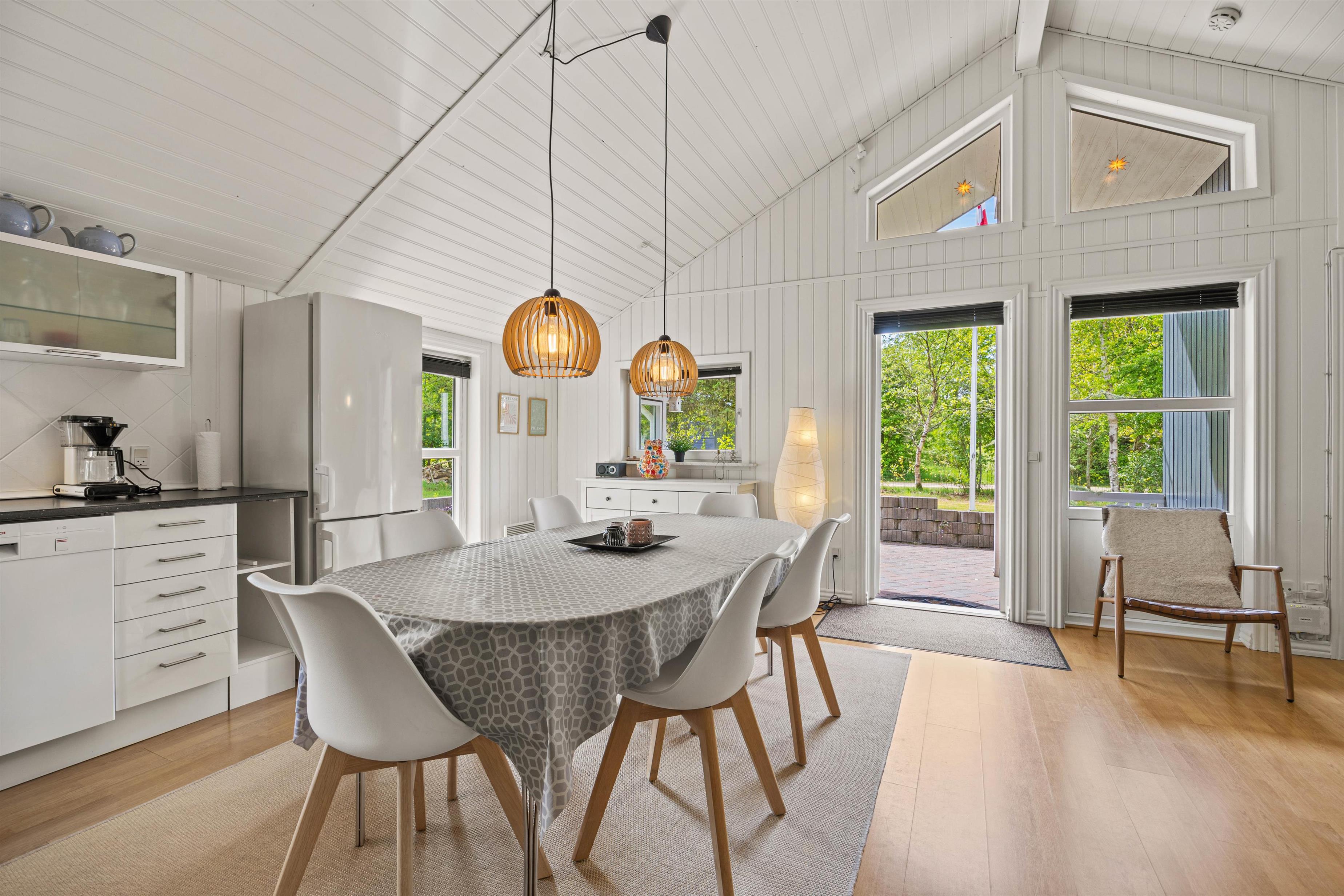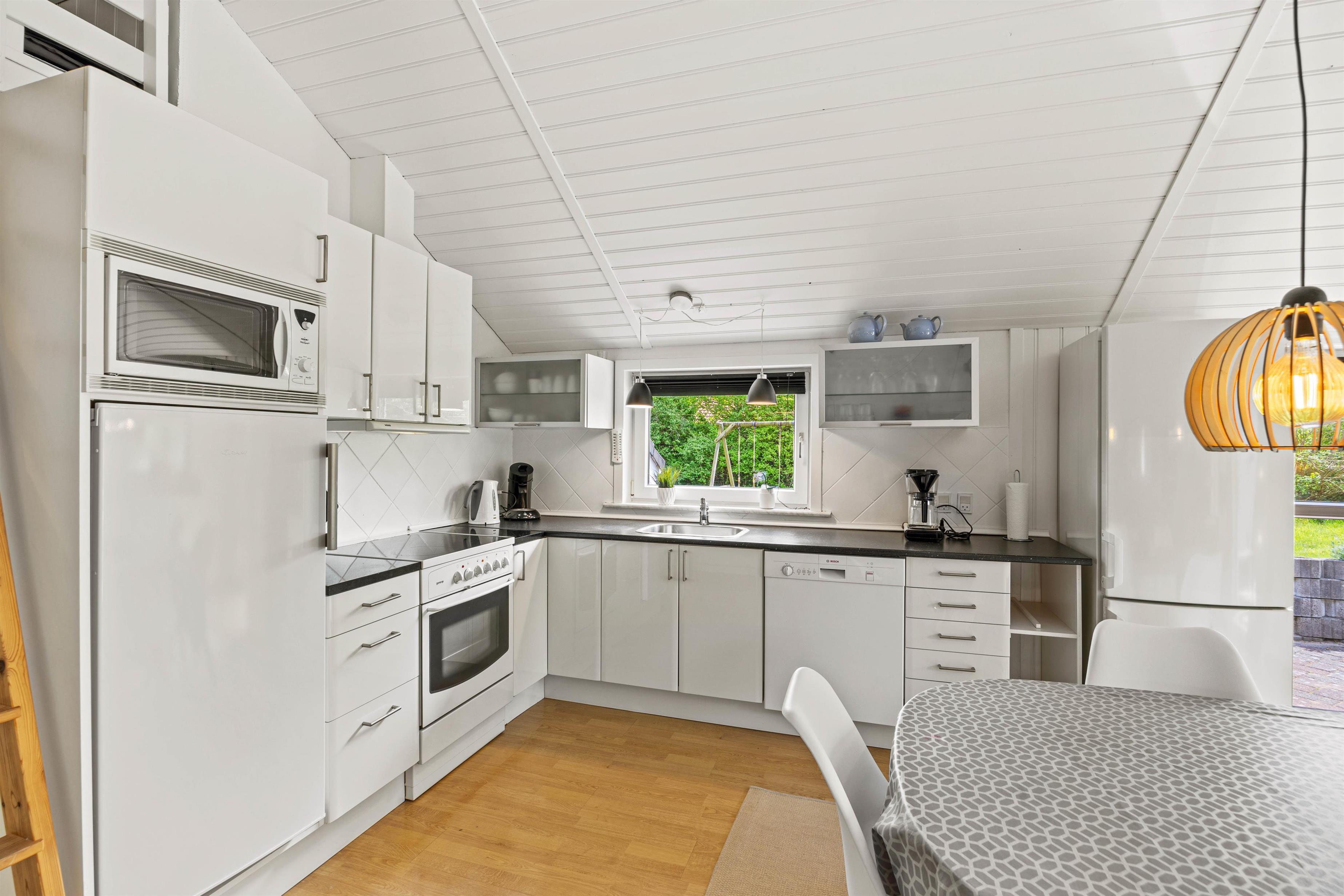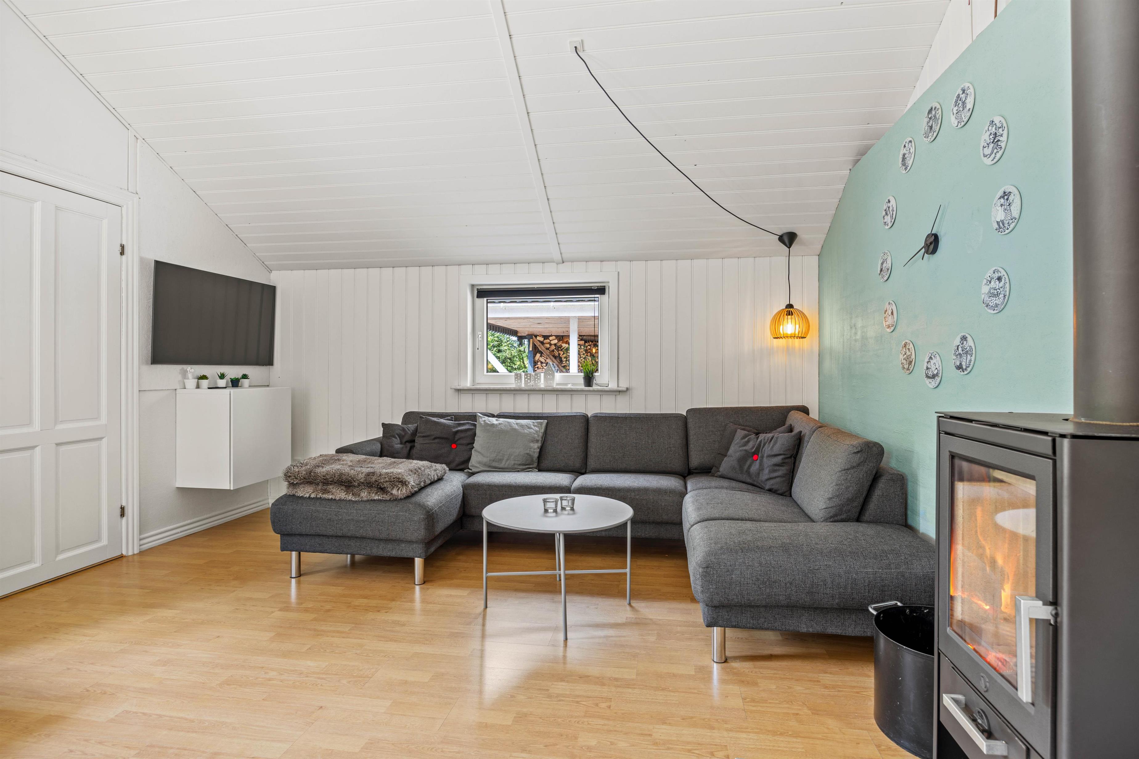 Bevæger I jer videre ind i sommerhuset finder I det store køkken alrum, som både med sit samtalevenlige køkken og opvaskemaskine, gør madlavningen til en leg. Stuen er udstyret med en brændeovn, som giver en hyggelig atmosfære og varme på kølige aftener.