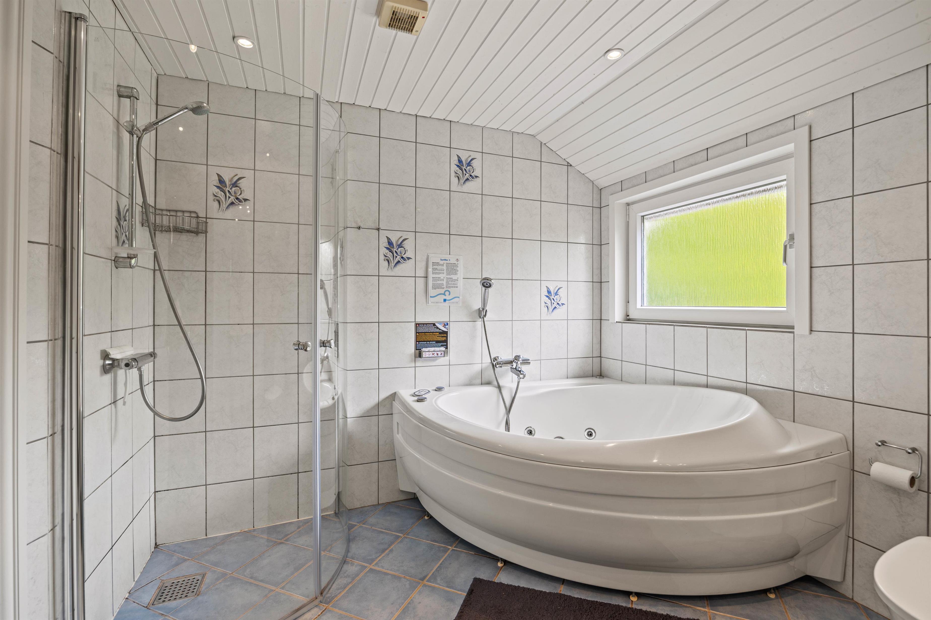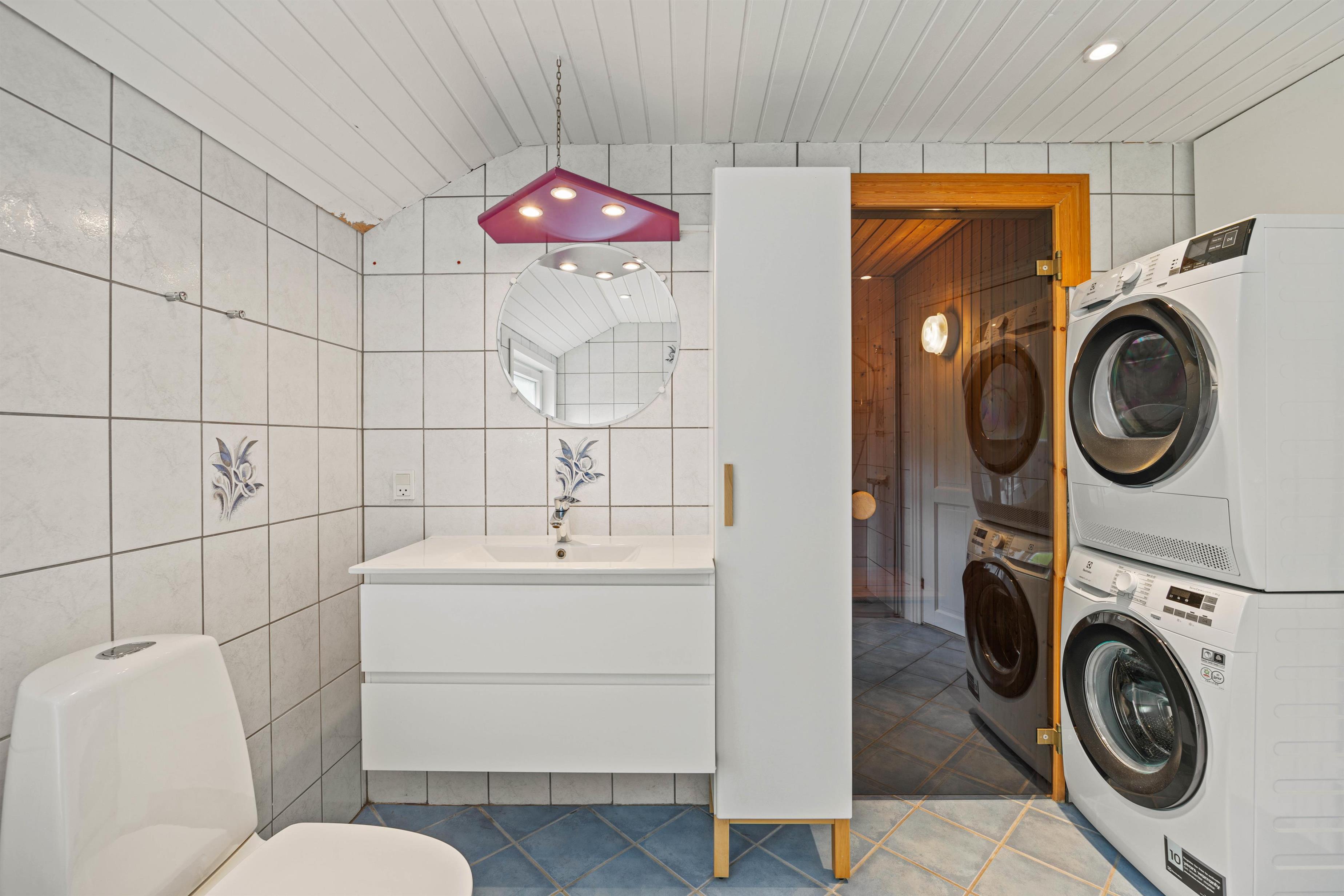 For at gøre jeres ophold så afslappende som muligt, er der også både vaskemaskine og tørretumbler til rådighed, så I nemt kan klare vasketøjet. Og når der skal helt ro på, finder I et badeværelset, der med sin sauna, gulvvarme og tømmespa inviterer til ren afslapning og forkælelse efter en dag fyldt med aktiviteter.