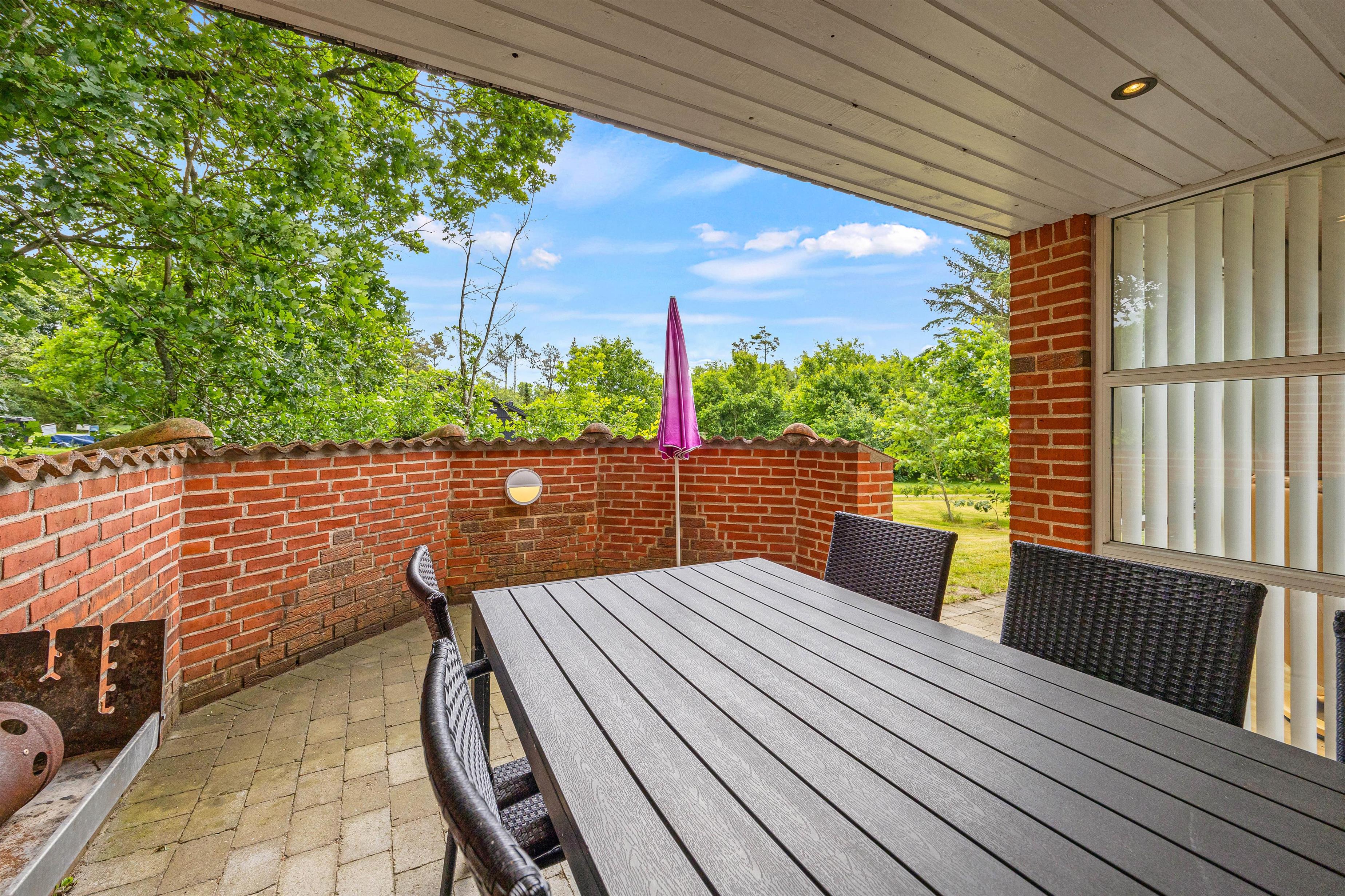 På terrassen er alt klar til at gøre jeres ferie uforglemmelig. Der er en grill og komfortable møbler, der indbyder til en hyggelig aften med lækker mad under den åbne himmel. Og for dem der søger solen, er der solvogne og en parasol, der giver mulighed for lidt skygge, når det er nødvendigt.