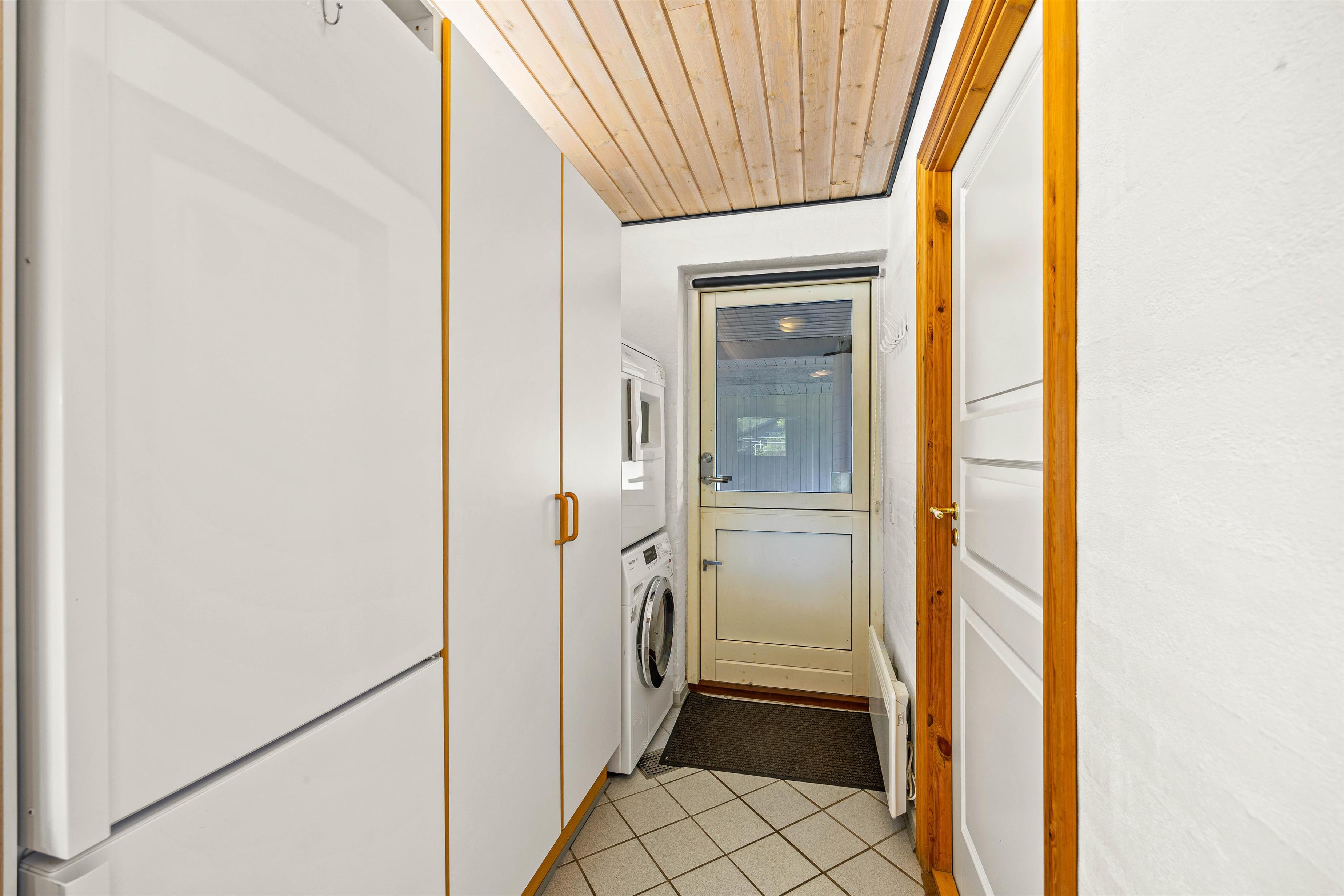 Feriehuset har tre soveværelser; to med dobbeltsenge og et med en køjeseng, hvilket er ideelt for familier eller venner, der rejser sammen. Badeværelset giver jer mulighed for at forkæle jer selv med en tømmespa til 2 personer samt en sauna, perfekt til at slappe af i. Der er også et ekstra toilet, der giver ekstra bekvemmelighed. I huset findes et praktisk vasketårn, så I let kan holde styr på garderoben under hele opholdet.