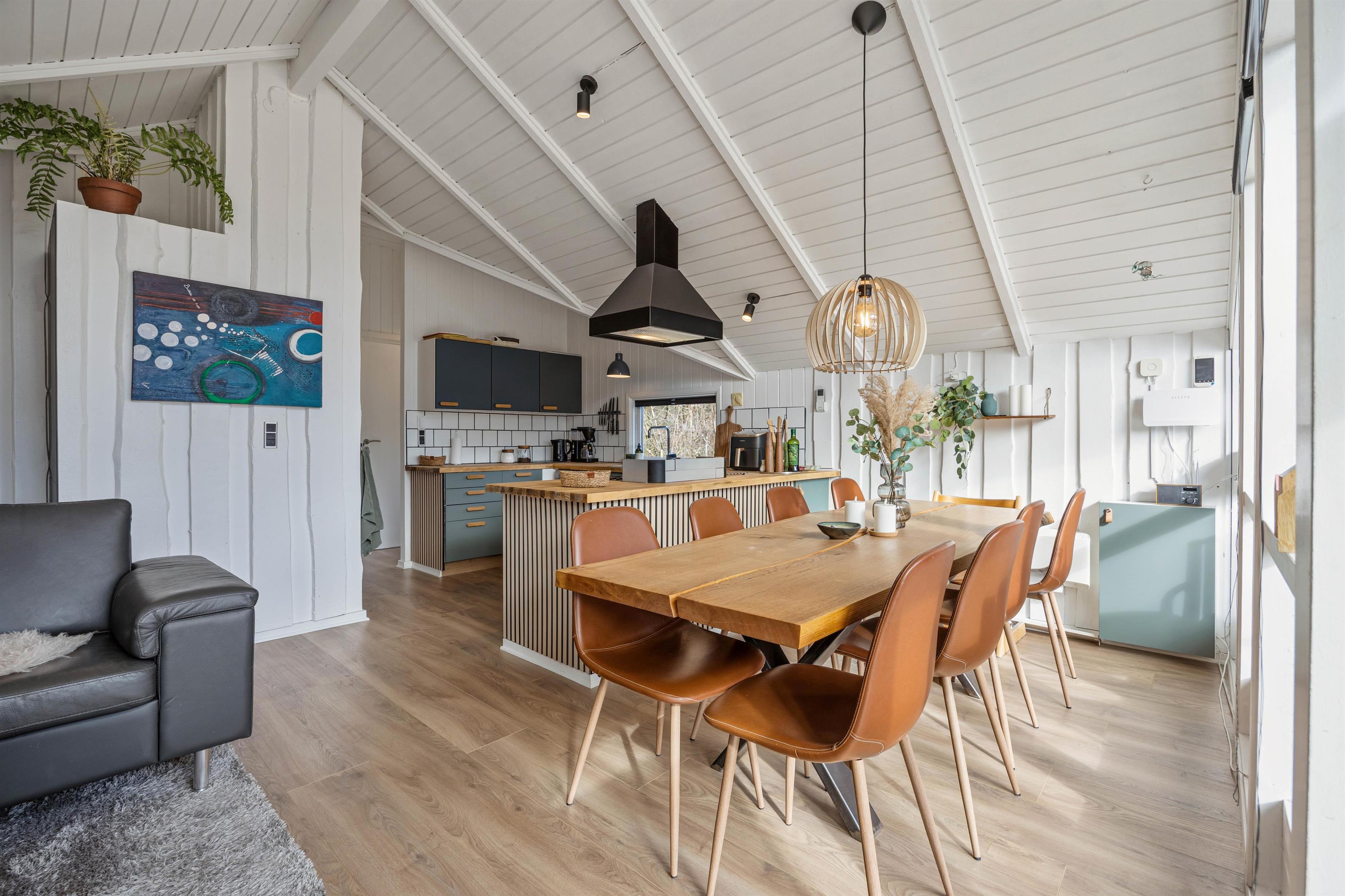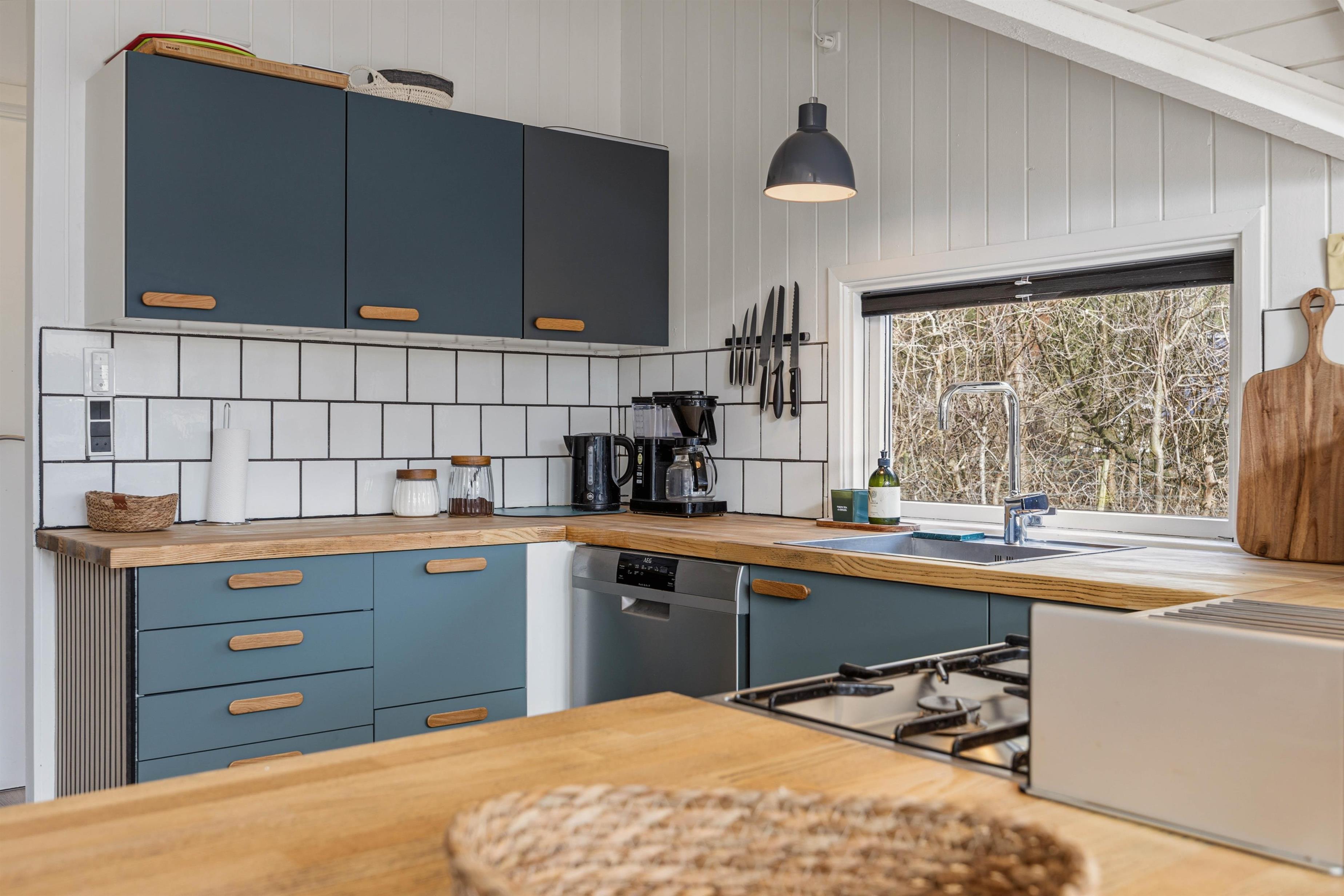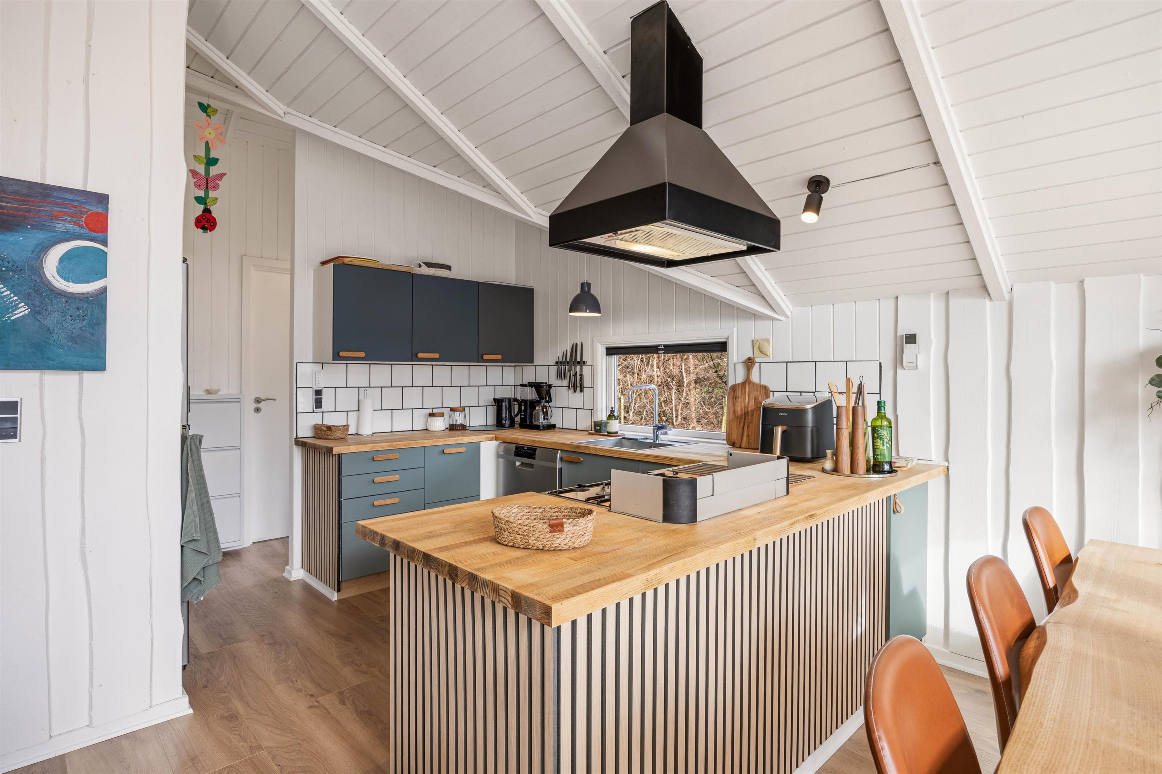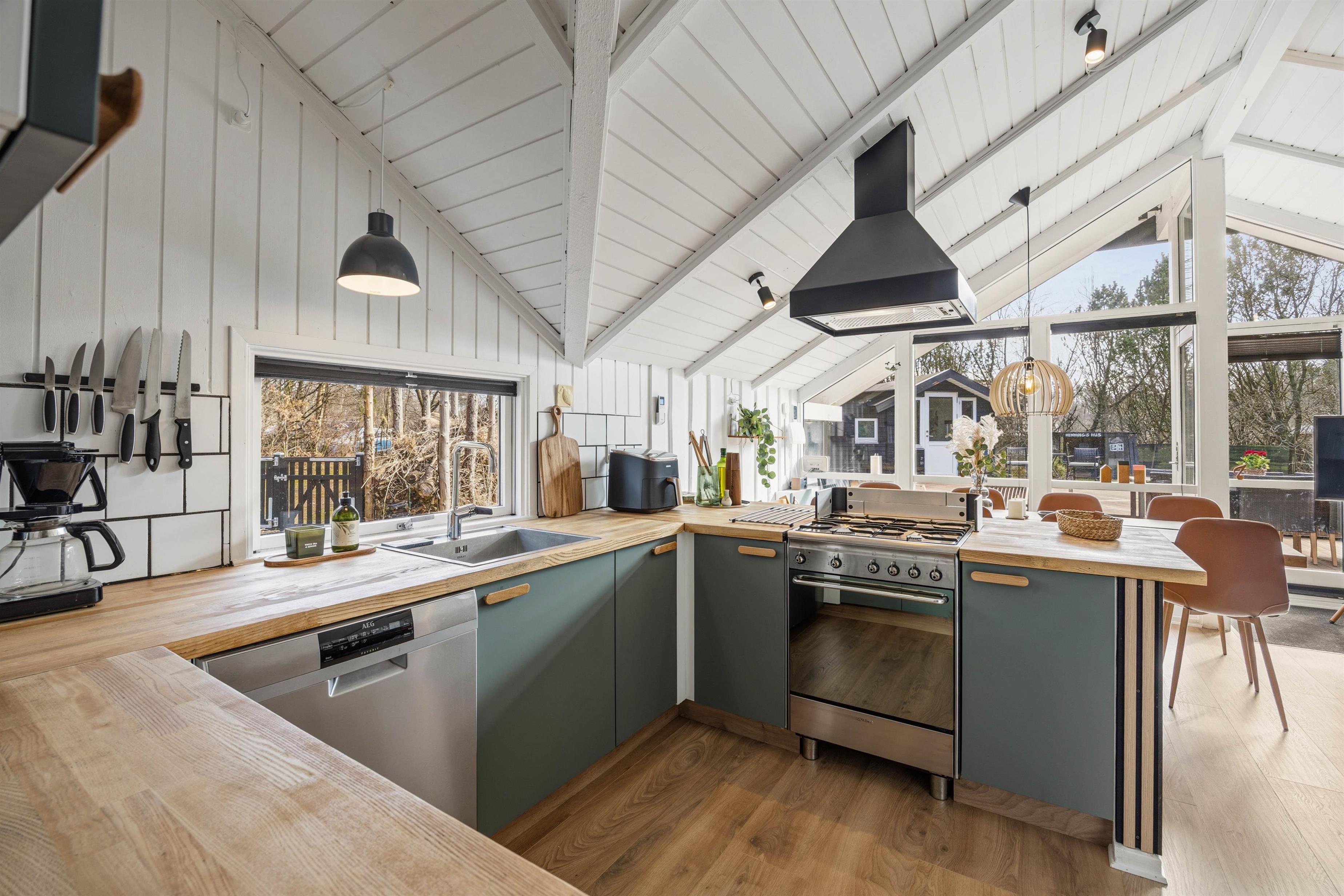 I det åbne køkken kan I nyde hyggelige madlavningsaftener sammen, mens opvaskemaskinen klarer opvasken for jer – så der er mere tid til alt det sjove. Hvad med et langt saunabesøg eller et afslappende bad i tømmespaen? Begge dele finder I på det store badeværelse, som også har gulvvarme og vaskemaskine.