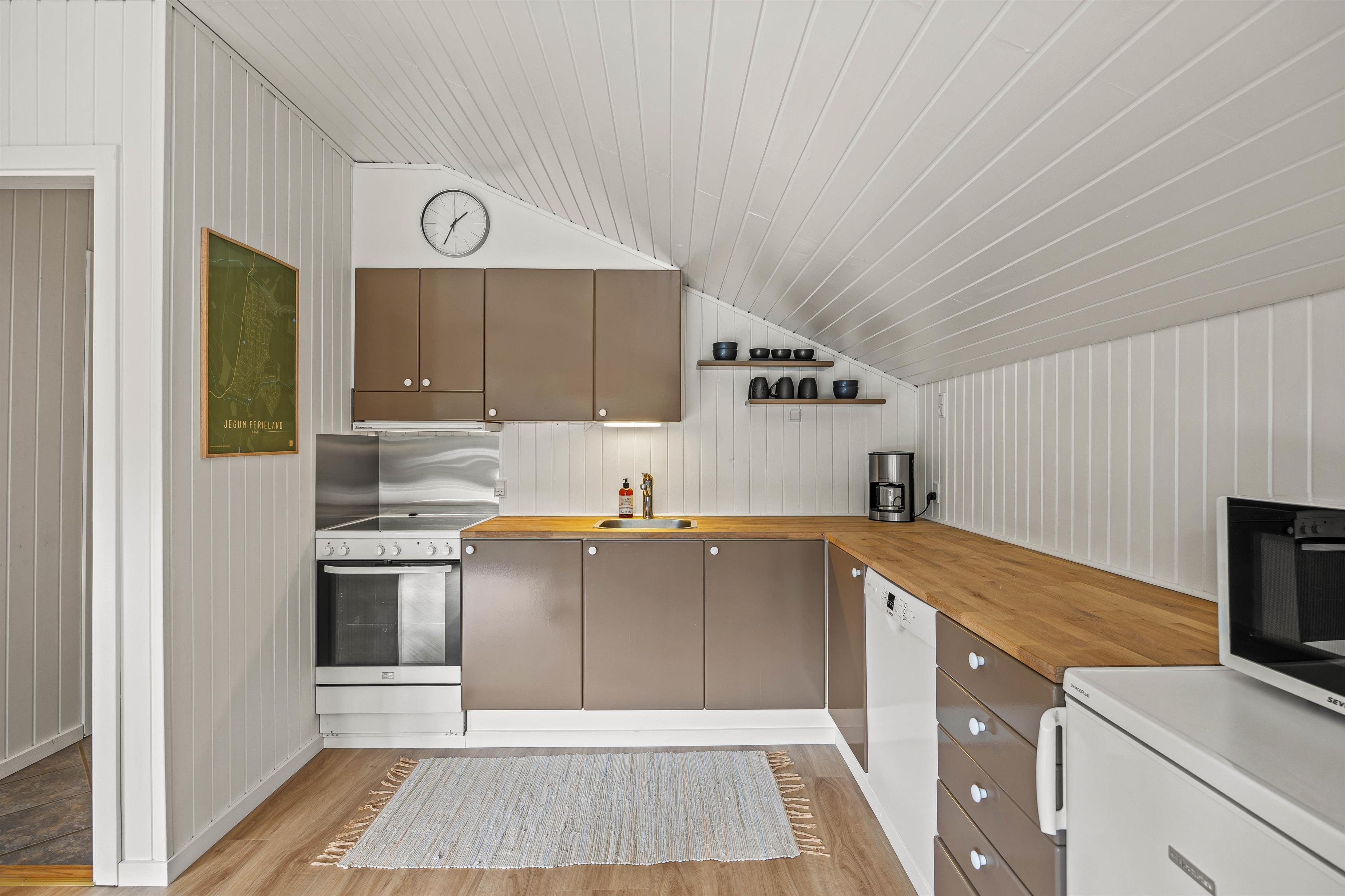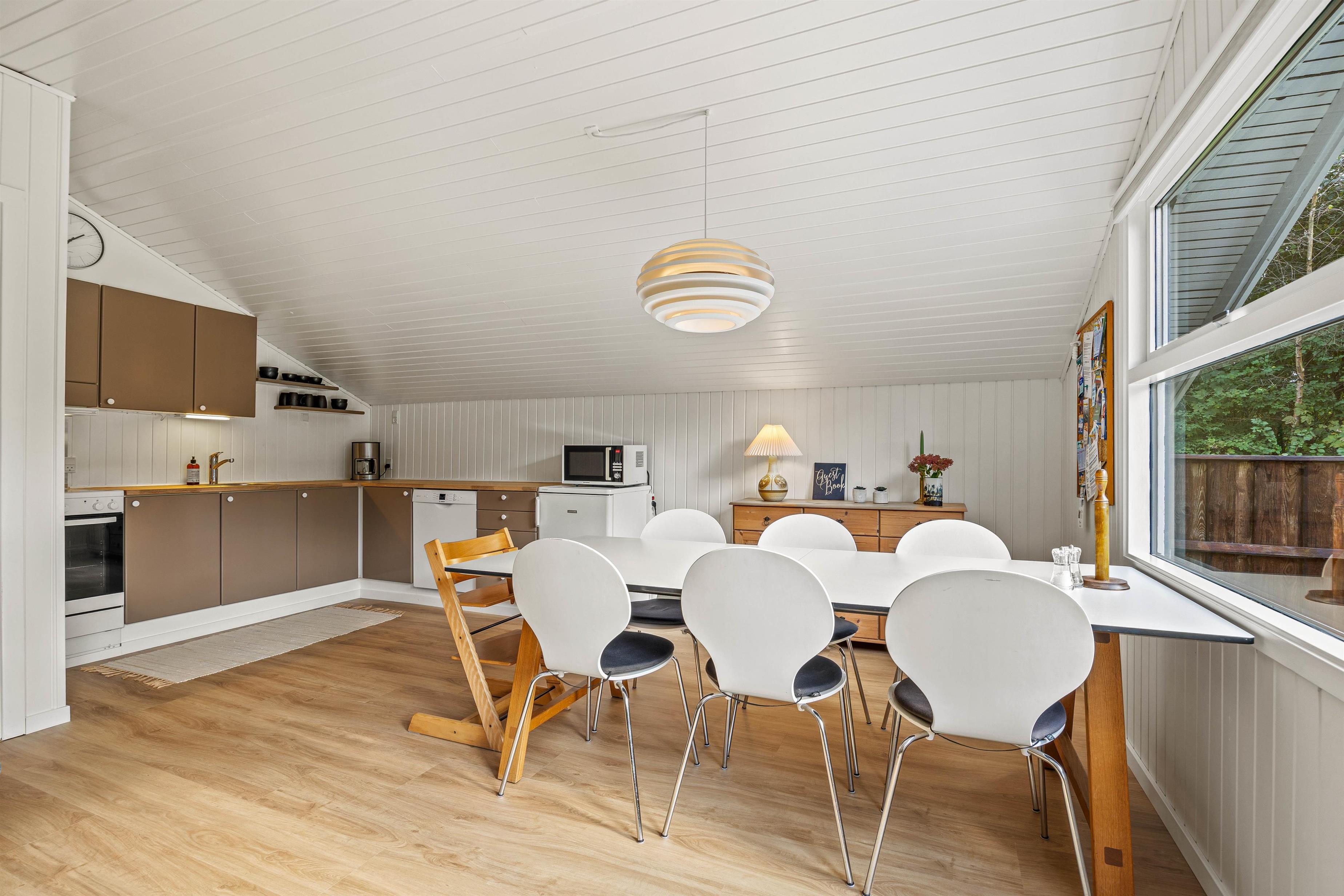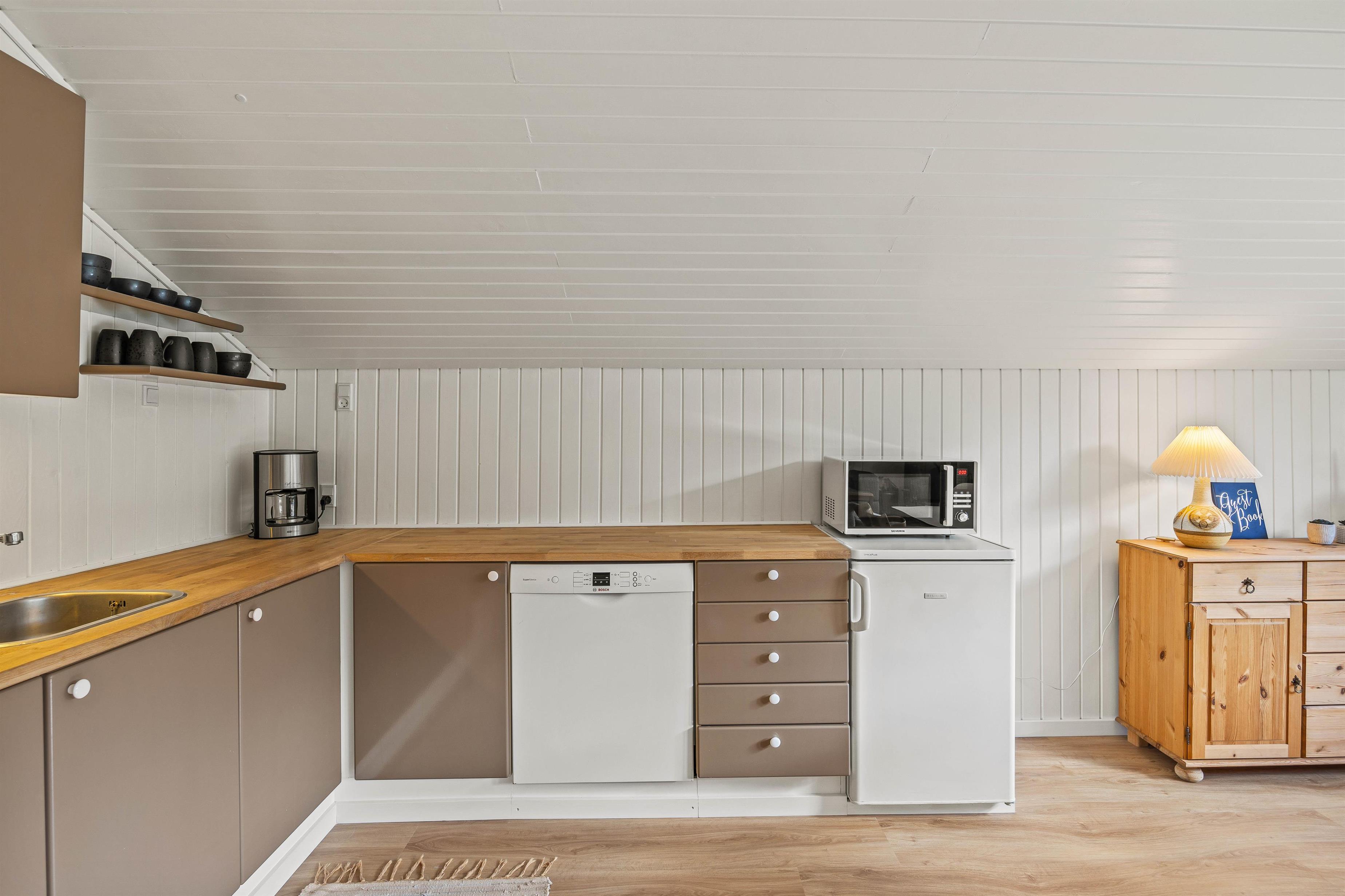 Det hyggelige opholdsrum er feriehusets kerne, hvor I kan samles som familie og nyde aftenerne med et brætspil eller en god film. Feriehuset gennemgik i 2023 en renovering, og fremstår nu lyst og rummeligt. I opholdsrummet venter jer en brændeovn, der foruden en god varme skaber en behagelig og afslappet atmosfære. Det moderne køkken er udstyret med en opvaskemaskine, der letter oprydningen efter maden.
