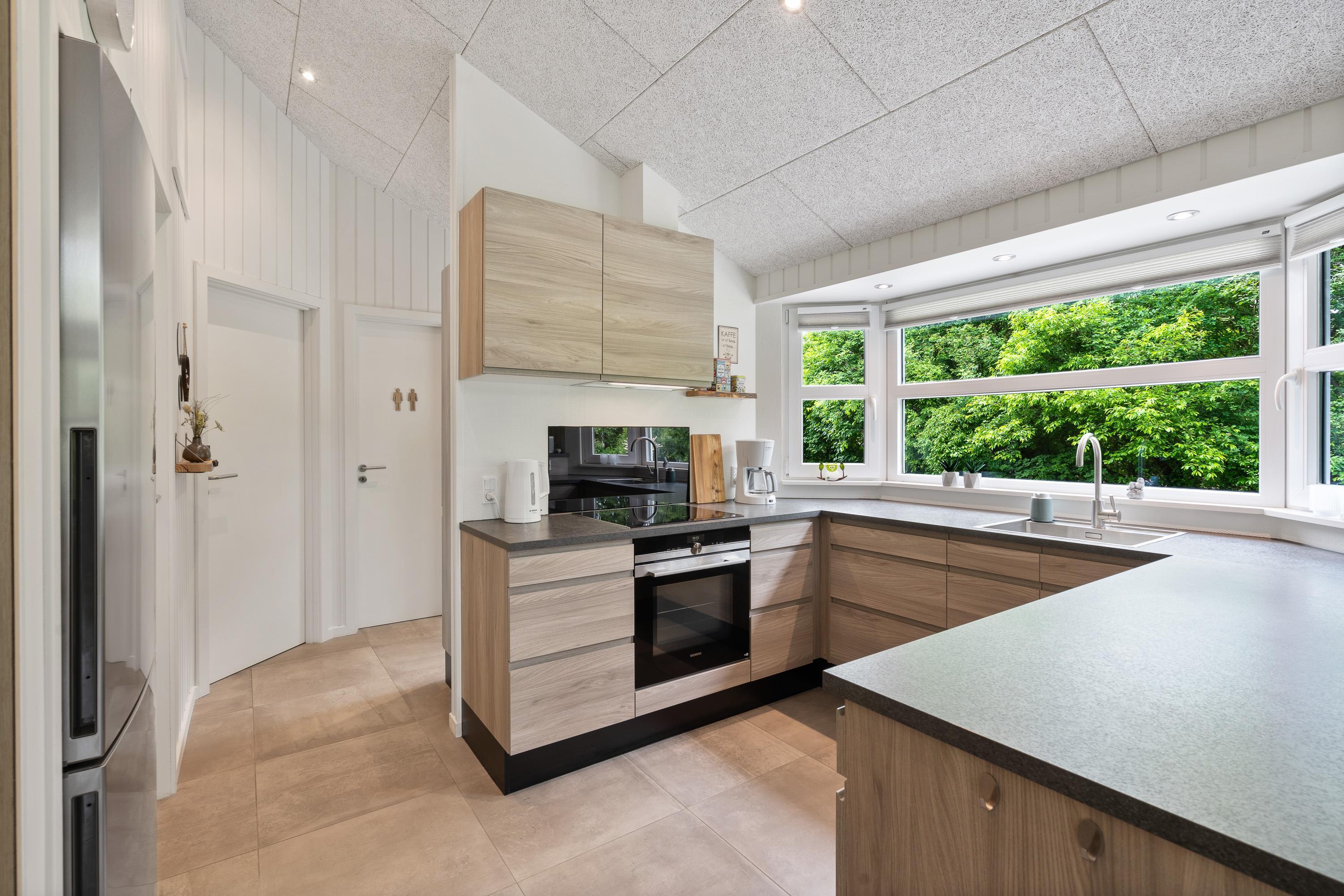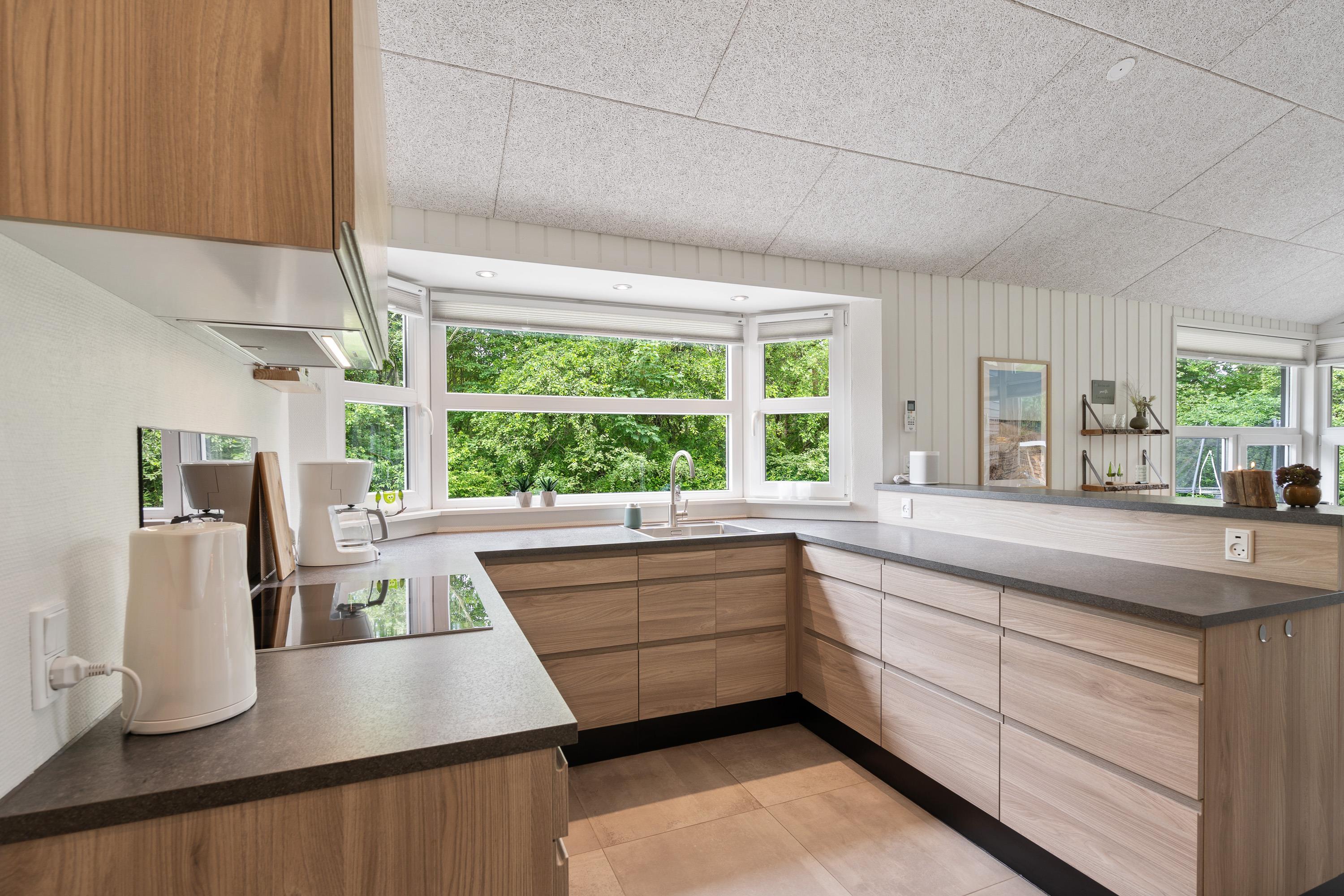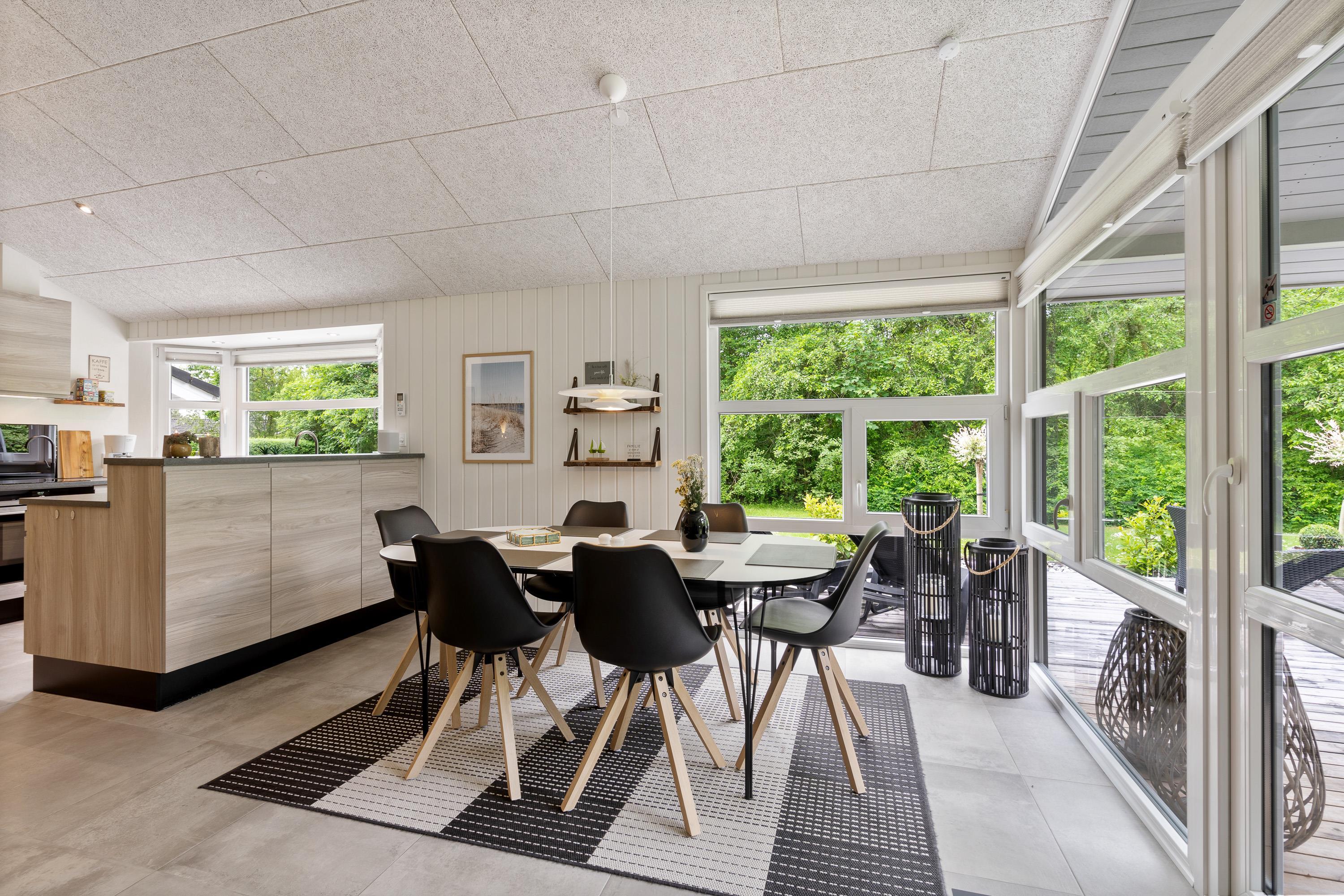 Kernen i sommerhuset er det store, lækre køkkenalrum kombineret med stuen. Hele rummet er flisebelagt og har gulvvarme, så I kommer ikke til at fryse om fødderne. Det åbne køkken gør, at I kan holde et øje med børnene, mens I tilbereder noget lækkert mad. Opvaskemaskinen sørger for, at der hurtigt kan ryddes op og frigiver mere tid til afslapning og hygge med børnene.