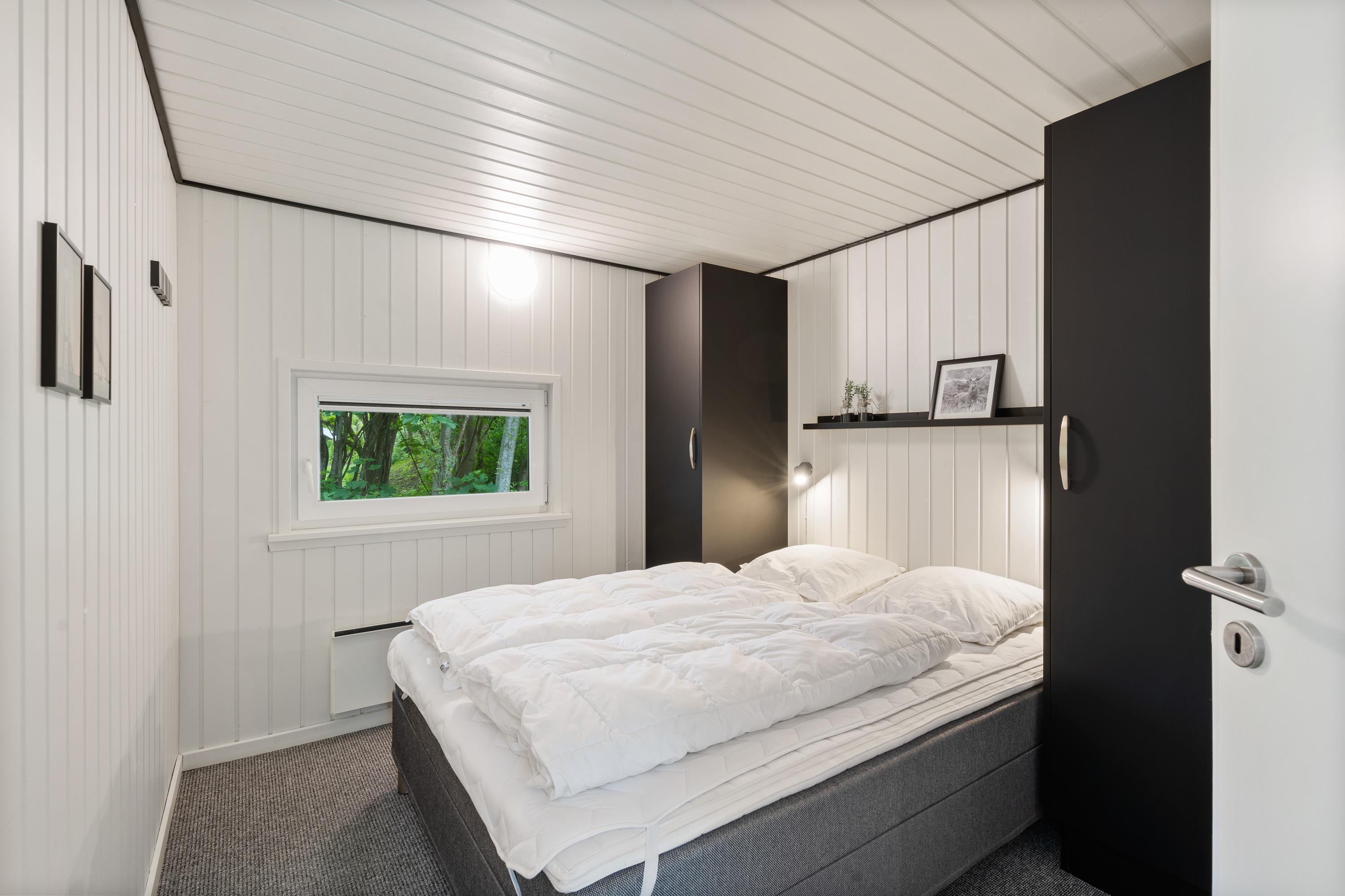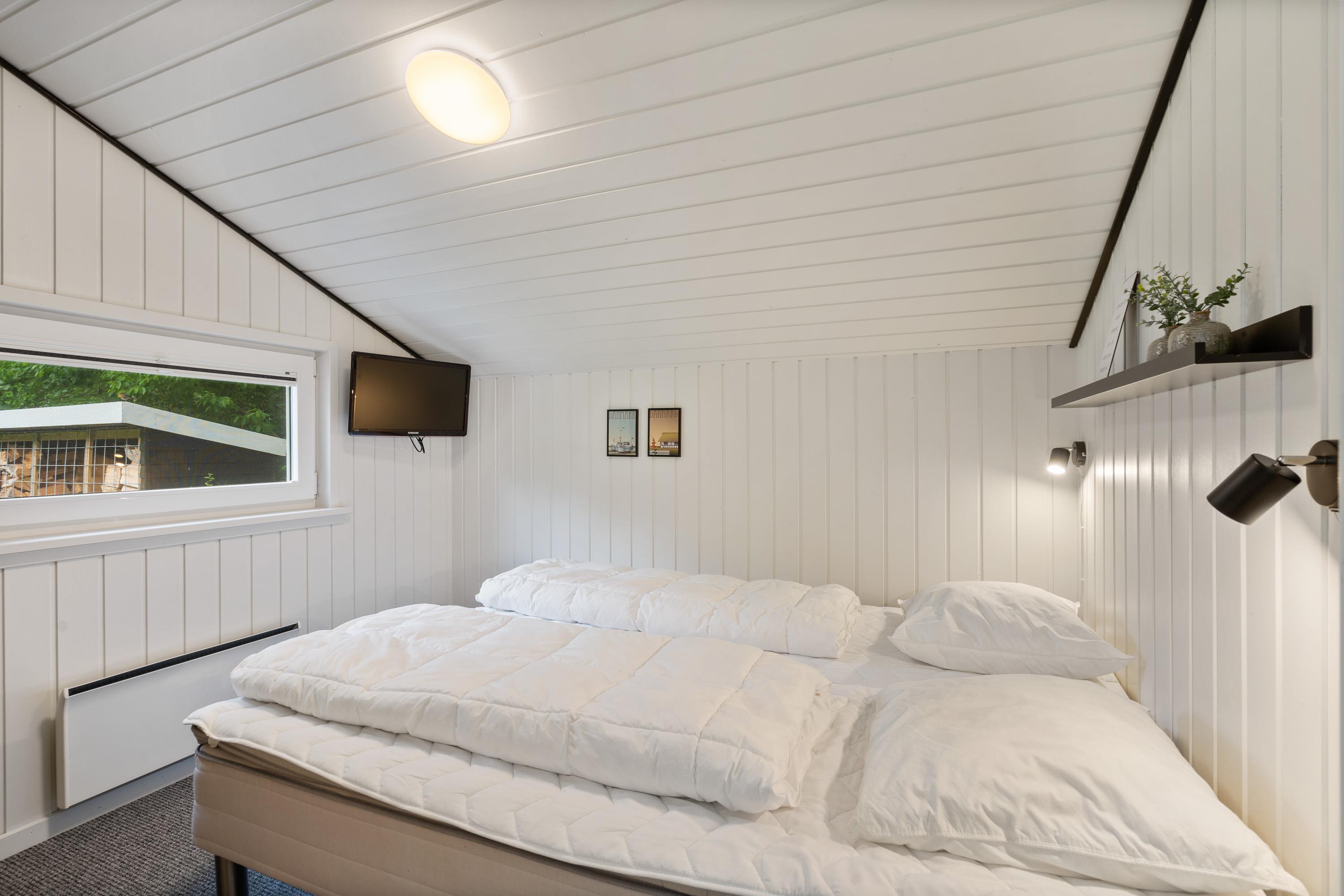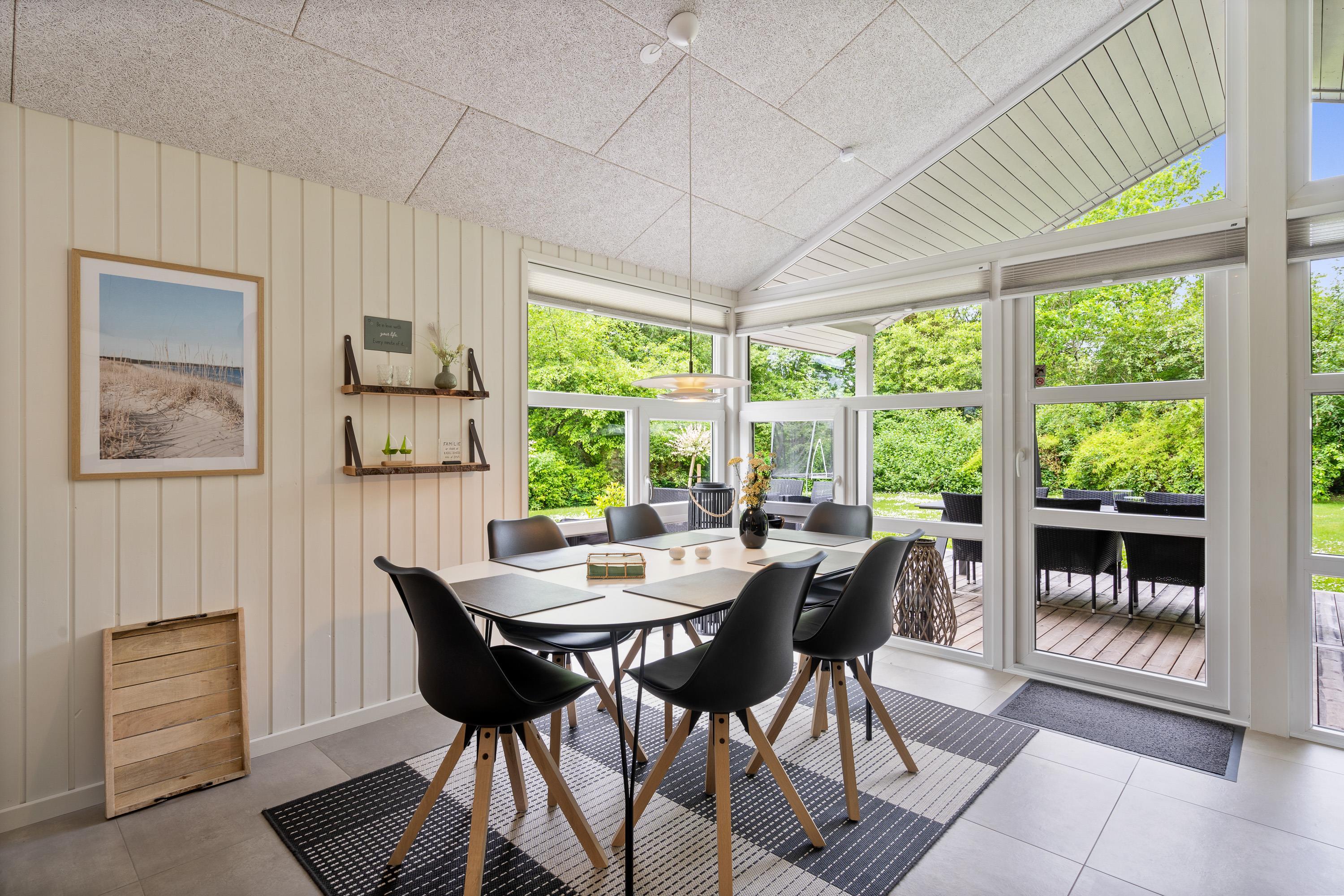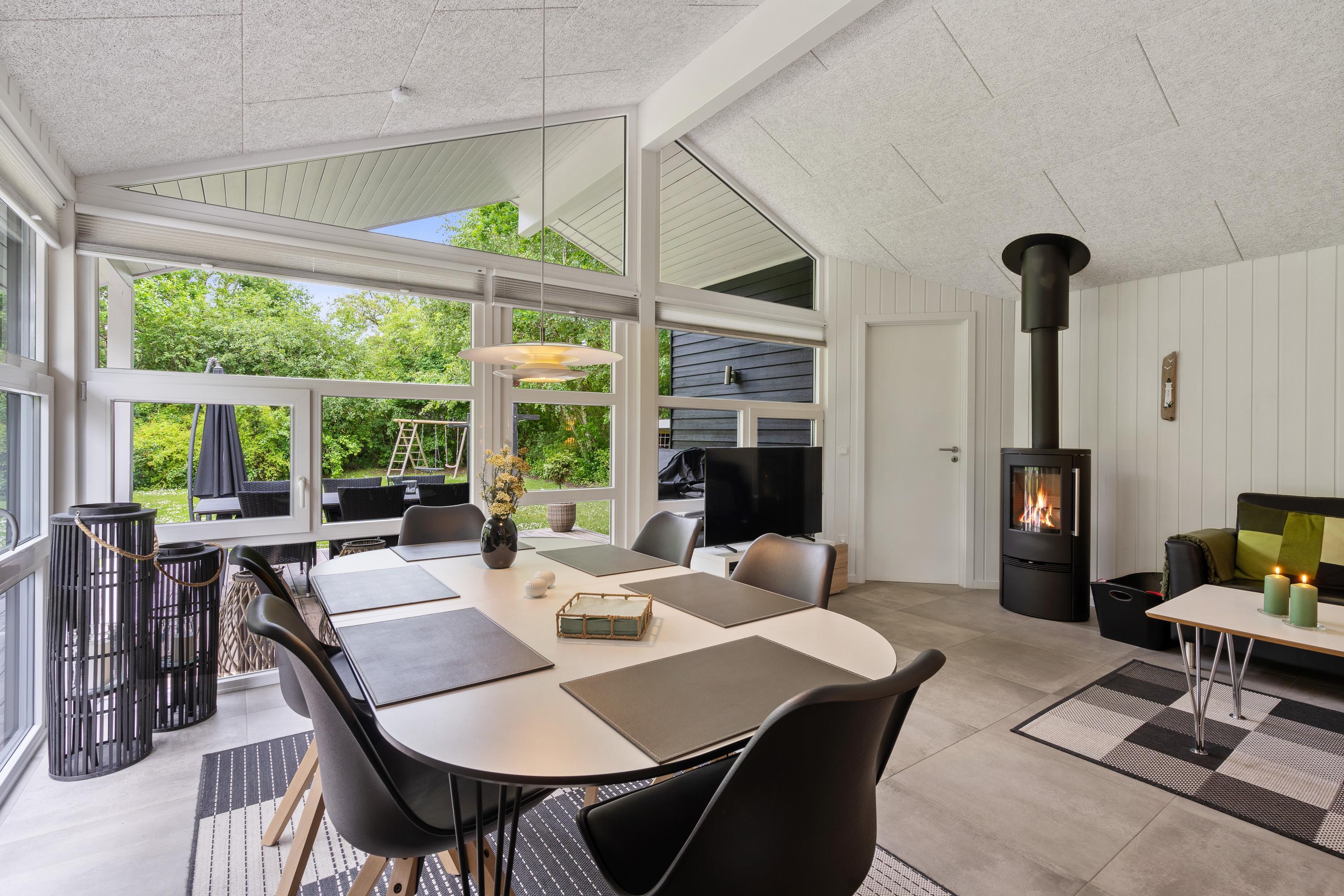 Kernen i sommerhuset er det store, lækre køkkenalrum kombineret med stuen. Hele rummet er flisebelagt og har gulvvarme, så I kommer ikke til at fryse om fødderne. Det åbne køkken gør, at I kan holde et øje med børnene, mens I tilbereder noget lækkert mad. Opvaskemaskinen sørger for, at der hurtigt kan ryddes op og frigiver mere tid til afslapning og hygge med børnene.