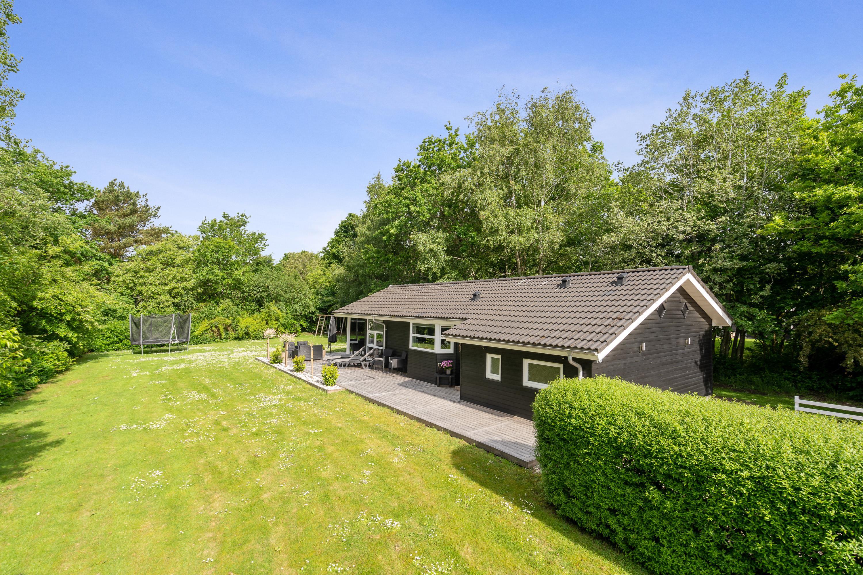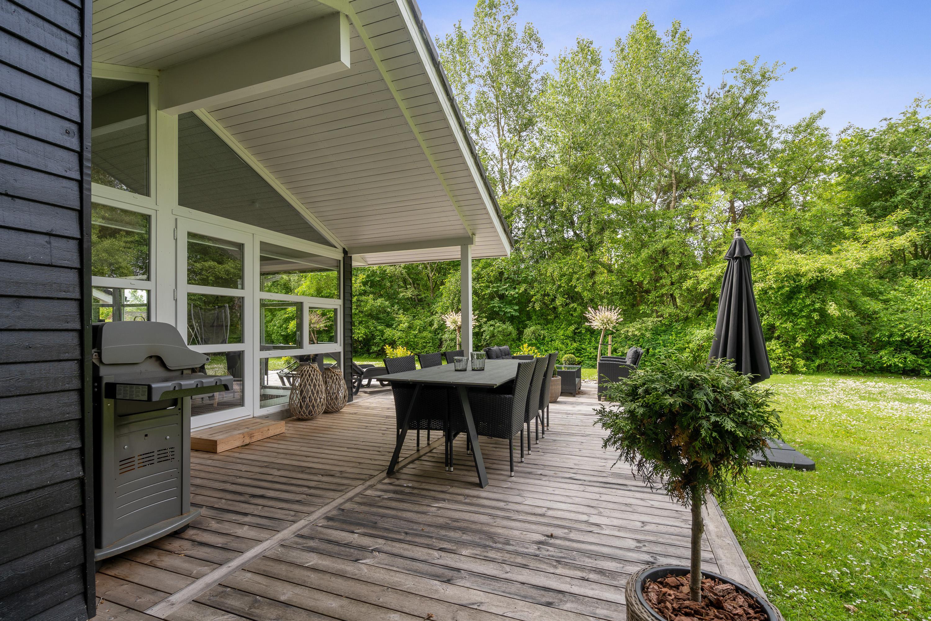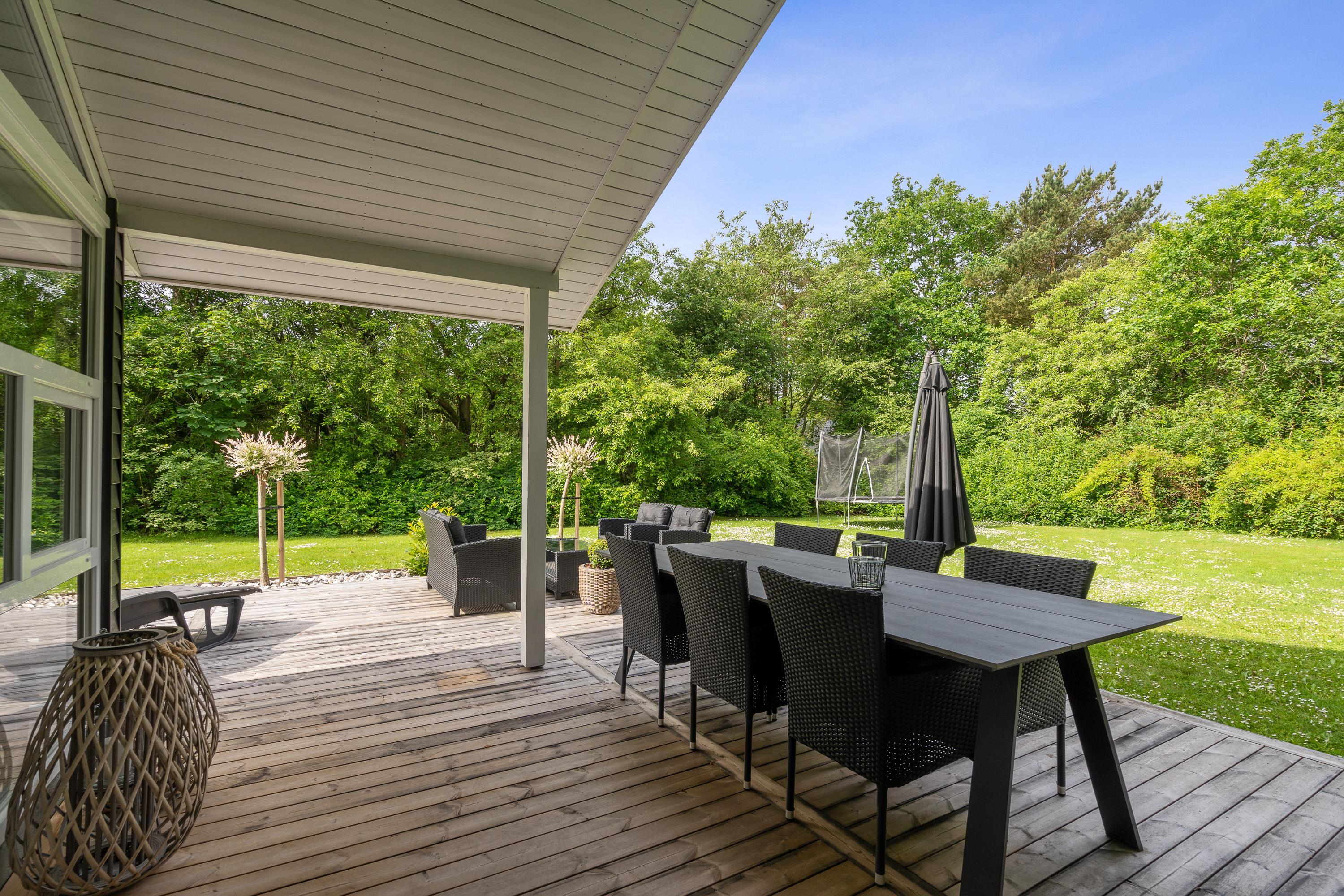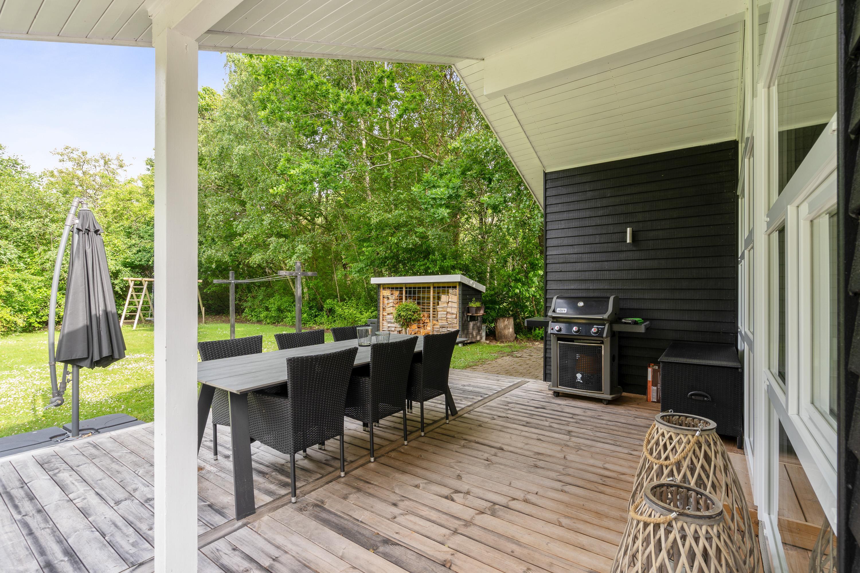 Hele udeområdet ved feriehuset fremstår yderst velplejet, og også her fornemmer I, at der er blevet kræset for detaljerne. Der er masser af hyggekroge på terrassen, hvoraf en del af terrassen er overdækket, så I har mulighed for at gå i læ for solen, hvis det skulle være nødvendigt. Der er masser af lækre havemøbler, I kan slynge jer i, og I har et godt overblik over haven, så I nemt kan holde øje med børnene, som kan slå sig løs på gyngen eller en gang boldspil, som den store plænegrund lægger op til.
