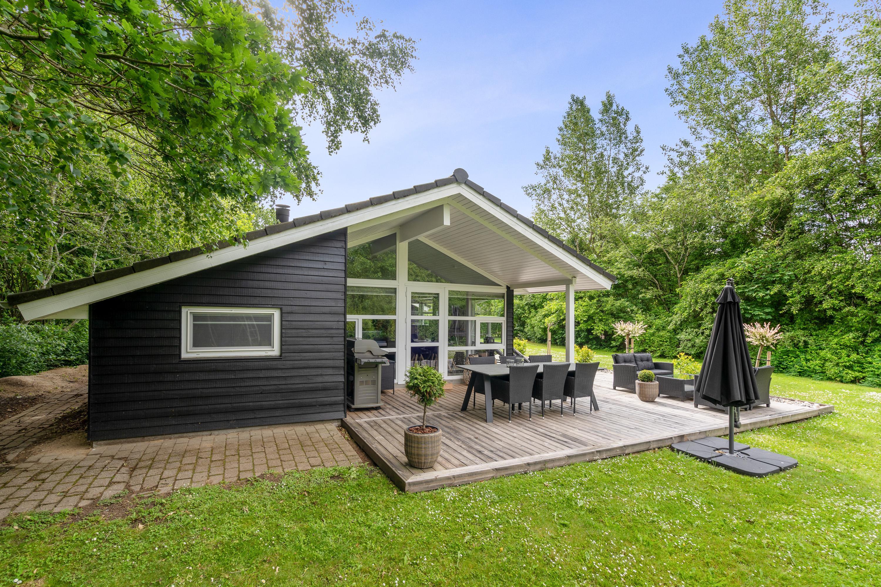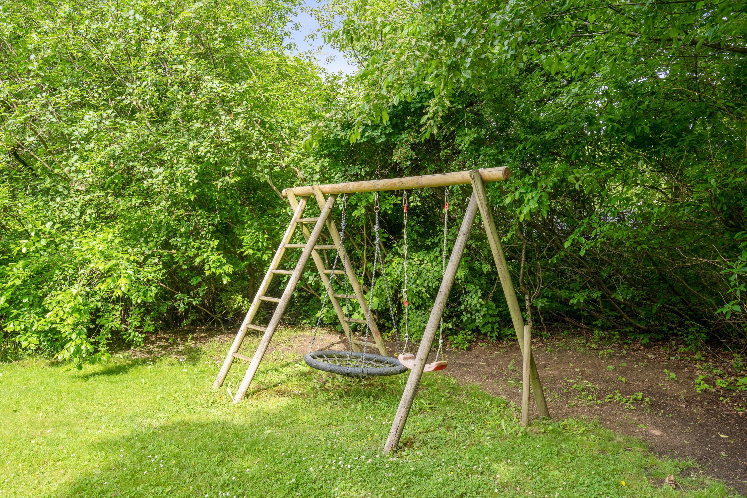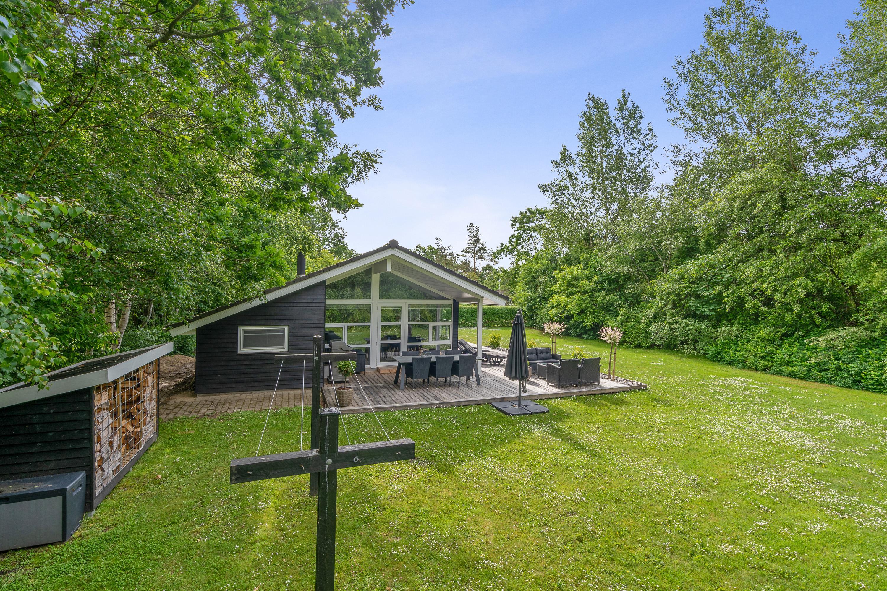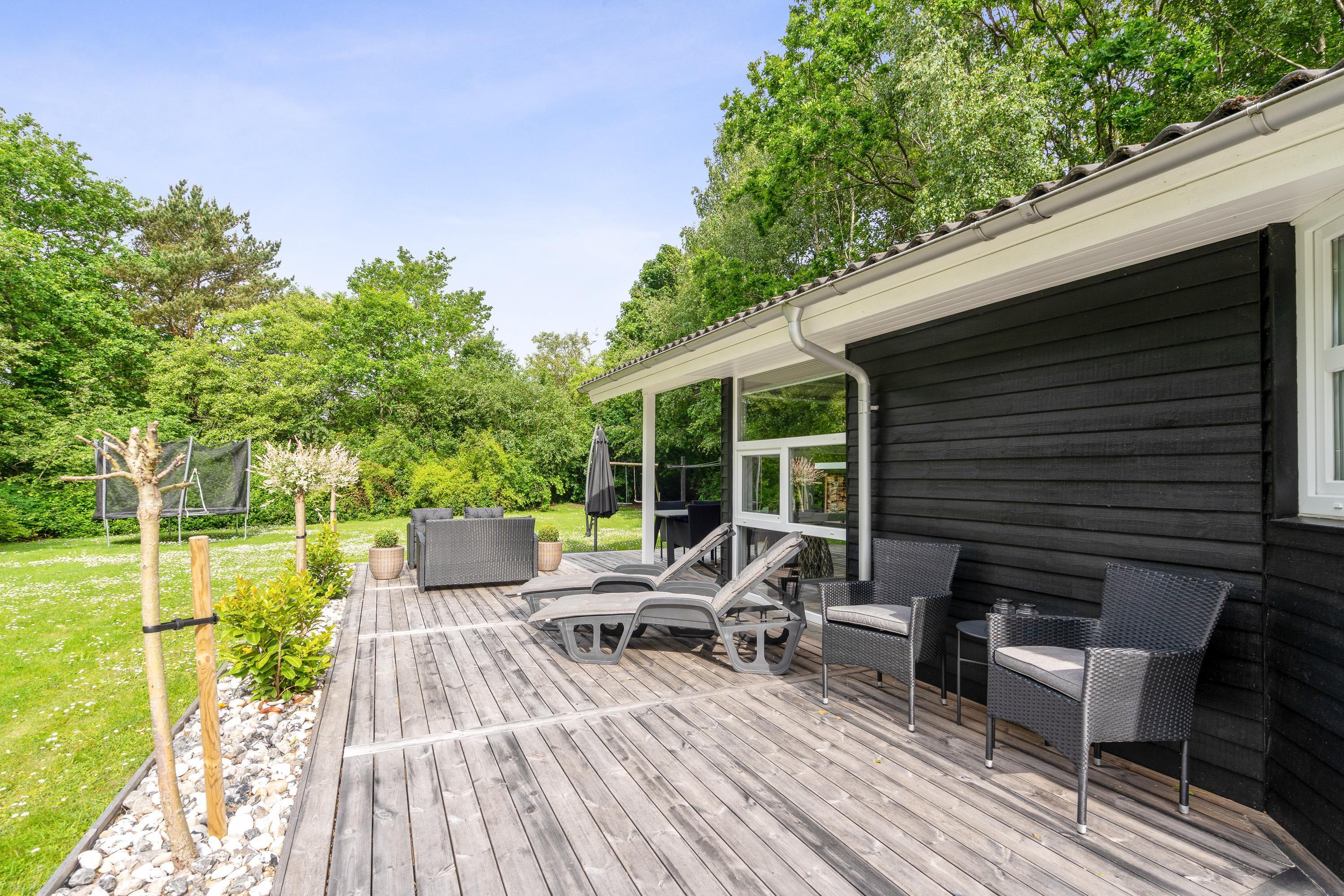 Hele udeområdet ved feriehuset fremstår yderst velplejet, og også her fornemmer I, at der er blevet kræset for detaljerne. Der er masser af hyggekroge på terrassen, hvoraf en del af terrassen er overdækket, så I har mulighed for at gå i læ for solen, hvis det skulle være nødvendigt. Der er masser af lækre havemøbler, I kan slynge jer i, og I har et godt overblik over haven, så I nemt kan holde øje med børnene, som kan slå sig løs på gyngen eller en gang boldspil, som den store plænegrund lægger op til.