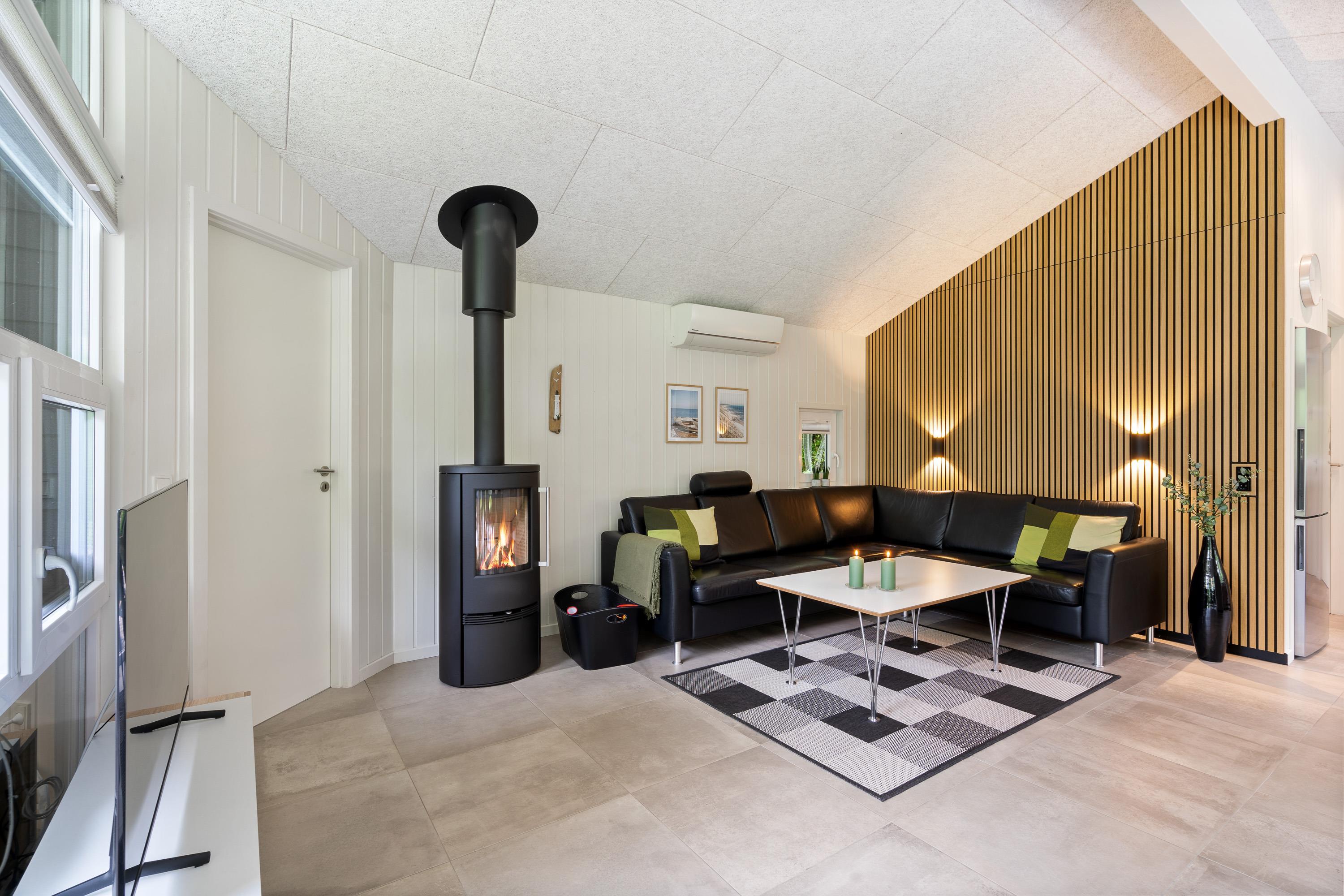 I kan vælge at varme sommerhuset op med enten den energibesparende varmepumpe eller den store brændeovn.