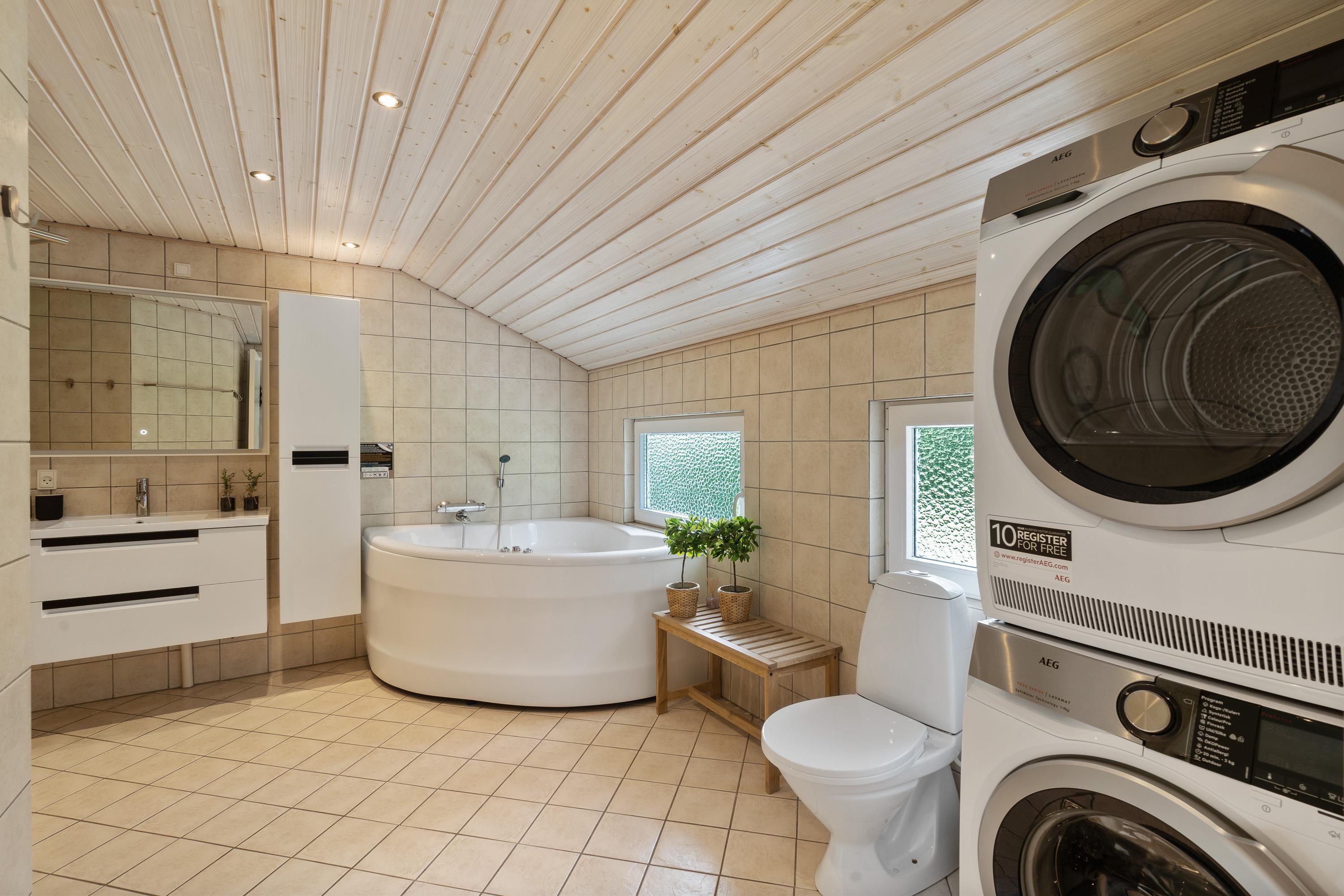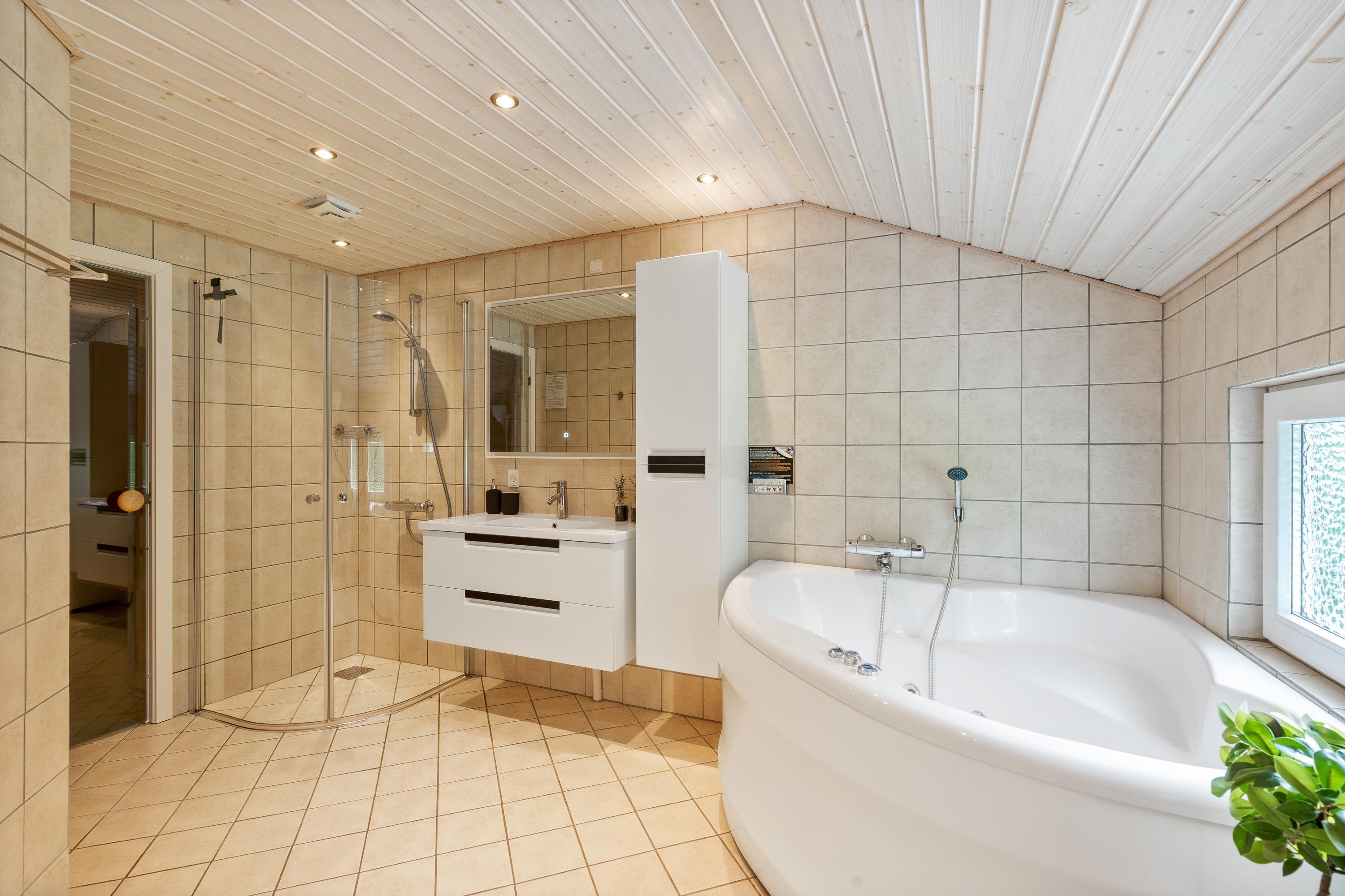 Sommerhuset råder over 2 badeværelser, det ene har spa og sauna. Så trænger I til at få løsnet op i kroppen, er der rig mulighed for det.