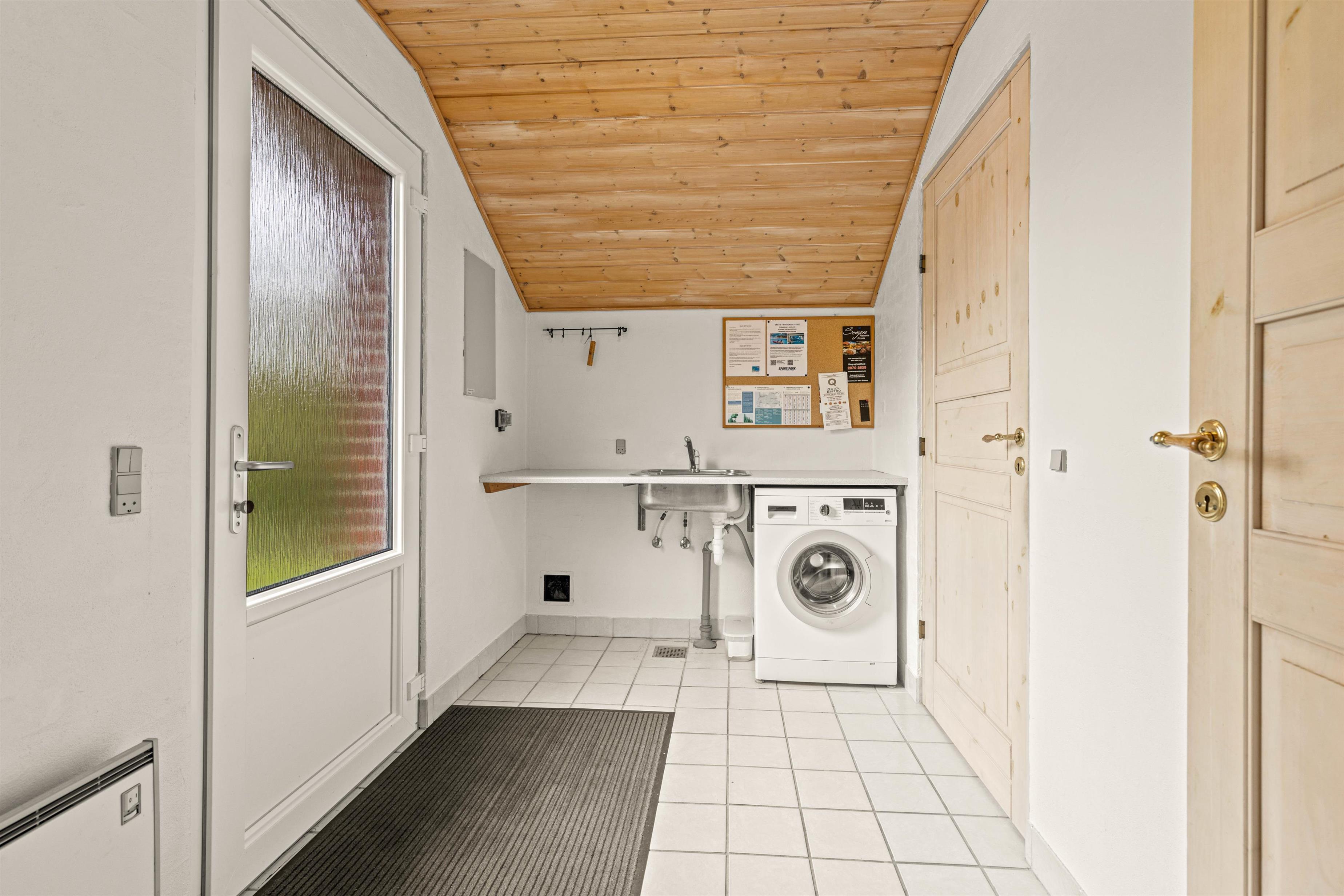 De store vinduer og lyse vægge lader dagslyset strømme ind og giver en fin udsigt over den grønne plænegrund, som omringer huset. Om aftenen kan I nyde brændeovnens varme atmosfære og lade de praktiske opgaver blive ordnet af opvaskemaskinen og vaskemaskinen.
