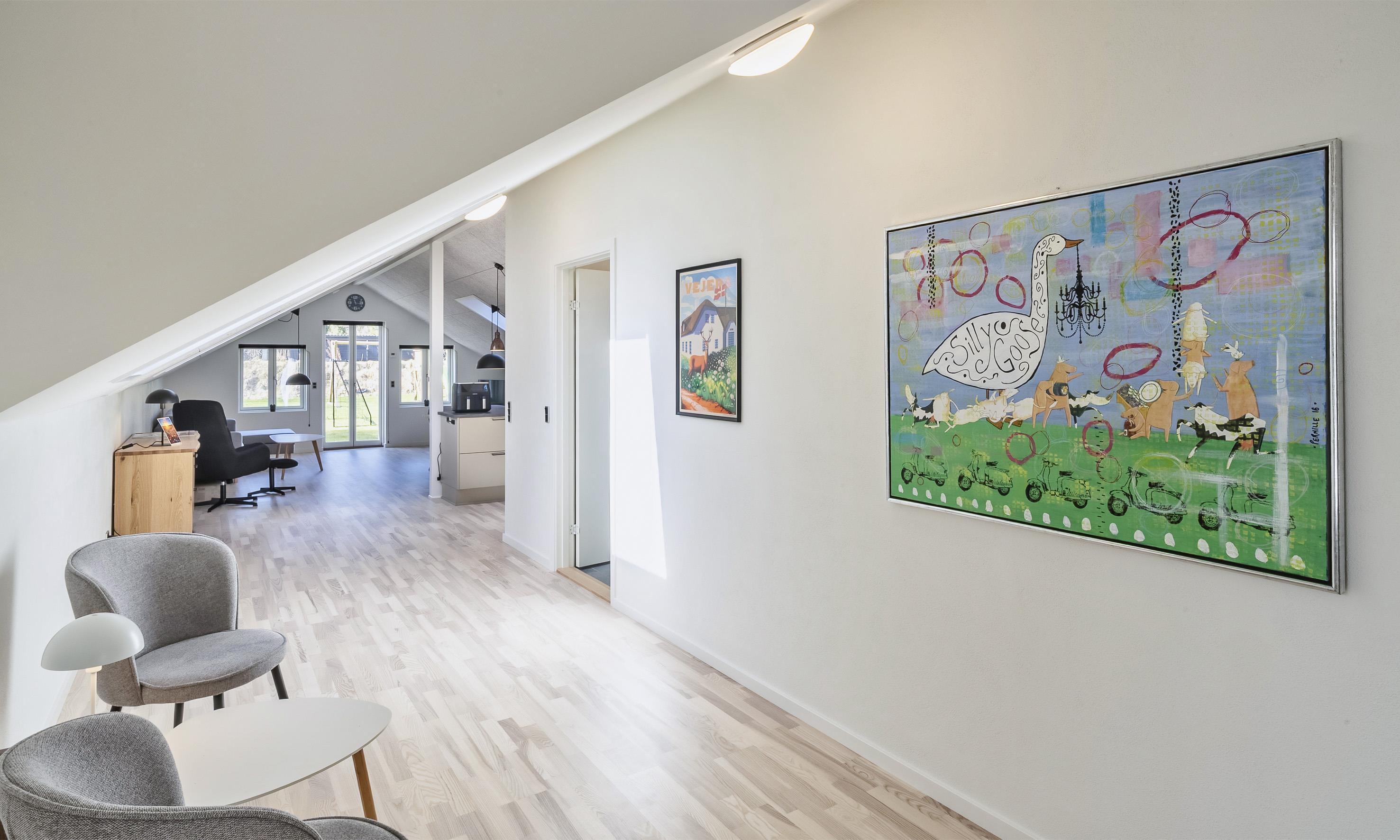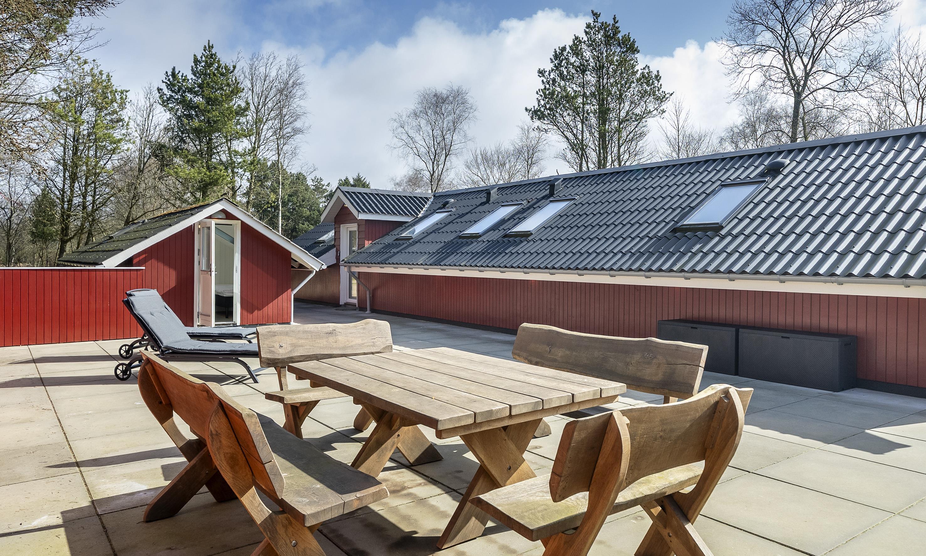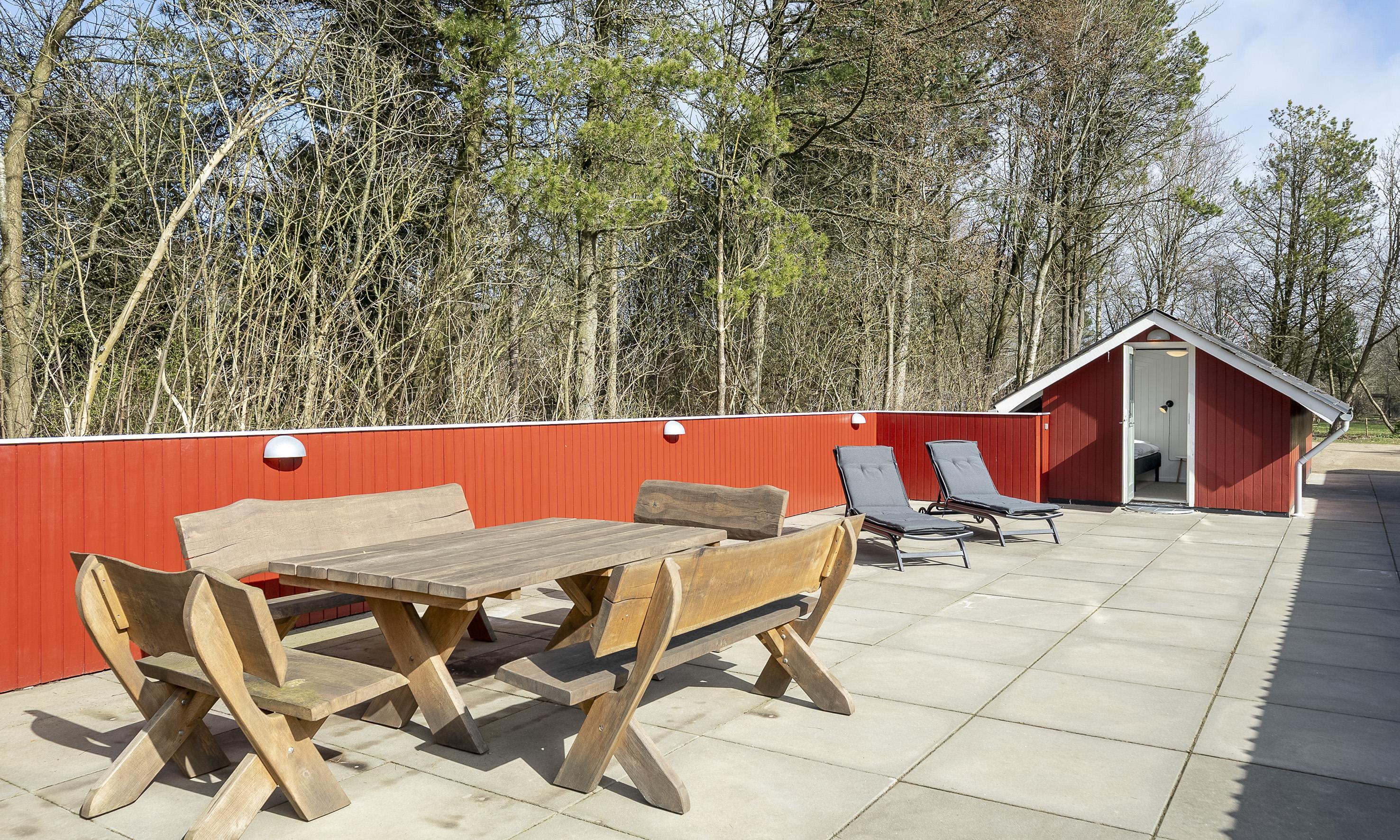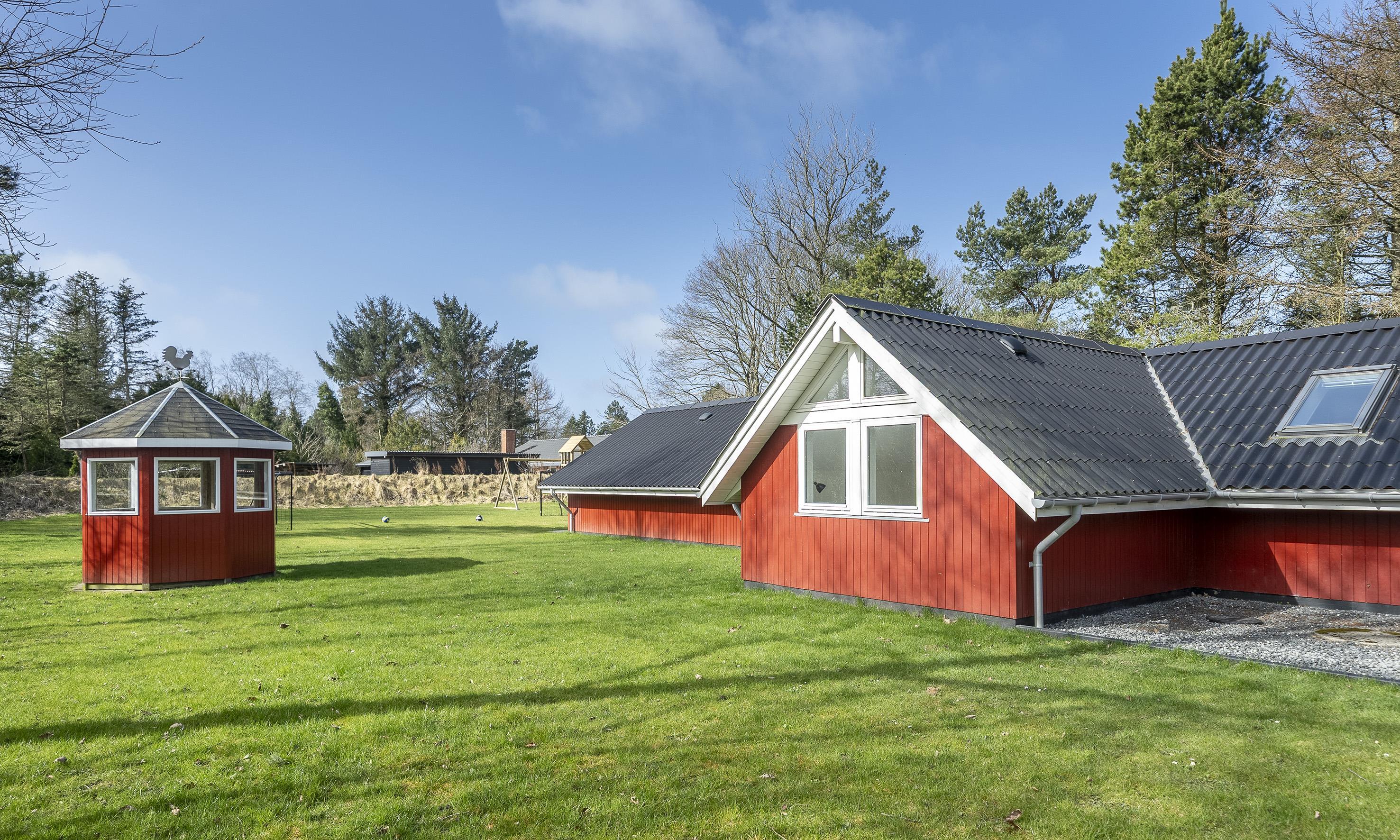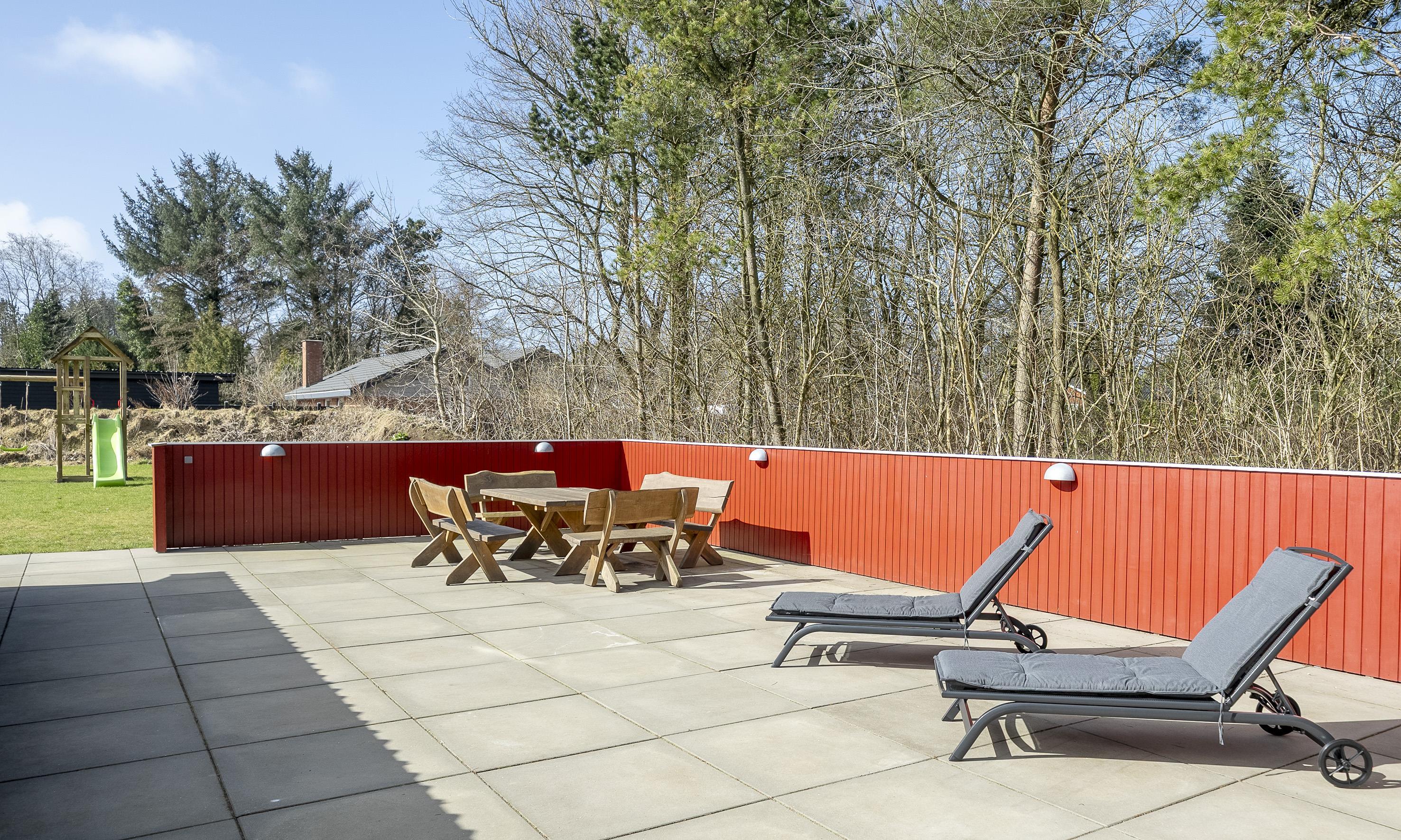 Ved huset er der græsplane med fodboldmål, legetårn, rutsjebane og gynge samt en stor og læfuld flisebelagt terrasse.
